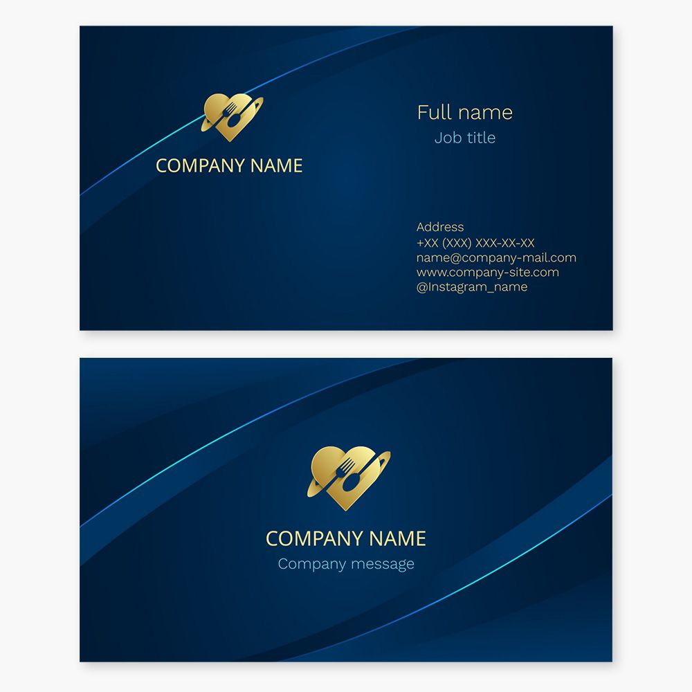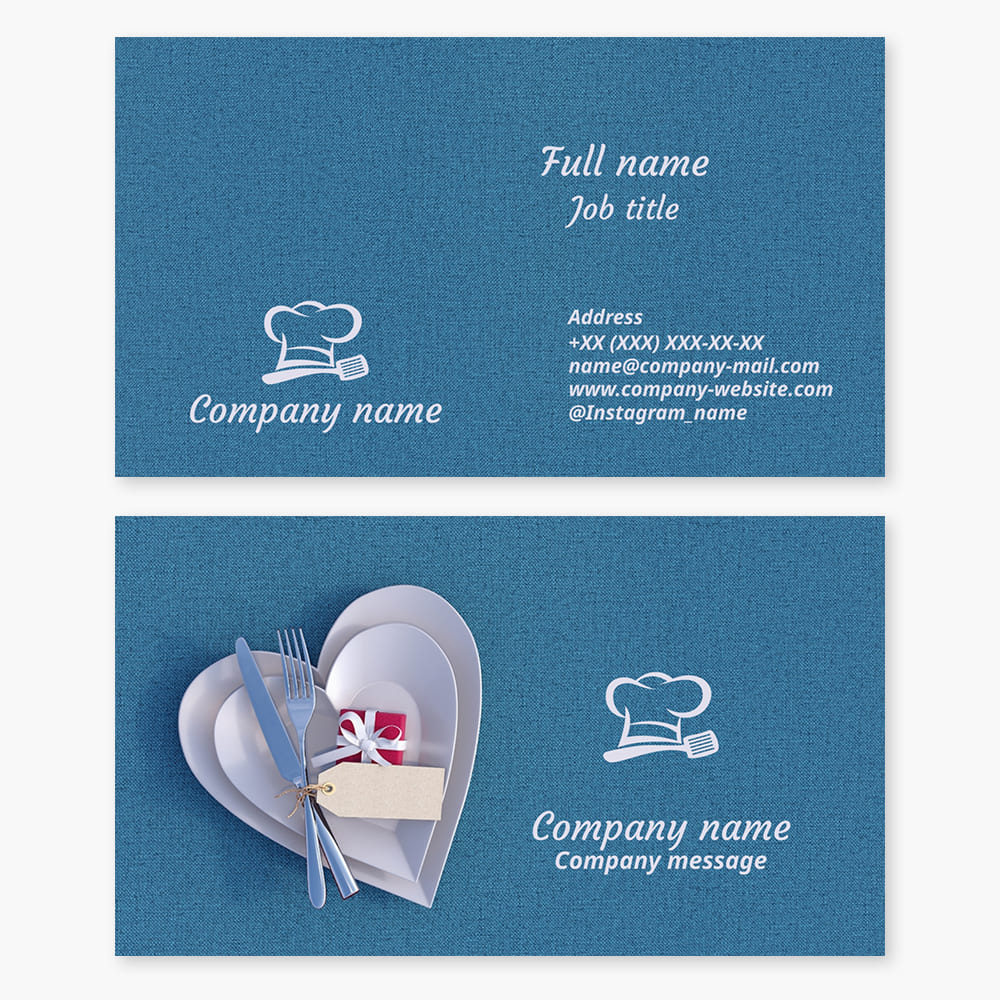 Business card template with a fork, spoon, and heart logo. Restaurant, cafe.