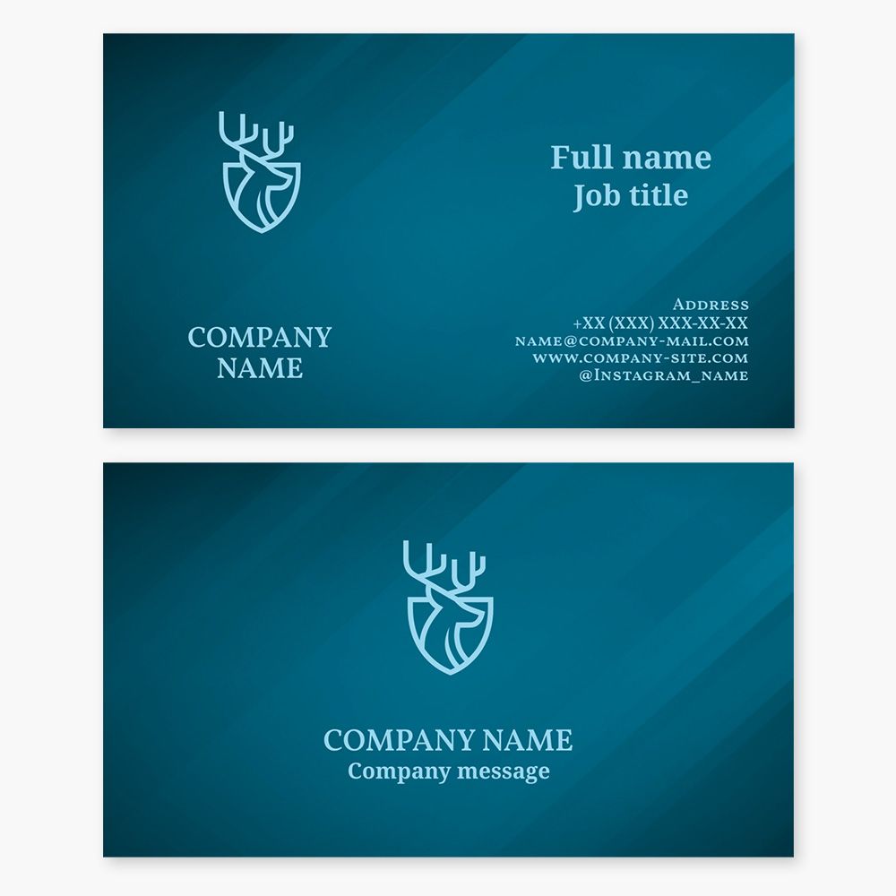 Business card template with a logo, shield, and deer. Hunting club. Forestry. Gamekeeper. Stuffed animal and bird production.