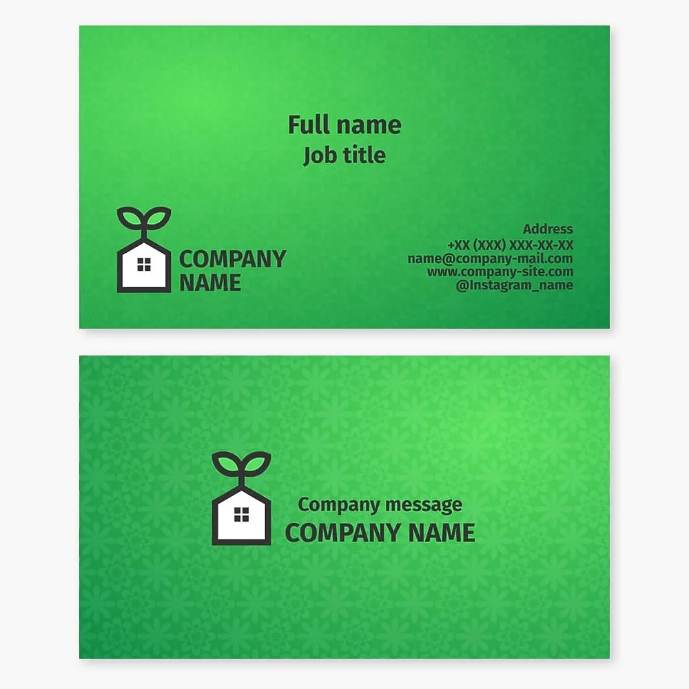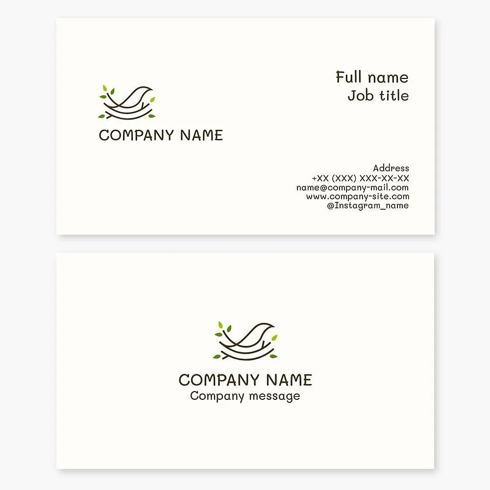 Business card template. Stylized bird's nest with a bird and leaves. Symbolic of home, family, nature, care, and safety. Brand. Real estate, eco-friendly products, children's and family products, landscape design.