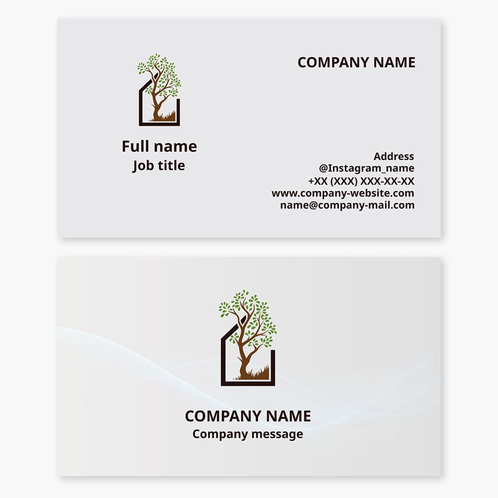 Business card template with Home Tree logo, landscaping, greenery supply.
