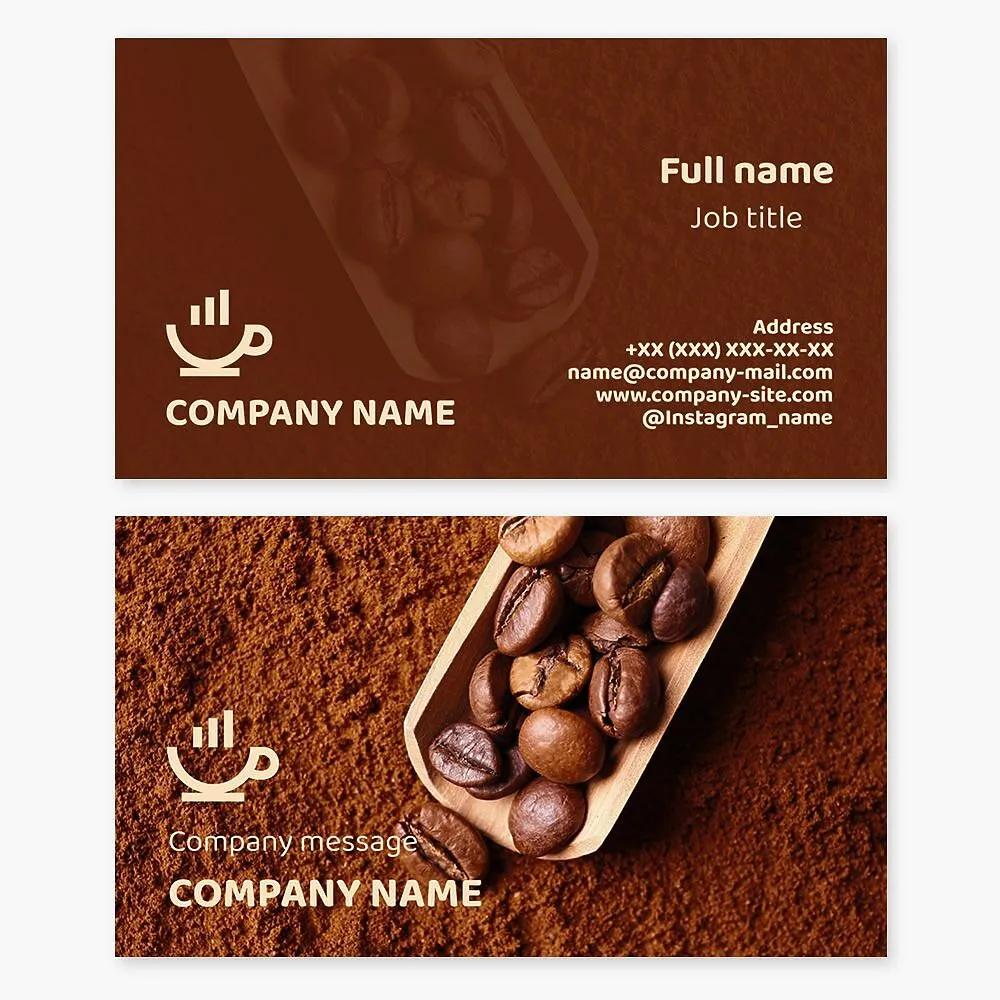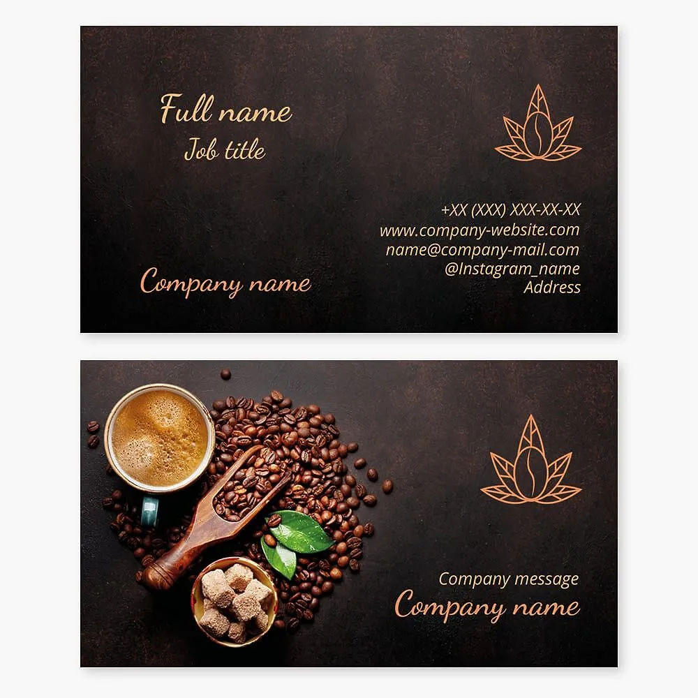 Create a professional and eye-catching business card template with a coffee theme. Impress potential clients and partners with a unique design that reflects your business style and love for coffee. Customize the template to showcase your contact information and make a lasting impression in the corporate world.