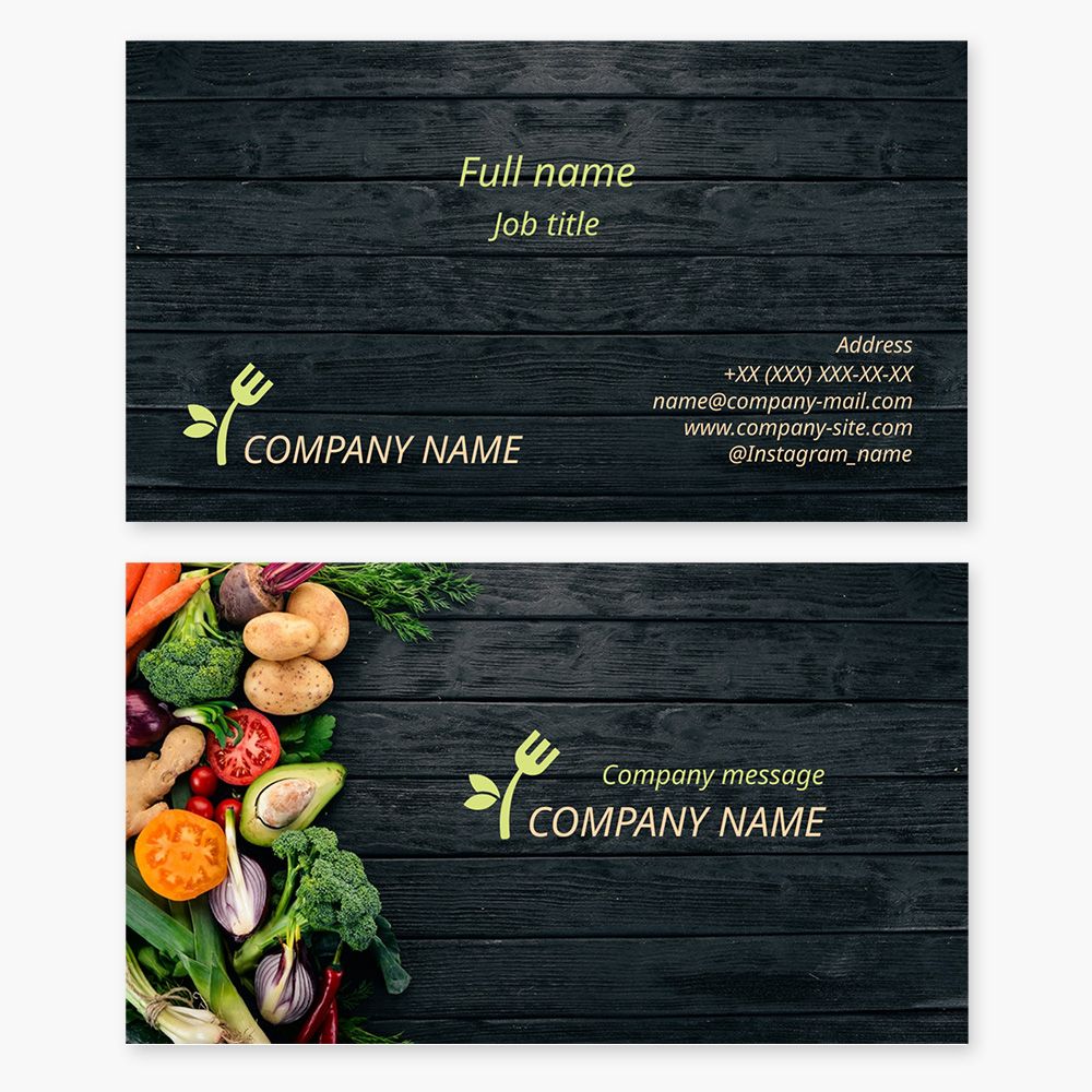 Business card template. Vegan, organic products. Fruits and vegetables. Farm. Fork with plant leaves.