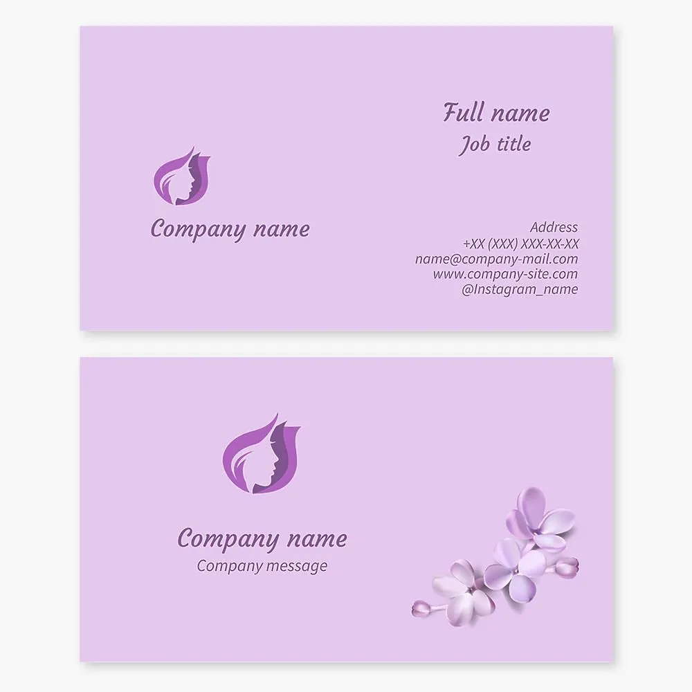 Beauty salon and spa business card template. Female profile, flower bud, and cherry blossom branch.