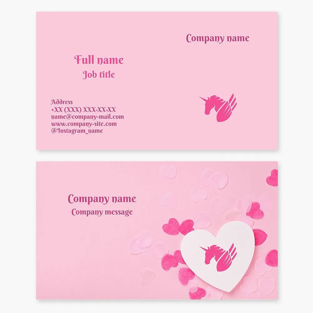 Pink Unicorn Logo | Pink Hearts | Business Card Template. Symbol of purity, innocence, spiritual authority, prudence, kindness, wisdom, healing, divine power, and devoted love. Marriage agency.