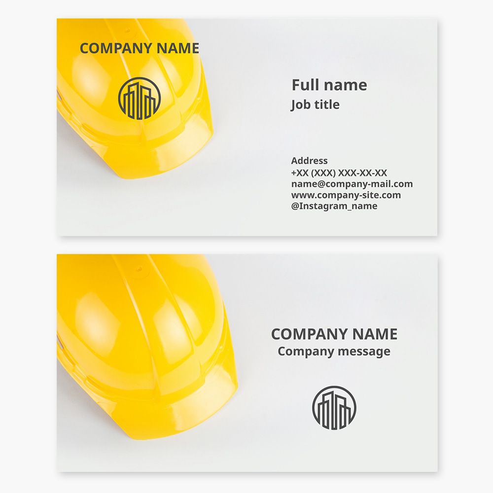 Construction worker business card template. Construction company. Hard hat, skyscrapers. Letter O.