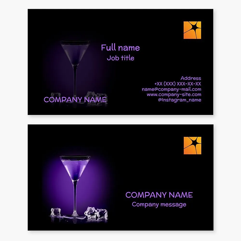 Cocktail bar business card template featuring a bartender. Star, spotlight. Glass, alcohol, ice.