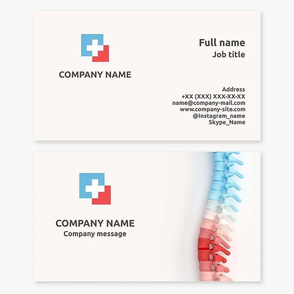 Business card template. Treatment of spinal disorders. Chondroprotectors, physical therapy, massage, manual and therapeutic exercise. Vertebrologist, neurologist, orthopedic traumatologist, neurosurgeon.