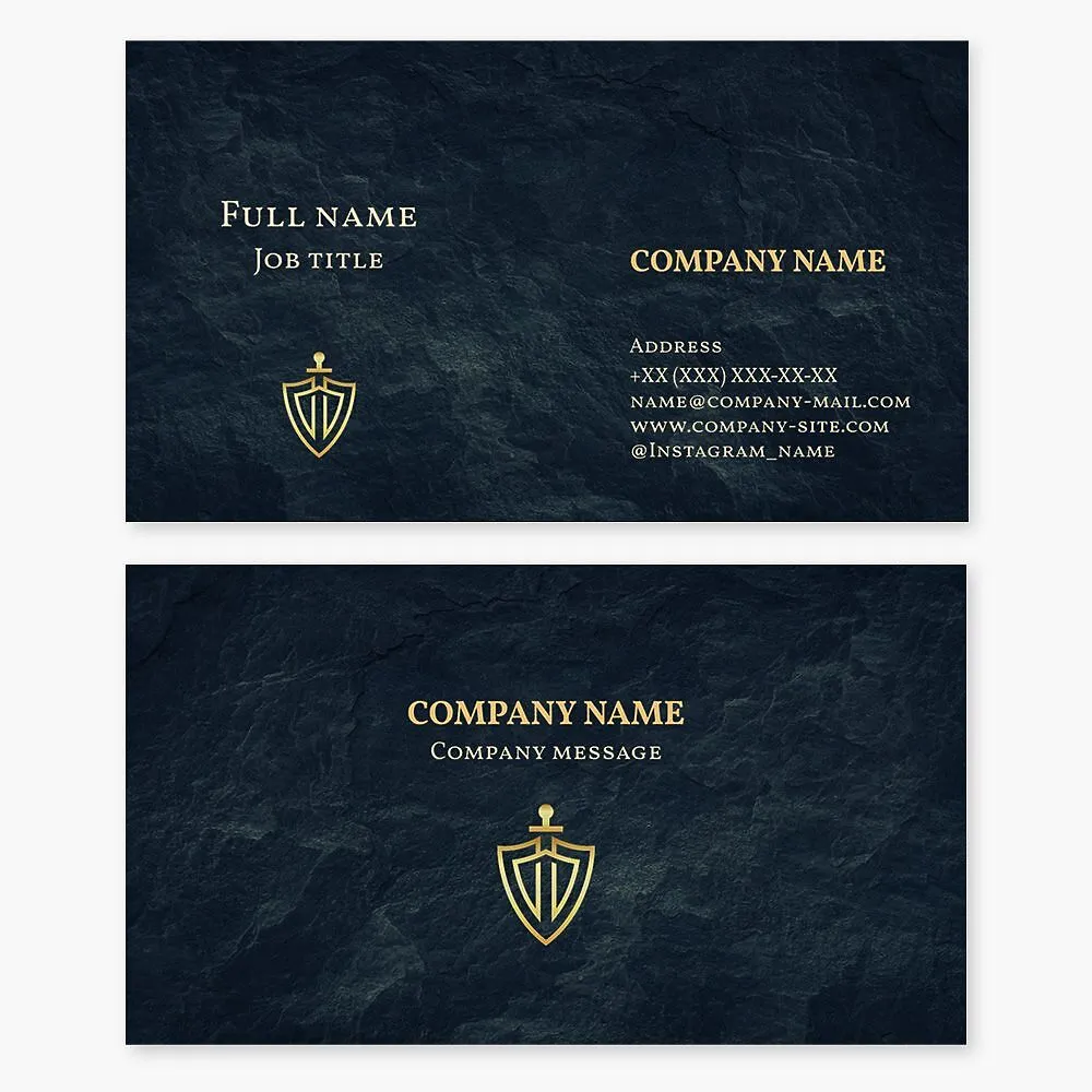Business card template with the "Shield and Sword" logo and stone texture. Security agency. Services for the protection of life, health, and property of individuals and organizations.