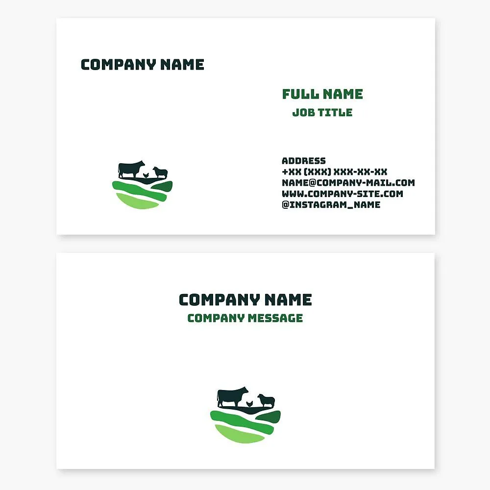 Business card template with a farm logo. Chicken, cow, house. Farmer. | ID200608