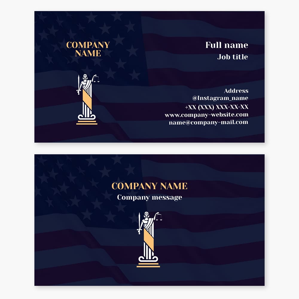 Law firm business card template. Attorney, legal counsel. US flag. Justice.