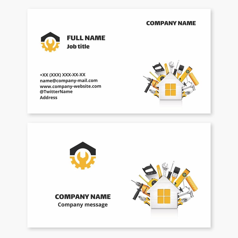 Handyman business card template. Open-end wrench, hammer, paintbrush. Plaster background. Appliance and home repair.