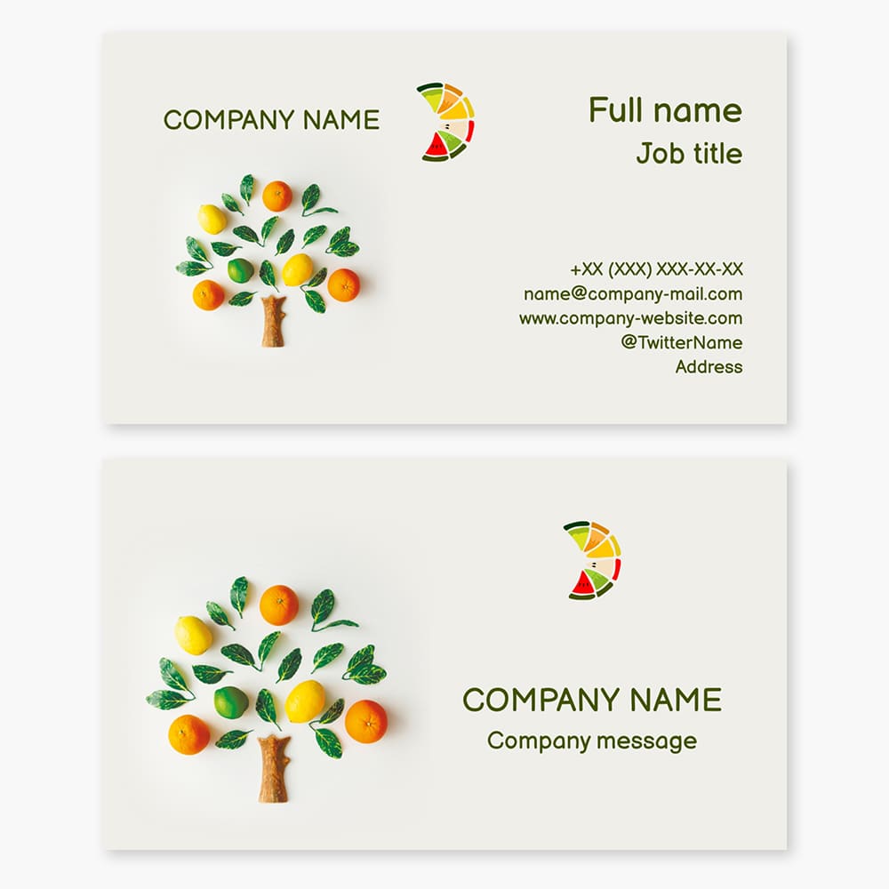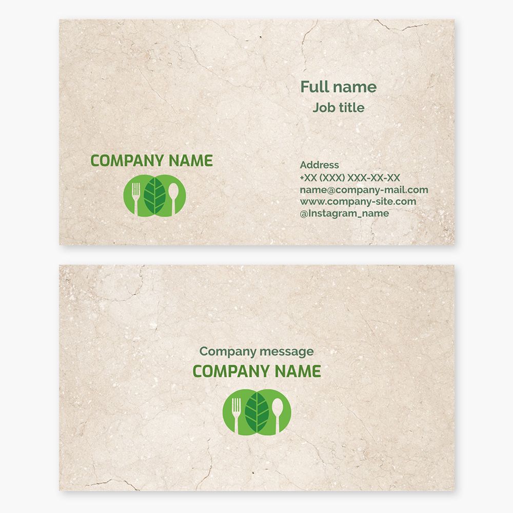 Healthy Eating business card template. Cafe, restaurant. Vegan cuisine. Plant leaf, spoon, and fork.