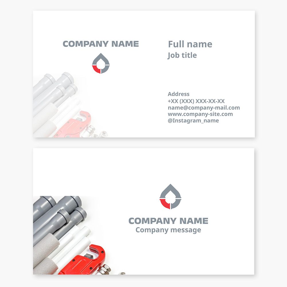 Business card template. Plumbing equipment, materials, tools. Plumber. Metal-plastic pipes, water drop.