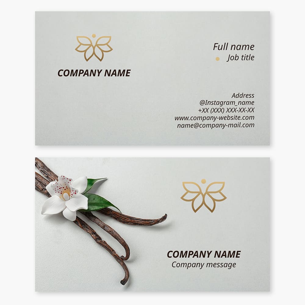 Vanilla business card template. Flower, butterfly, spices. Symbol of coziness, comfort, joy.