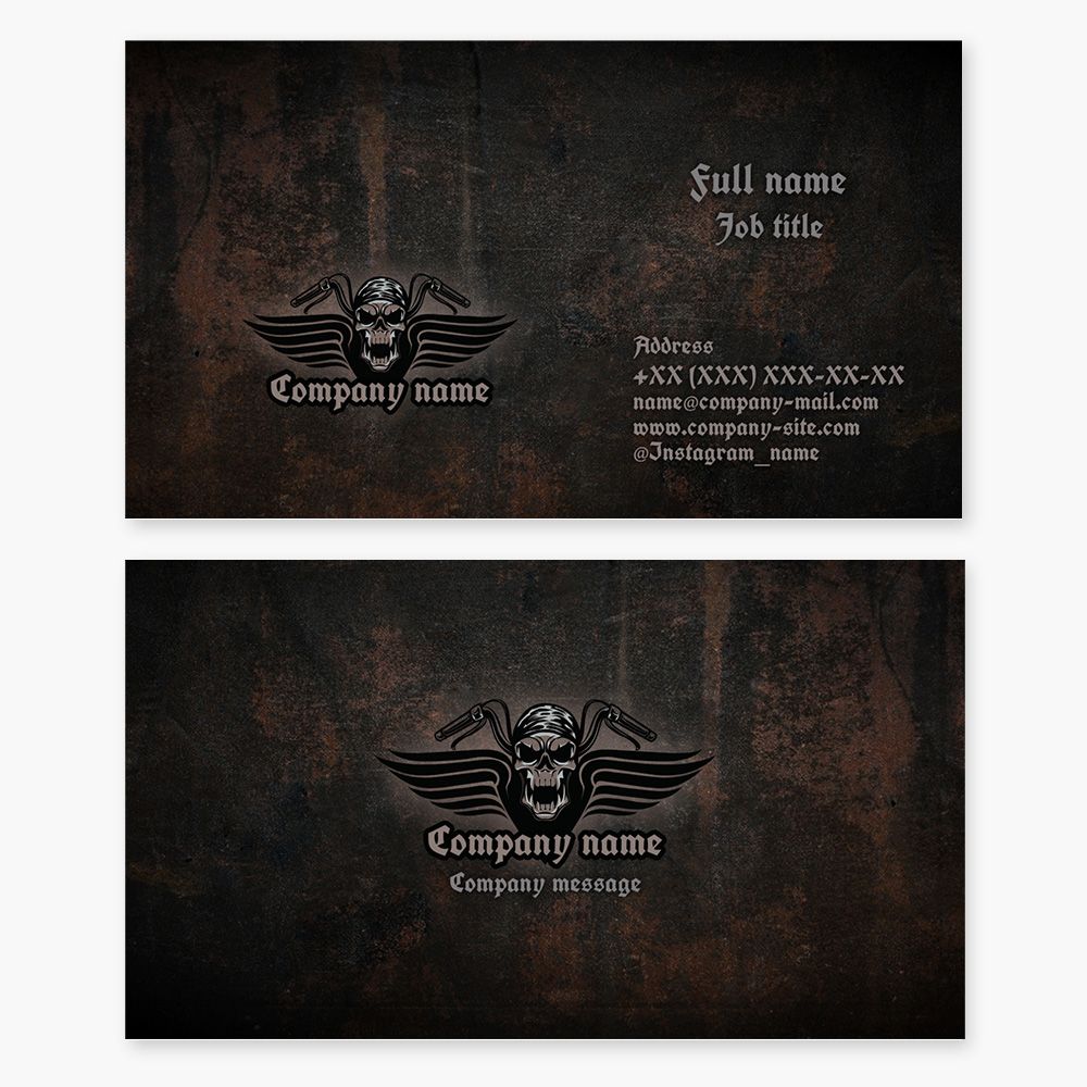 Business card template with the "Biker Skull" logo. Bandana, fenders, and motorcycle handlebars.