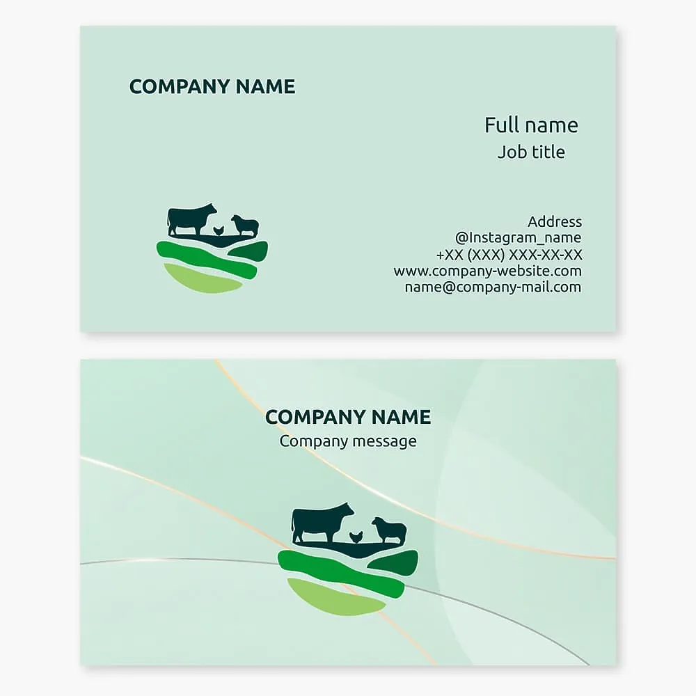 Business card template for a farm. Green meadows, cow, sheep, and chicken.