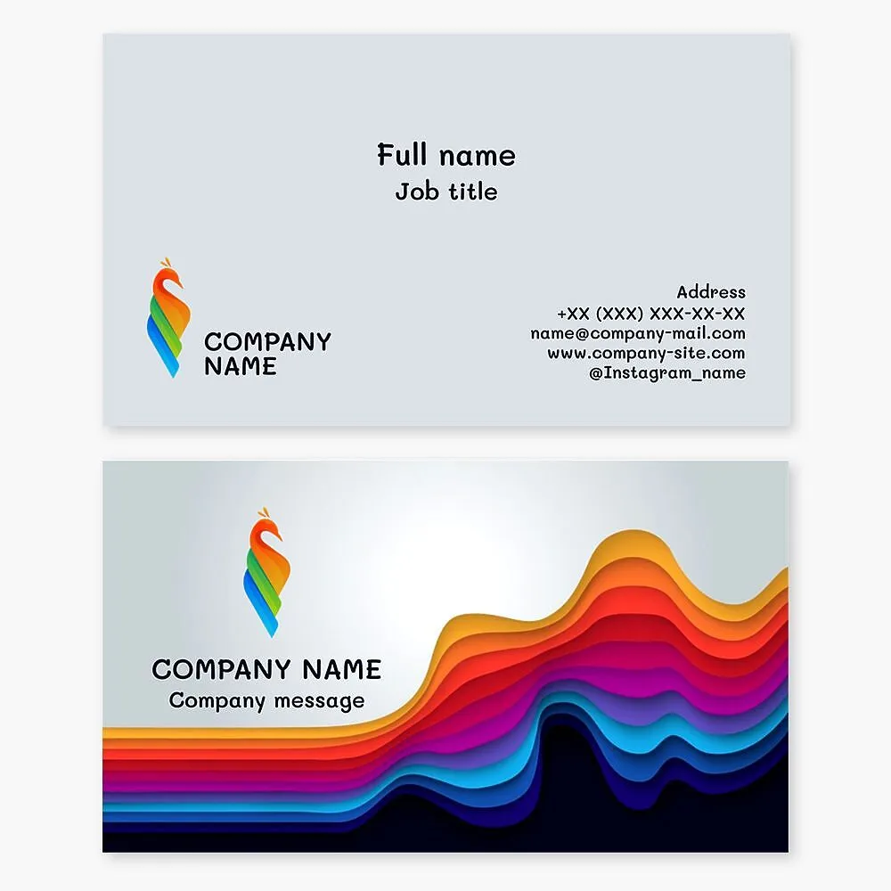 Business card template with a colorful peacock logo. Art studio. Exhibition center. Art gallery. Design studio.