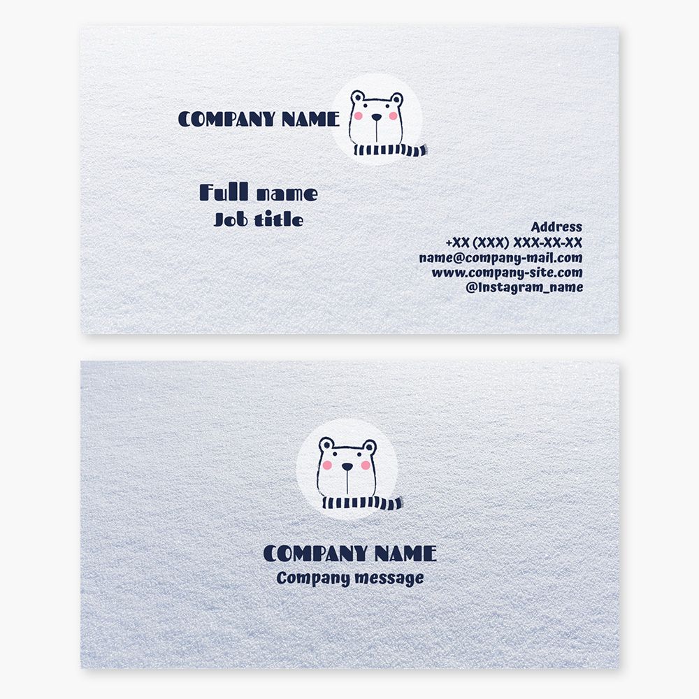 A children's-style business card template featuring the "Polar Bear in a Scarf" logo. A children's sports club offering winter sports. Winter clothing for children. Crochet and knitted items.
