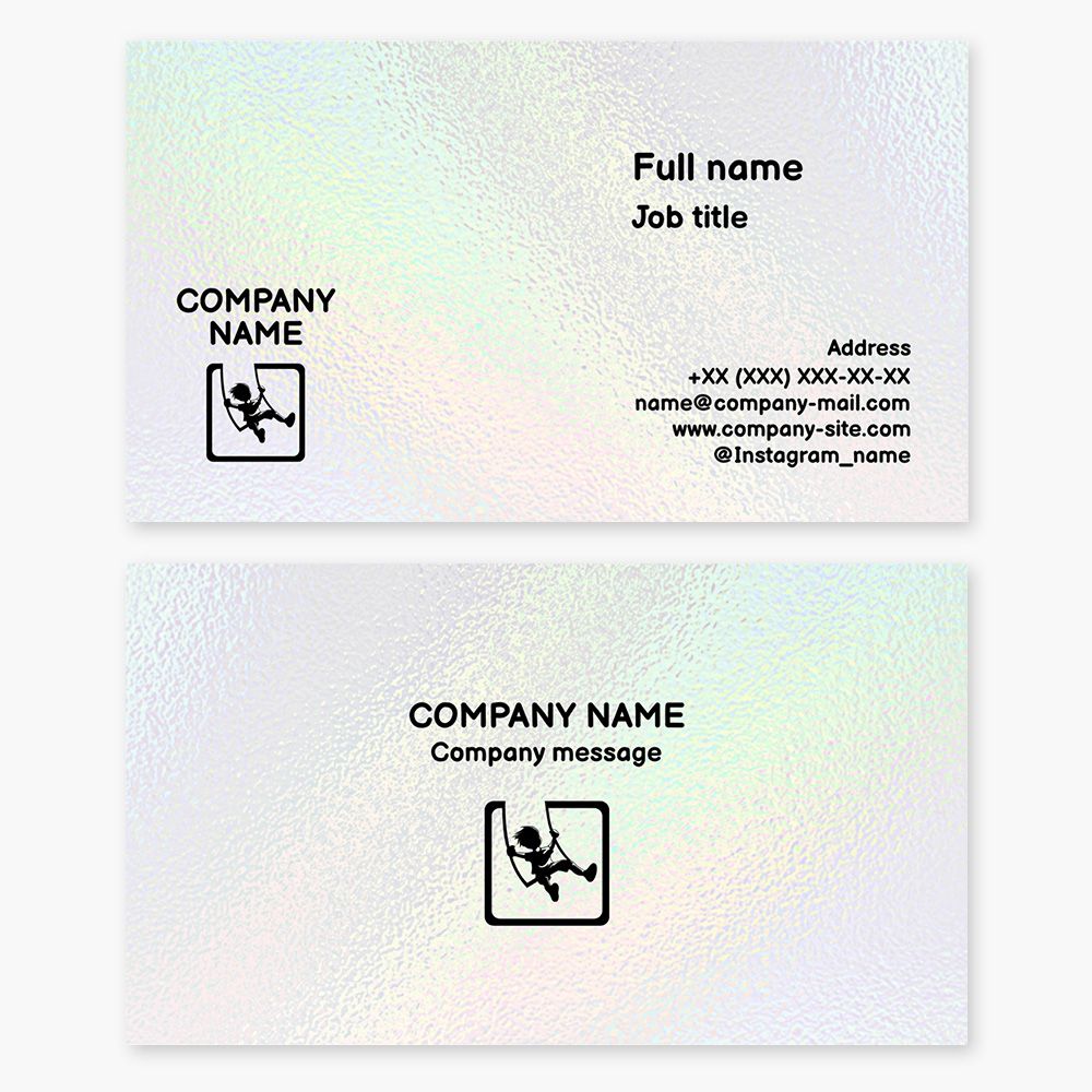 Swing business card template. A swing with a child, square. We manufacture swings, carousels, playgrounds, and children's park infrastructure.
