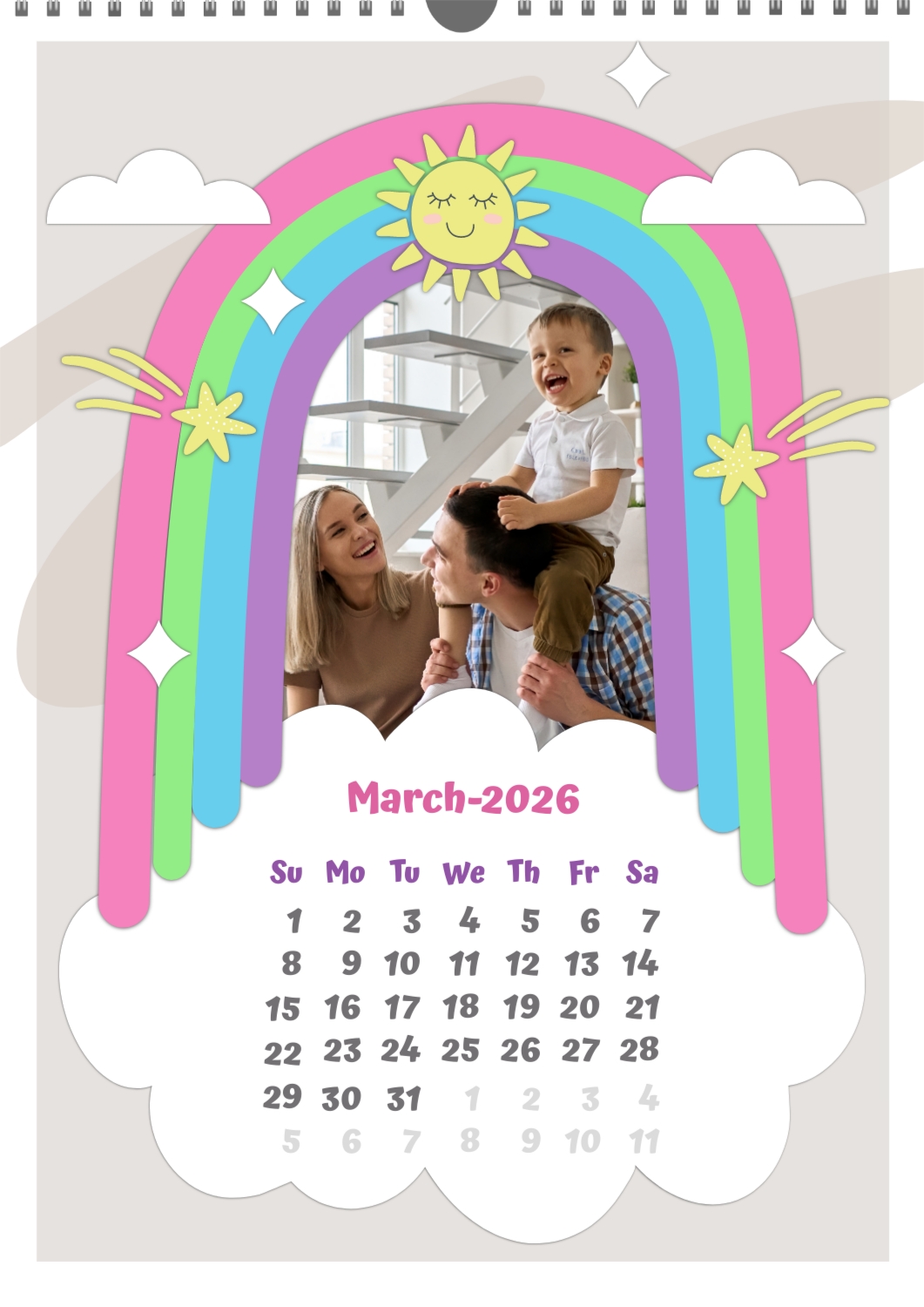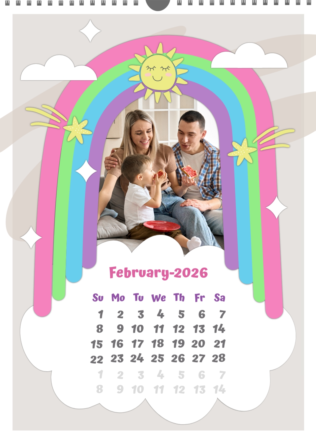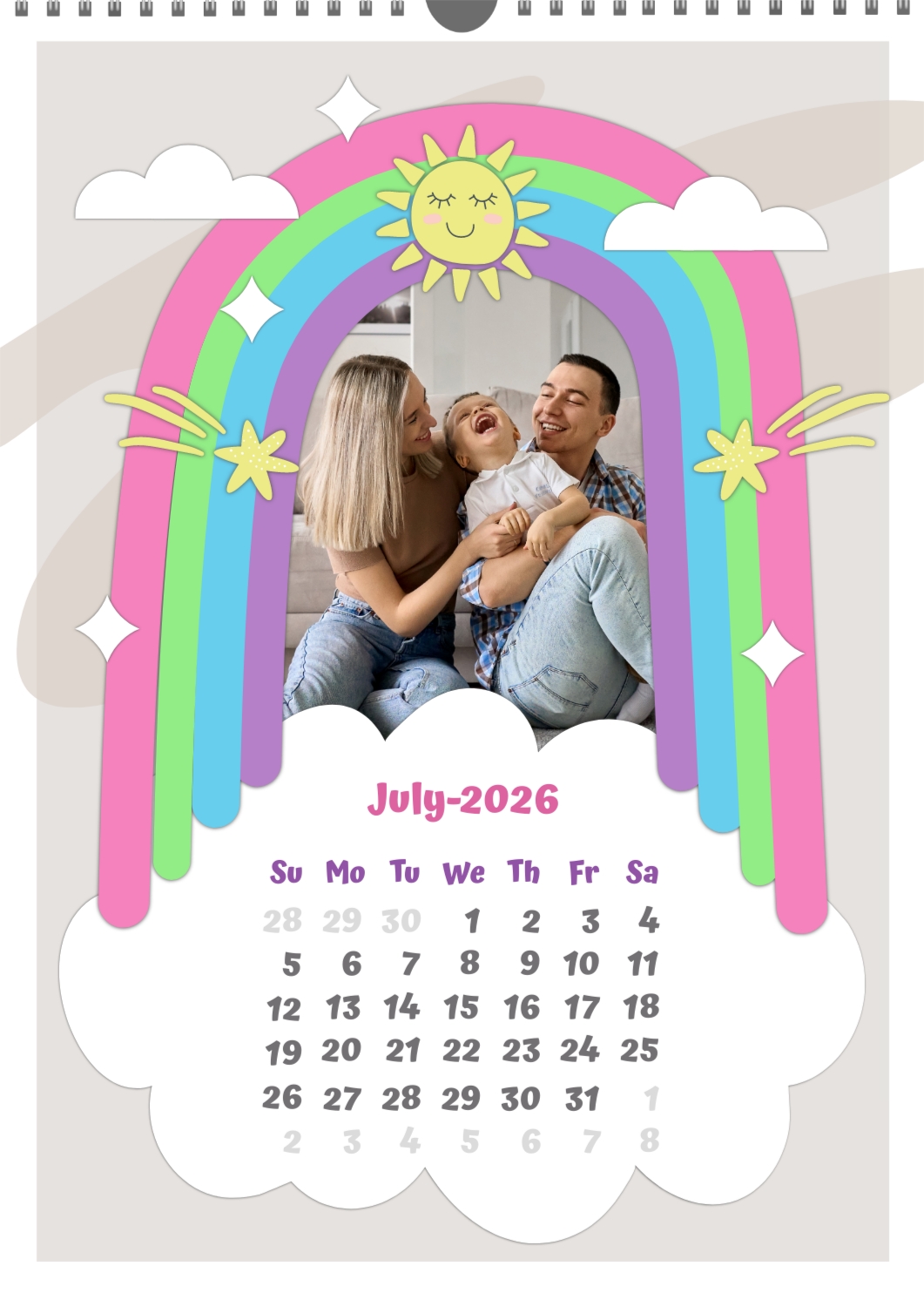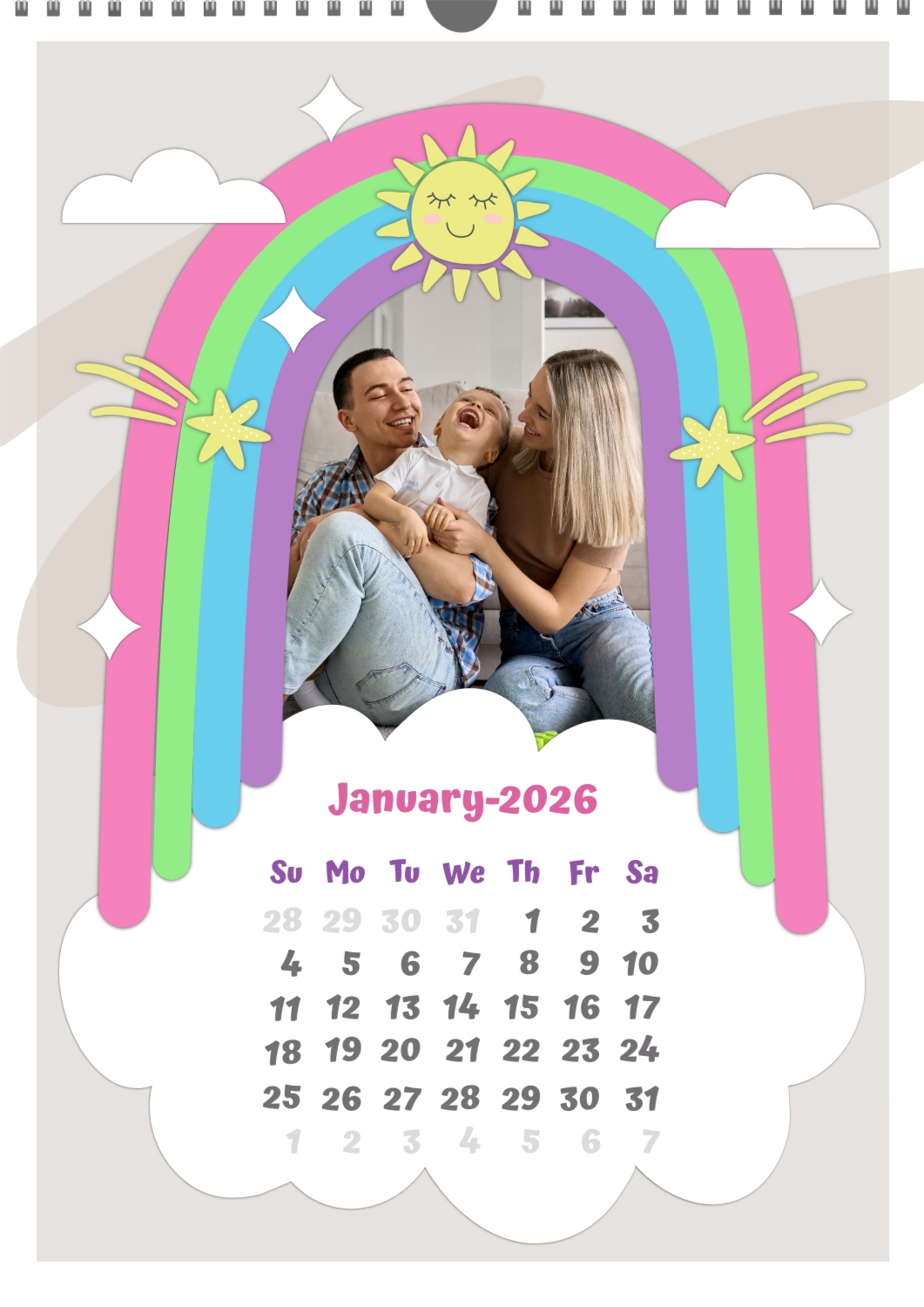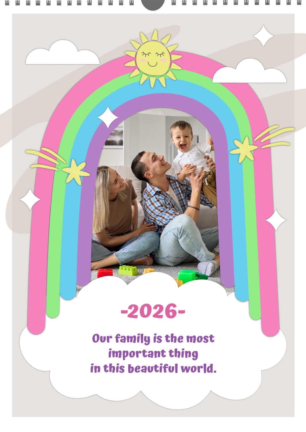 A calendar template featuring a happy family with a son under a rainbow in a cartoon style with the sun, clouds, comets, and stars. Children's fonts.