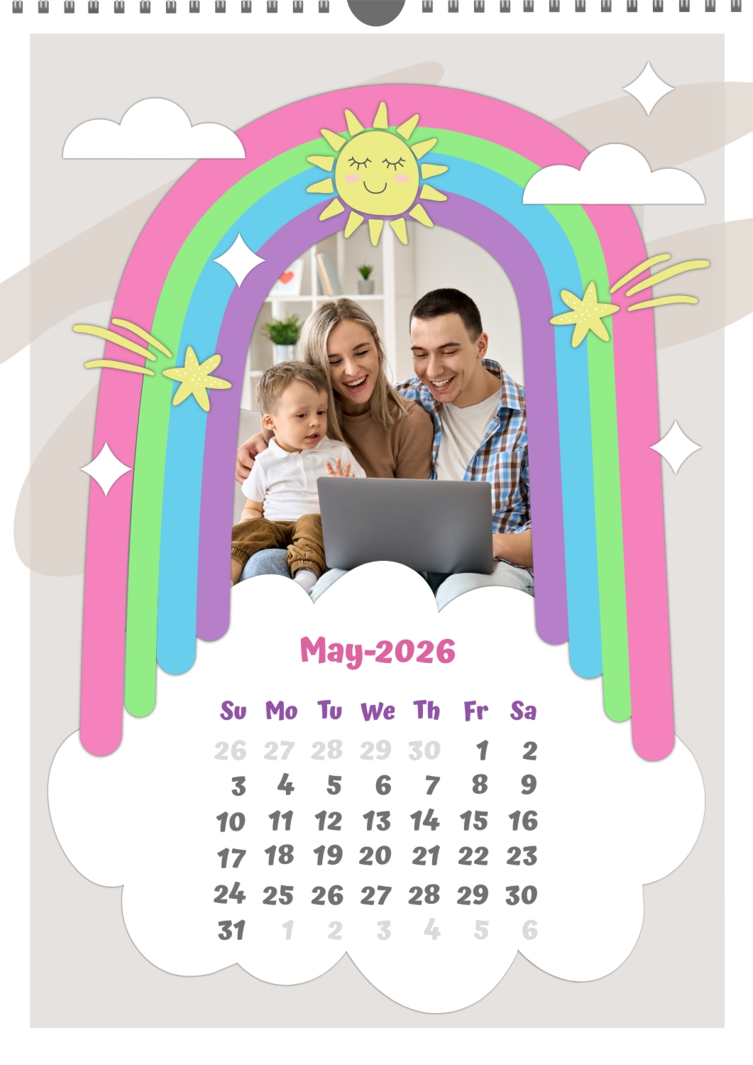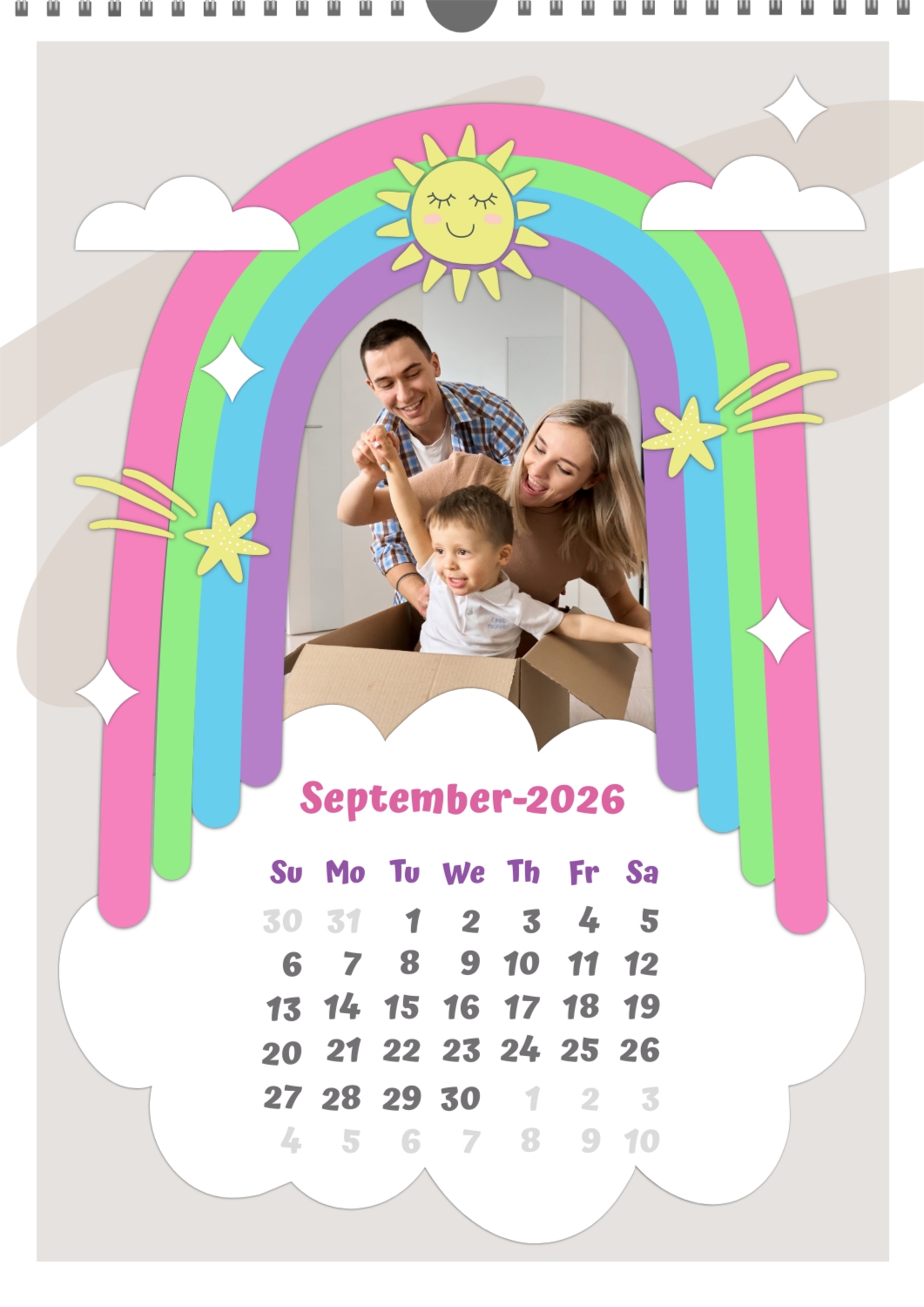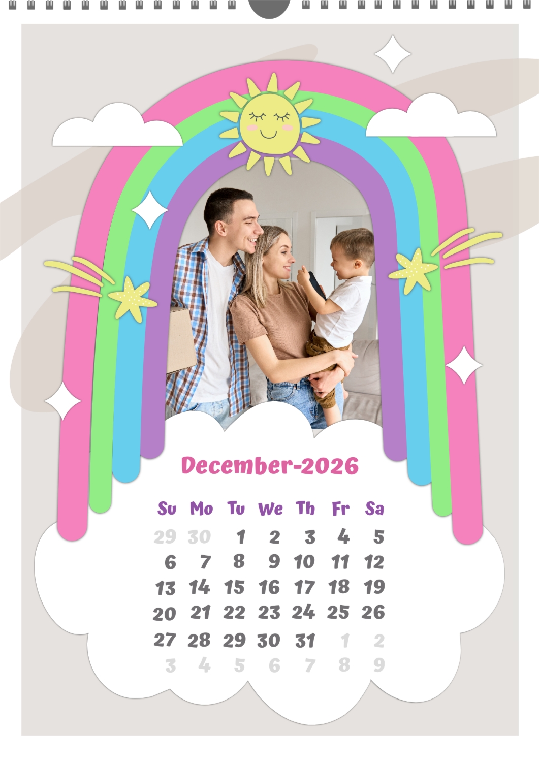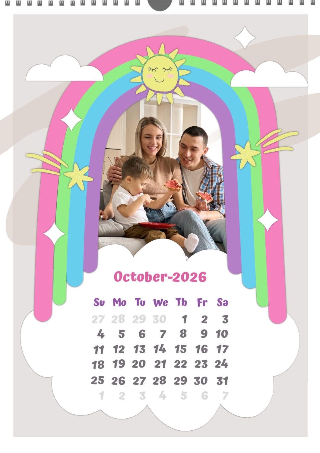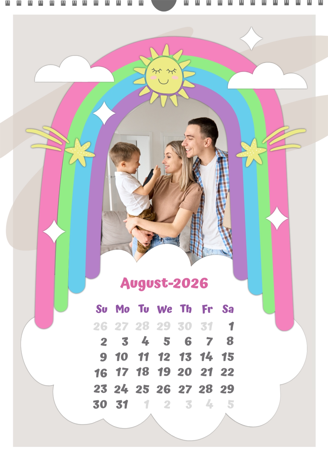 A calendar template featuring a happy family with a son under a rainbow in a cartoon style with the sun, clouds, comets, and stars. Children's fonts.