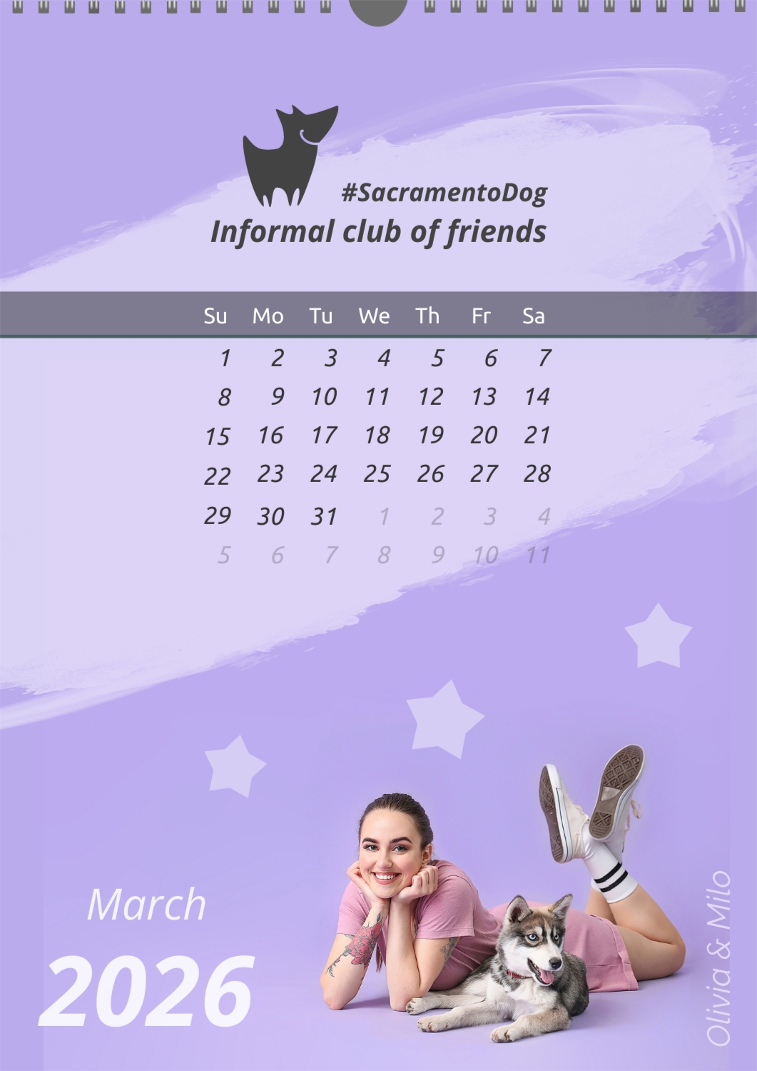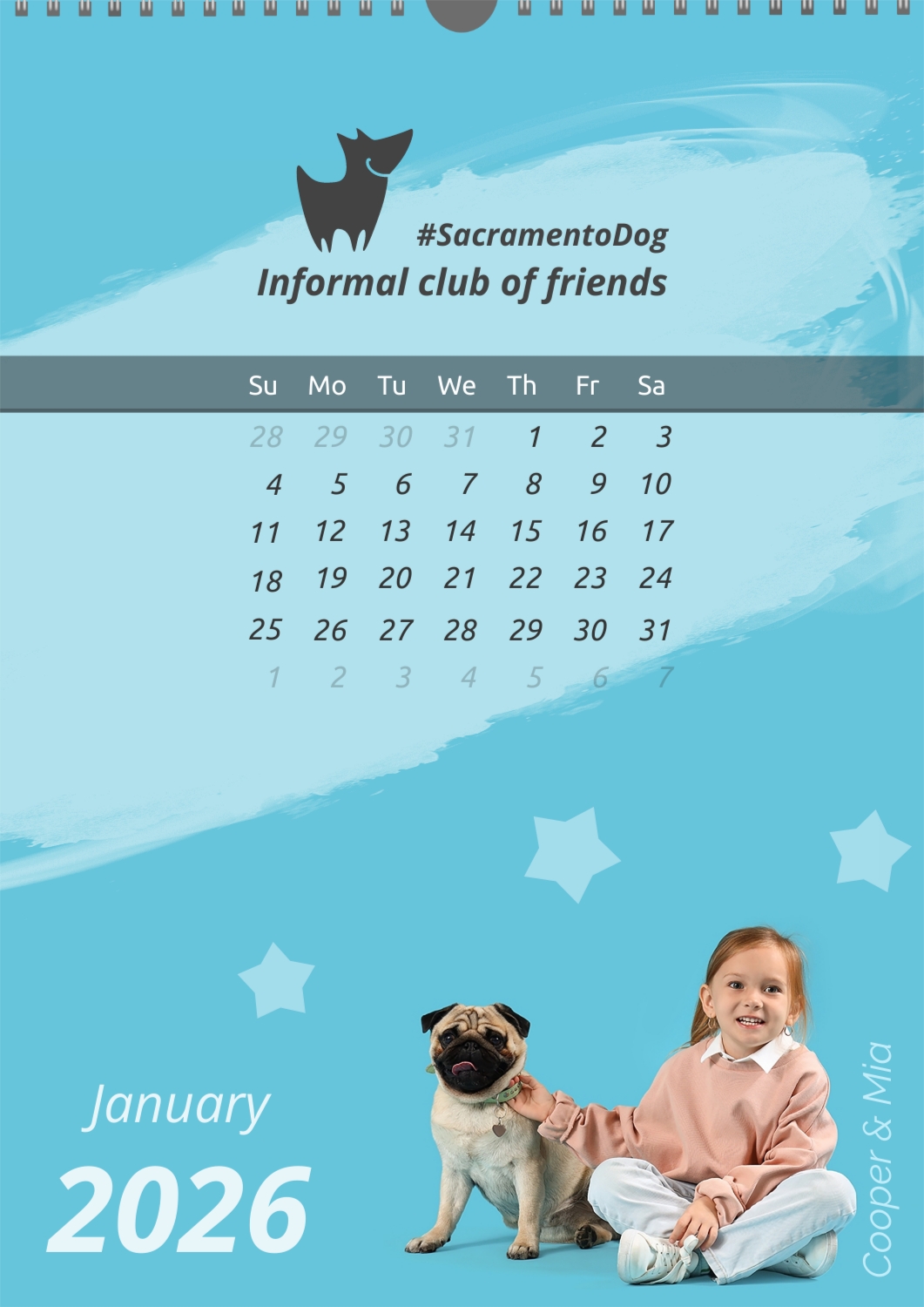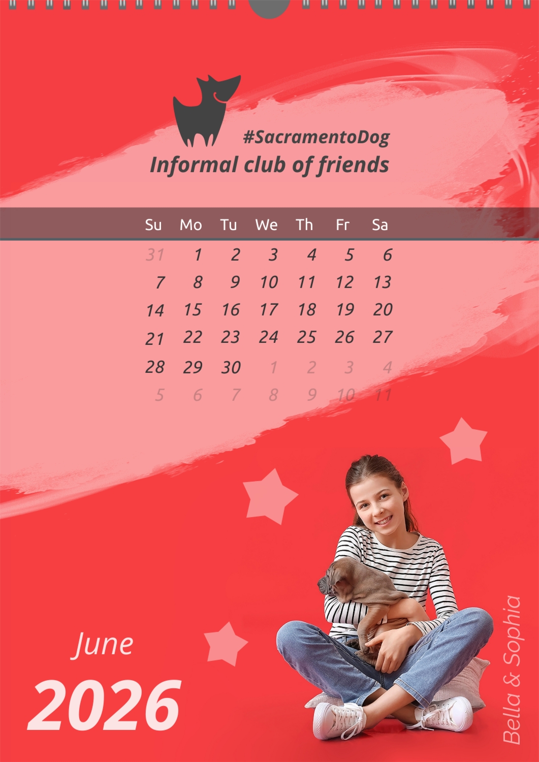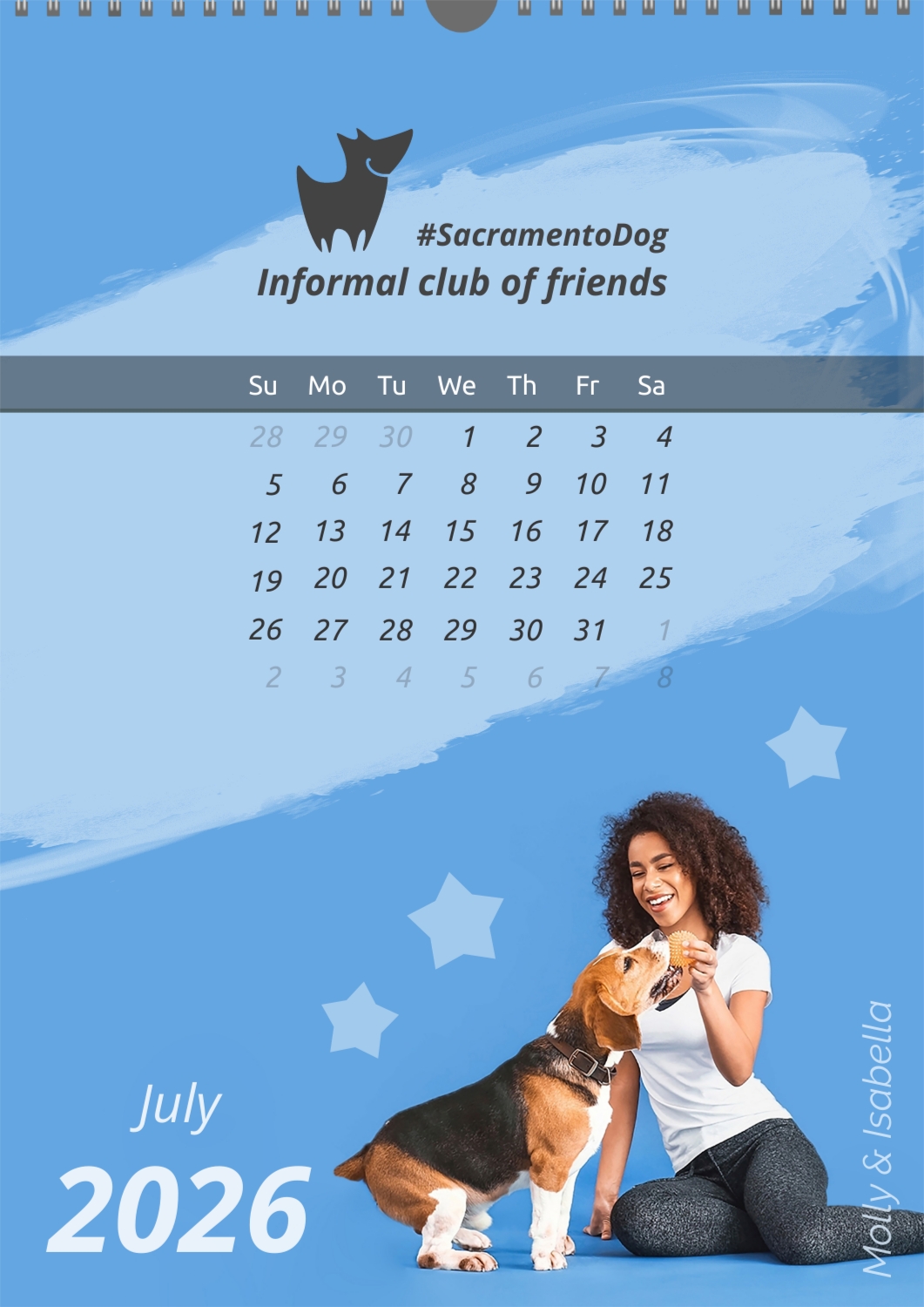People with dogs calendar template. A calendar template for an informal dog club. Children with their dogs—with names and nicknames—on a plain background with stars.
