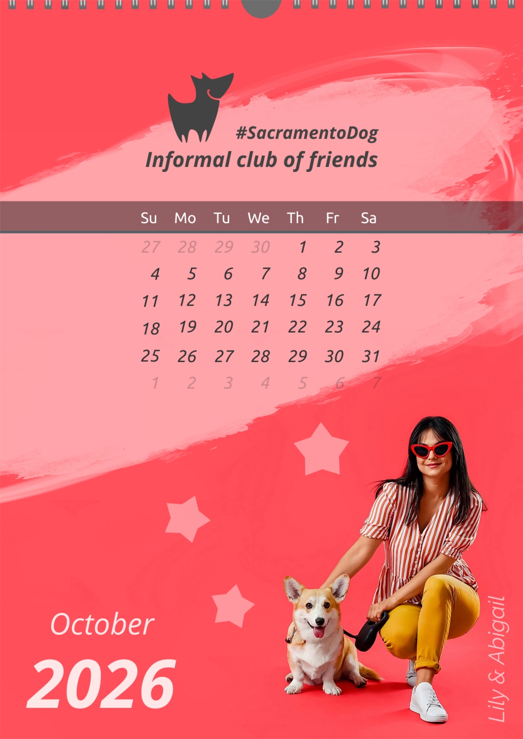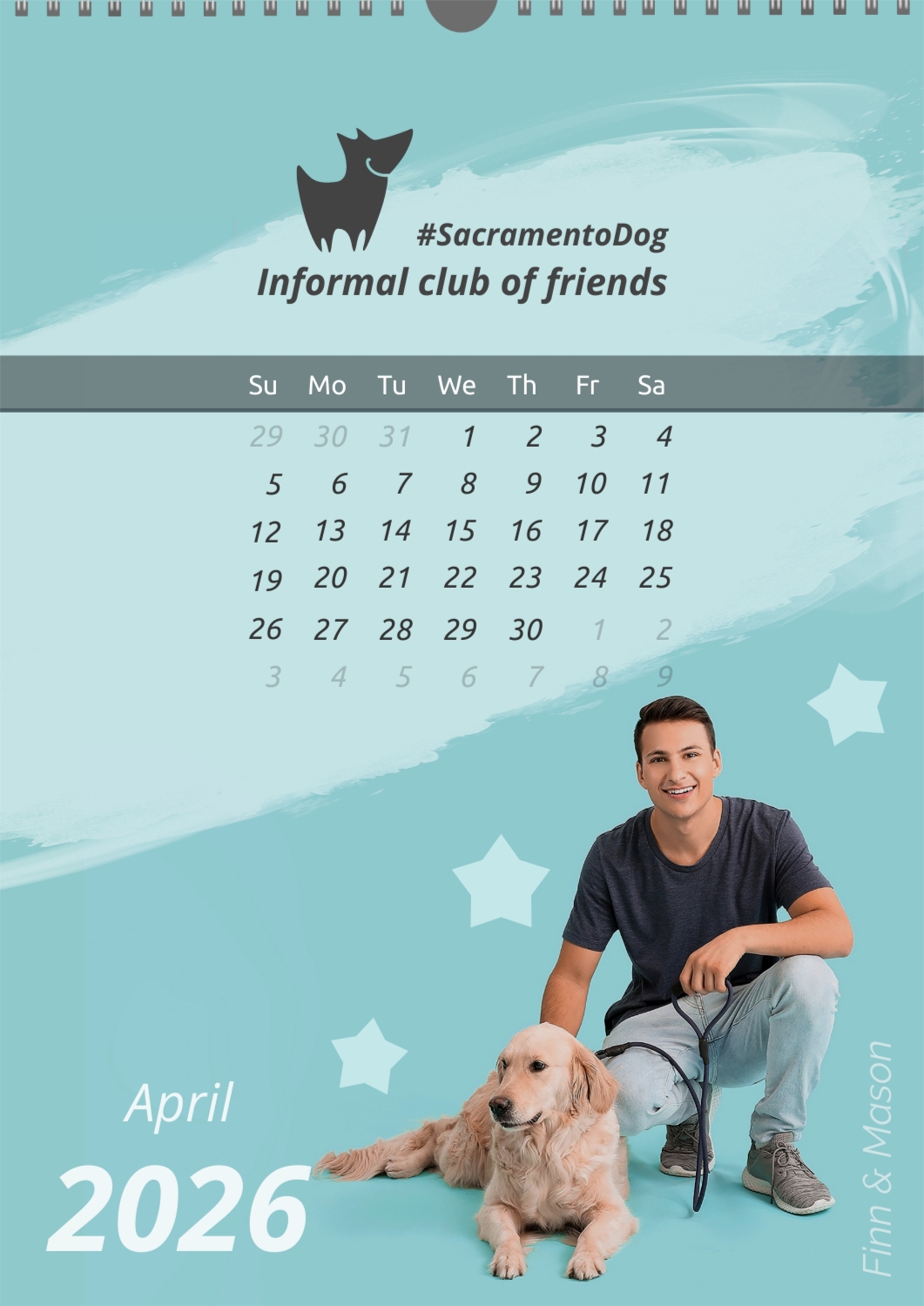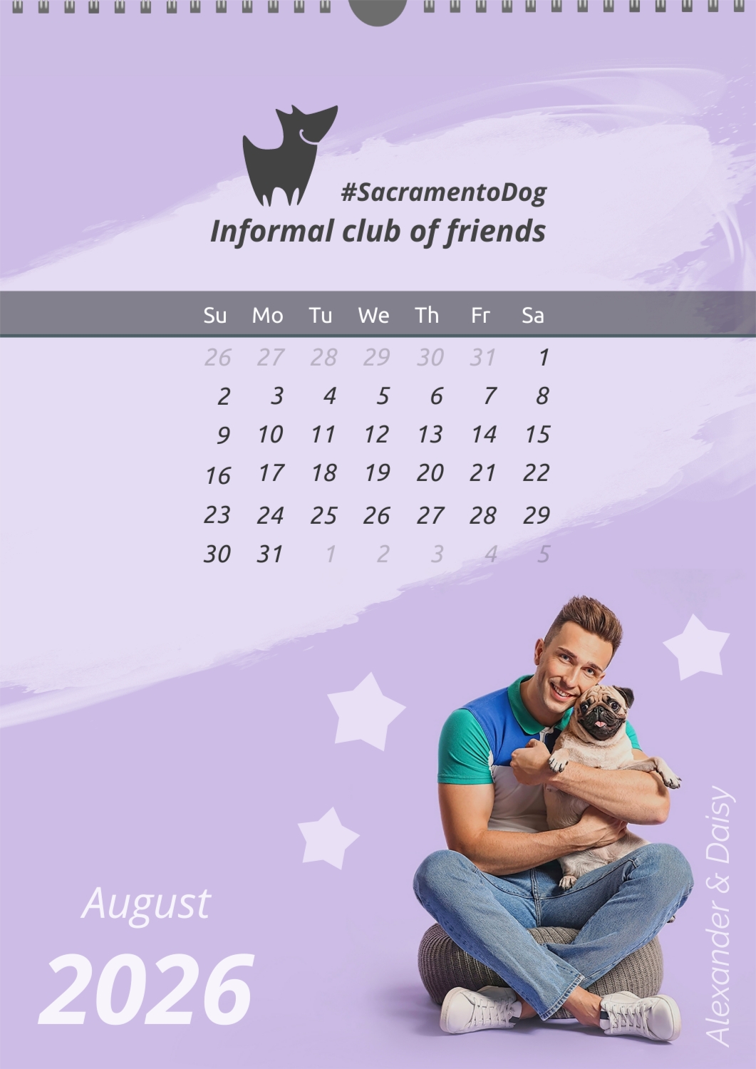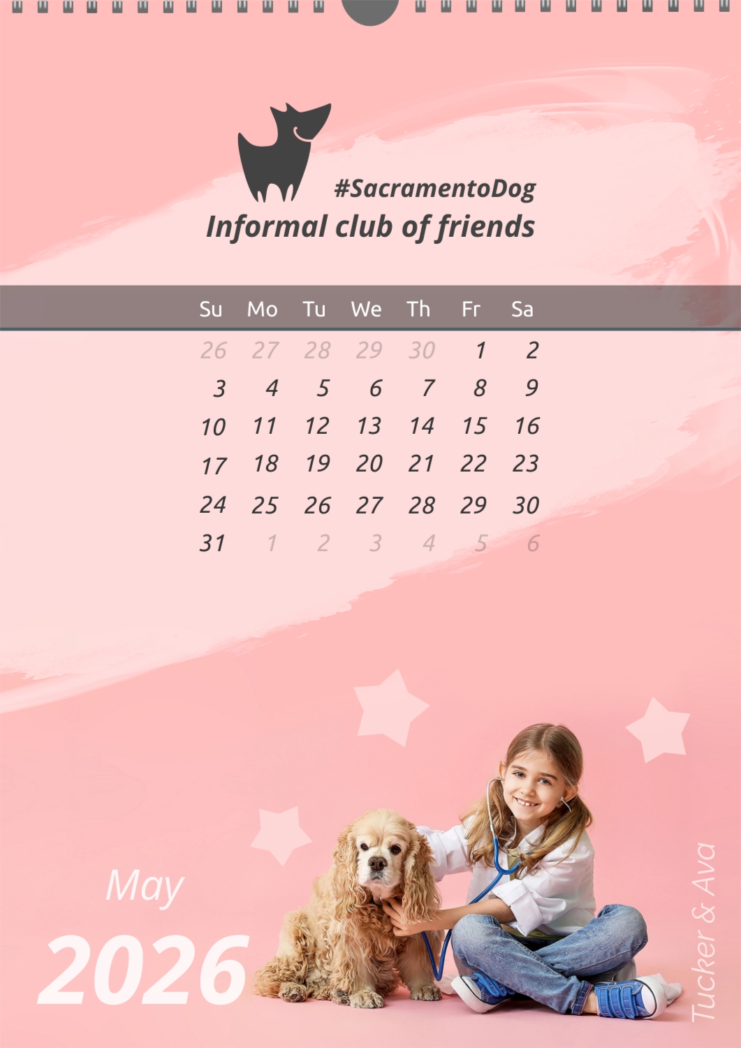 People with dogs calendar template. A calendar template for an informal dog club. Children with their dogs—with names and nicknames—on a plain background with stars.