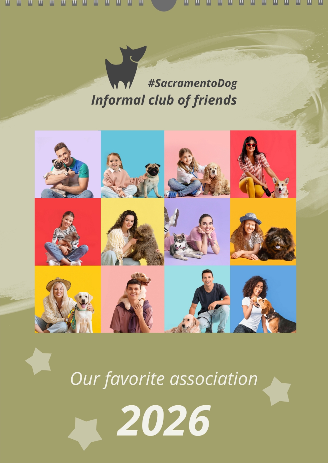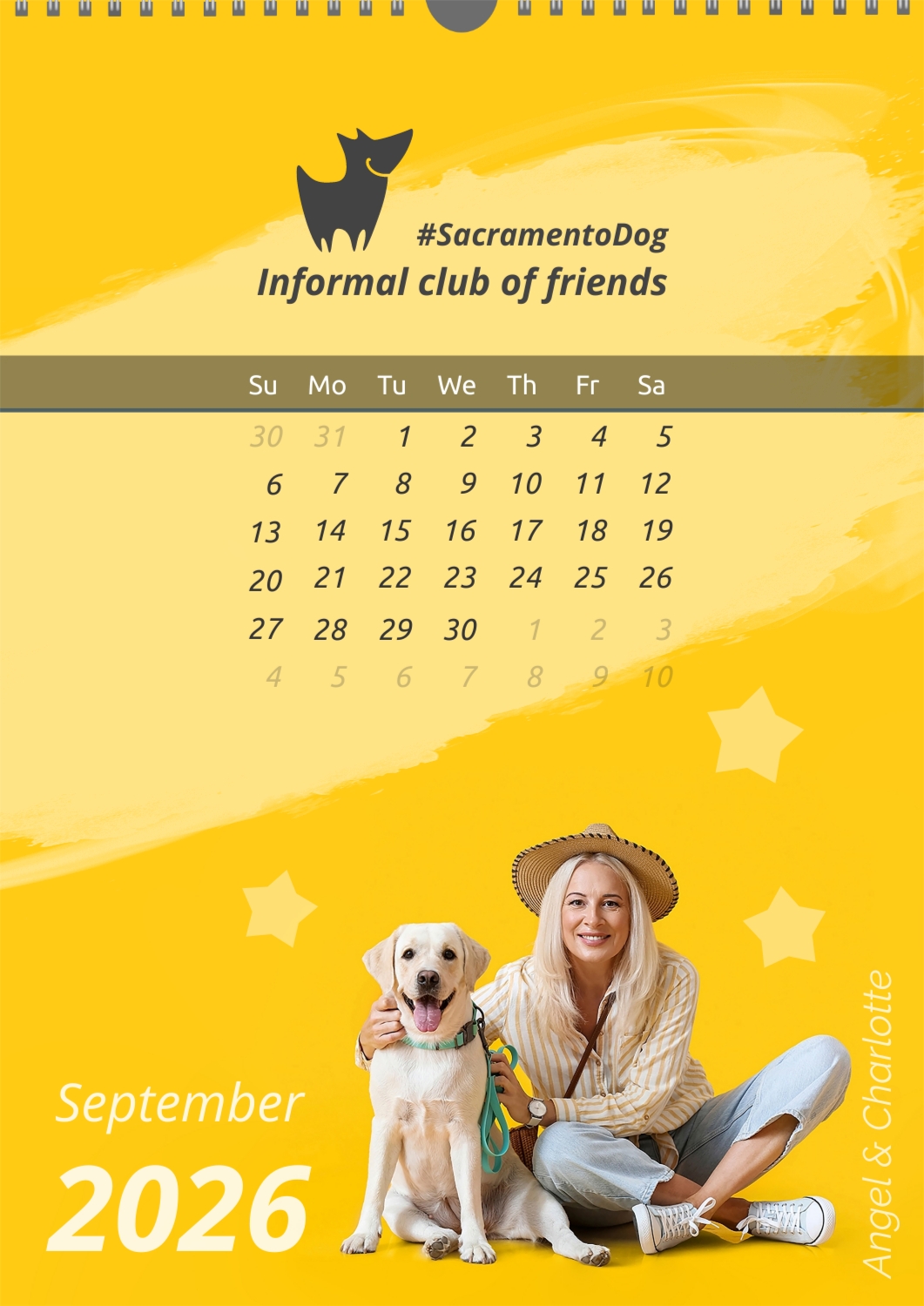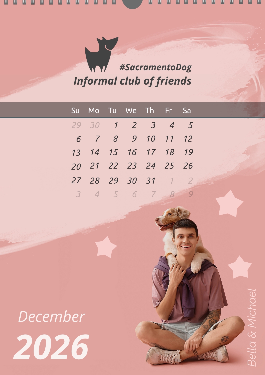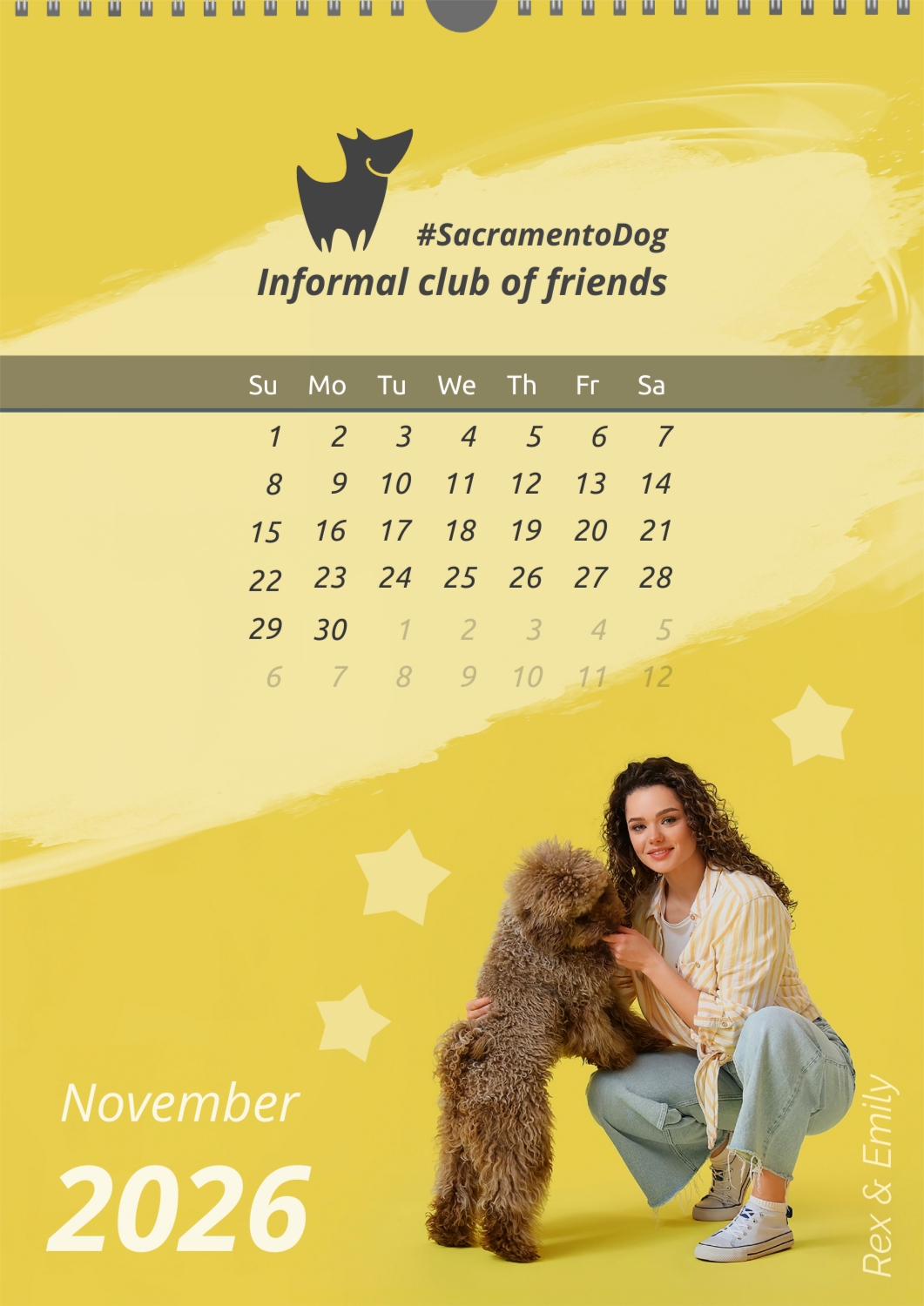 People with dogs calendar template. A calendar template for an informal dog club. Children with their dogs—with names and nicknames—on a plain background with stars.