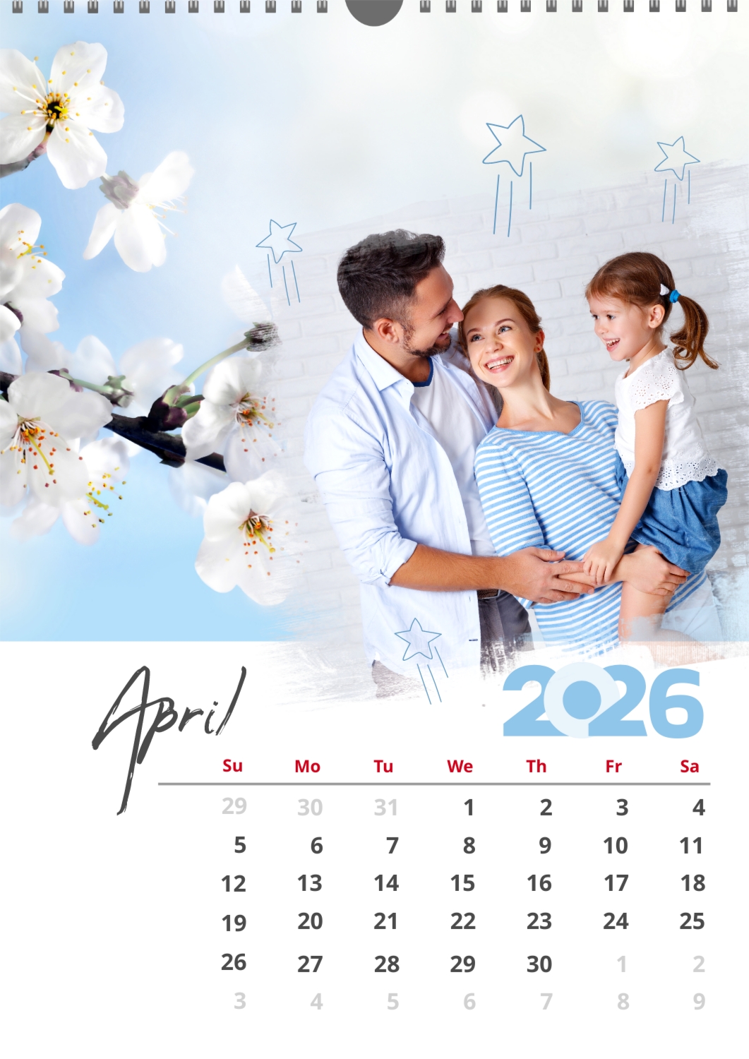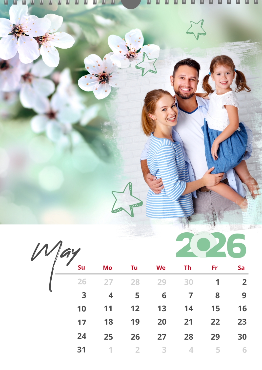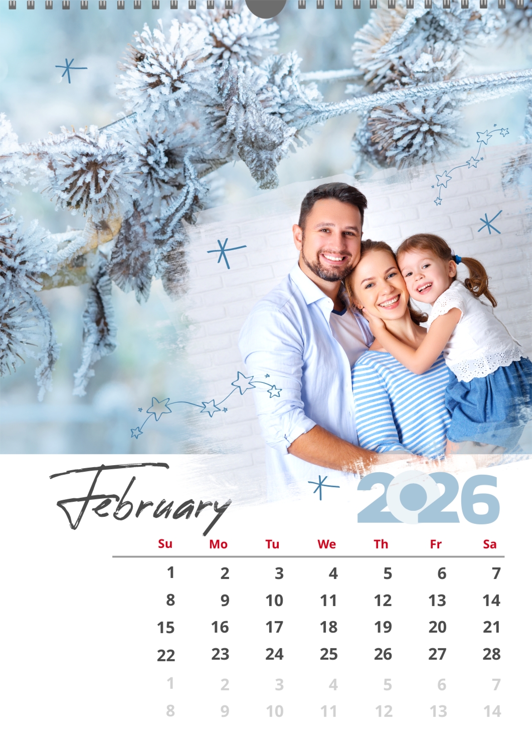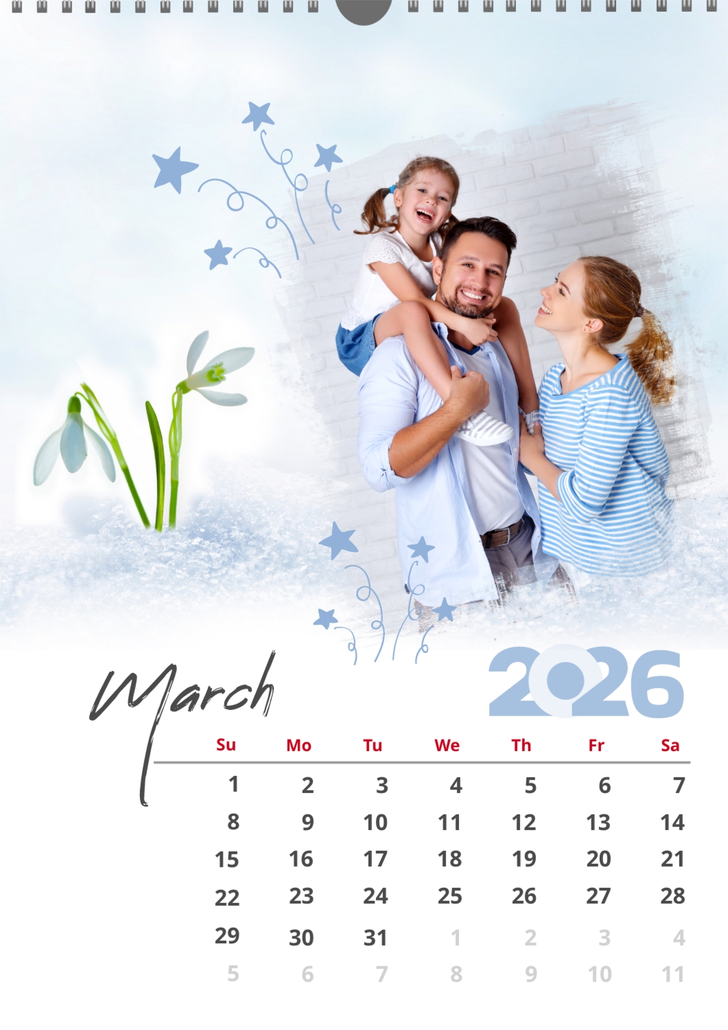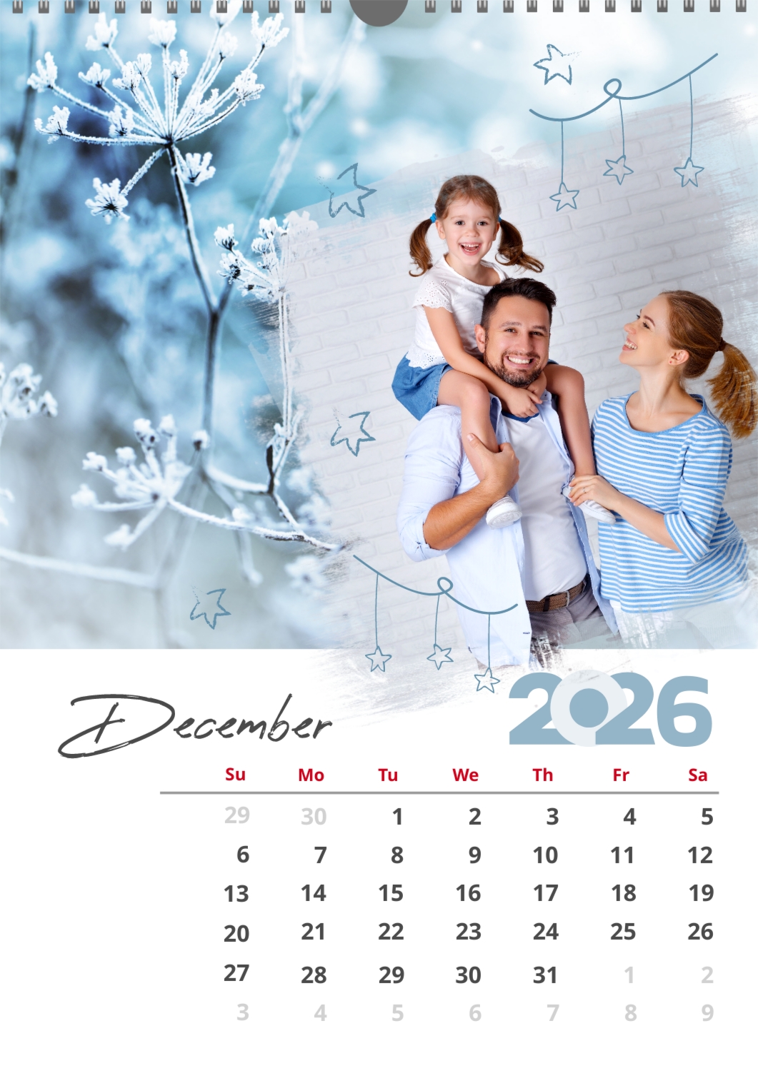 The best family calendar template with daughter with light rays and colorful light spots: large tilted photos in a frame with brush strokes.
