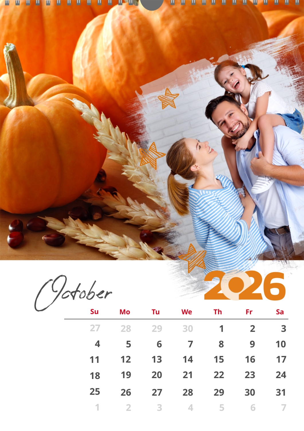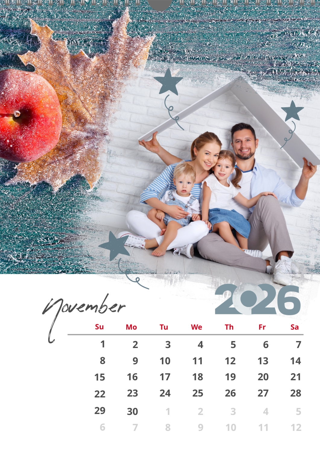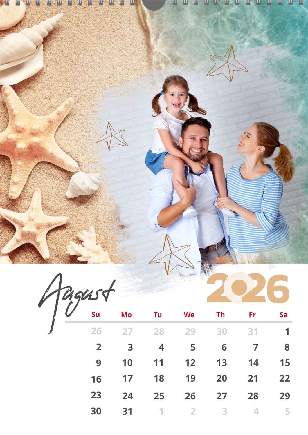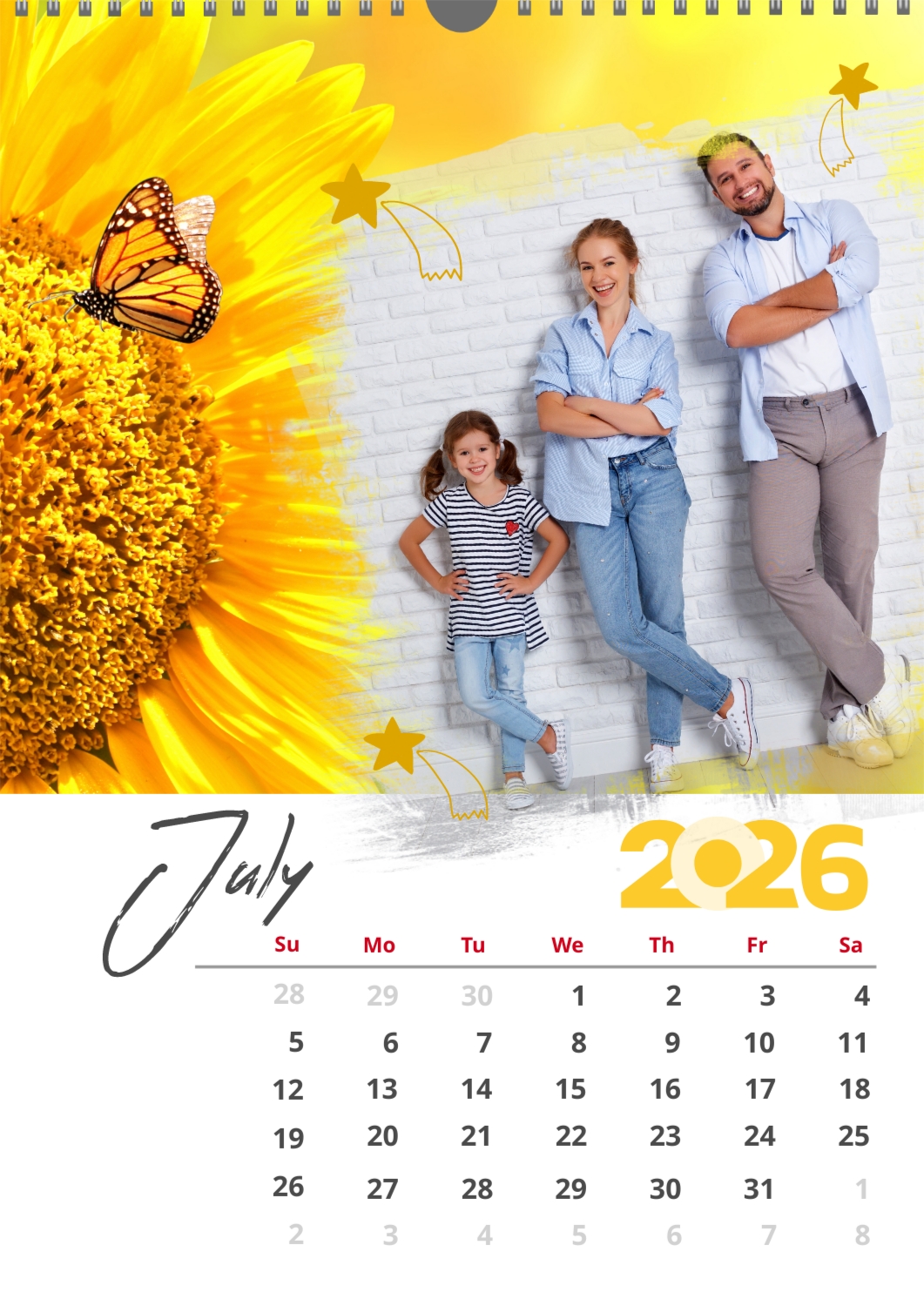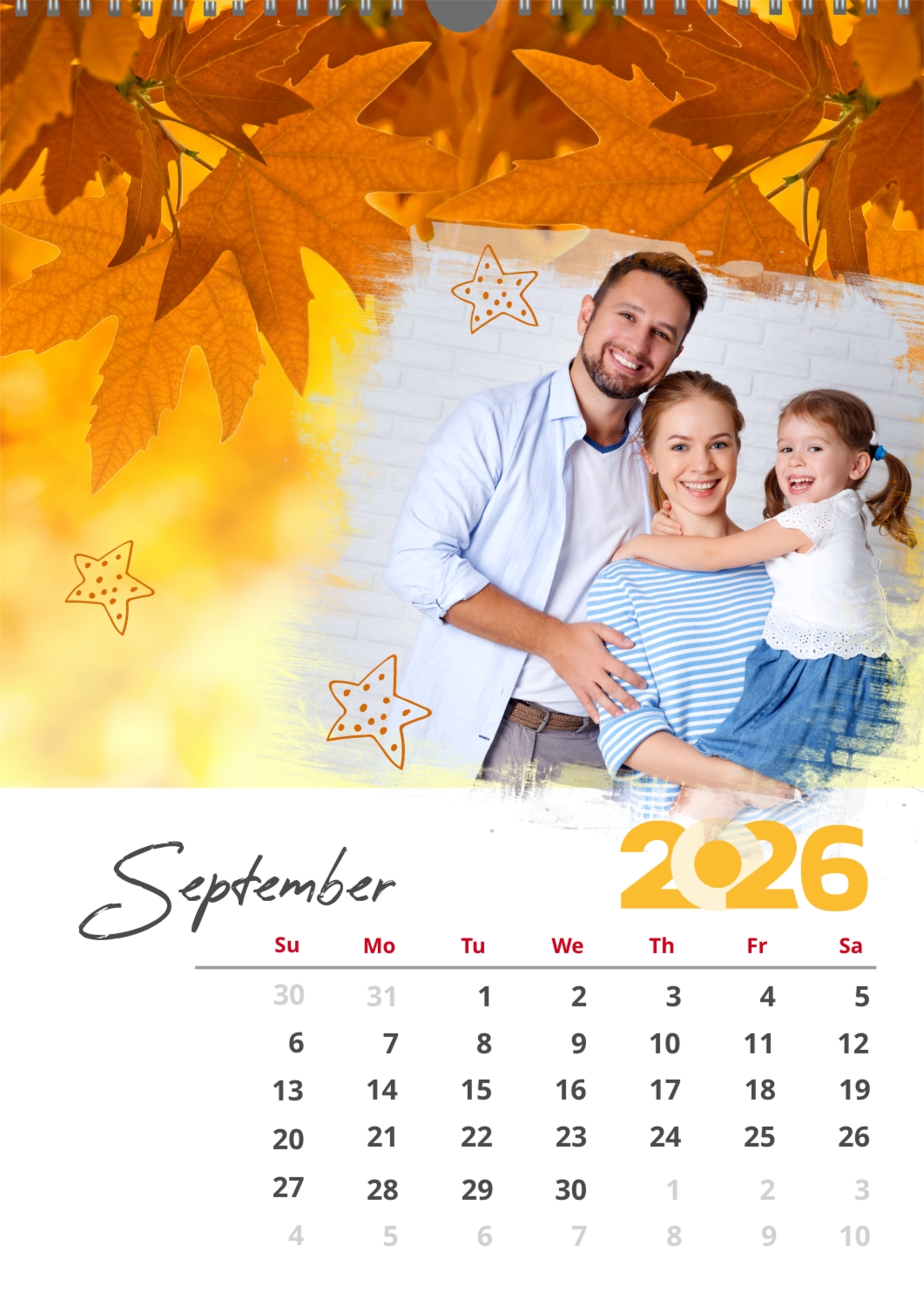 The best family calendar template with daughter with light rays and colorful light spots: large tilted photos in a frame with brush strokes.