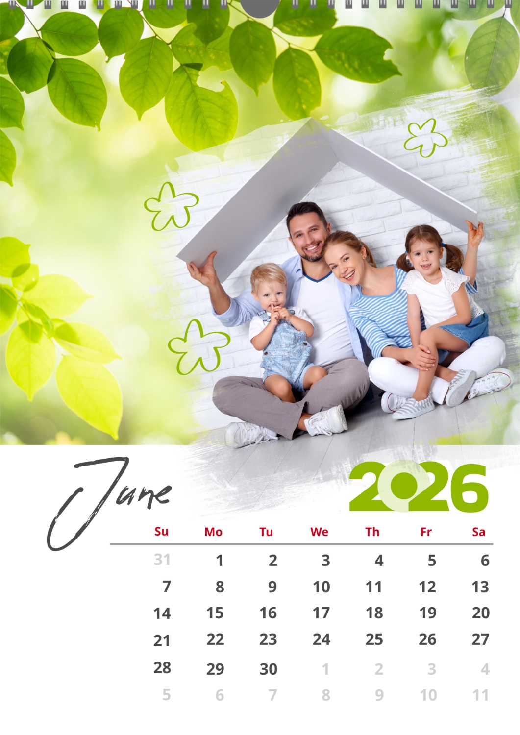 A light calendar template featuring a happy family with children near their home on an olive green background. Large photos with grunge edges.