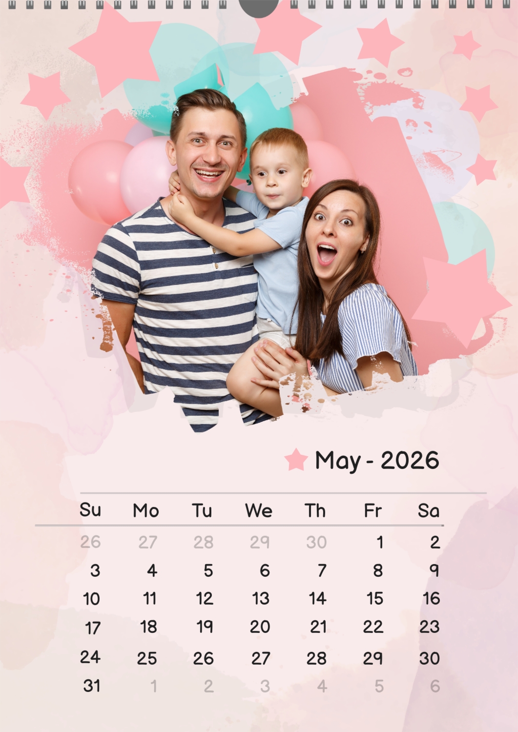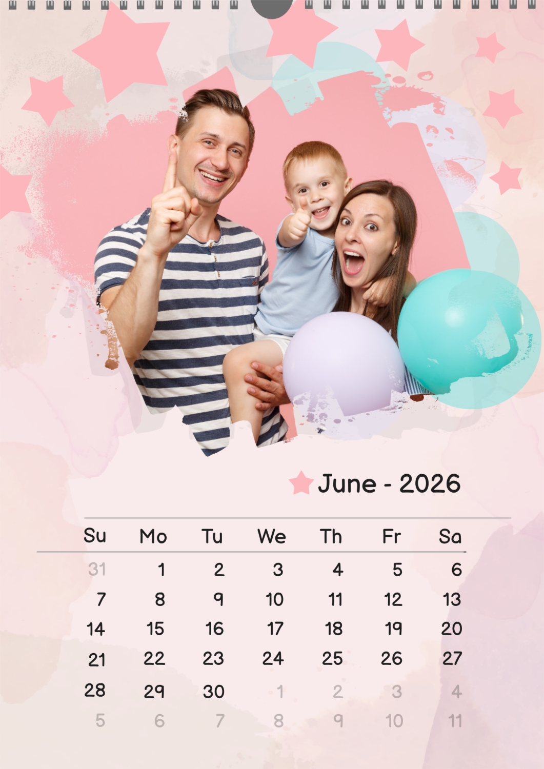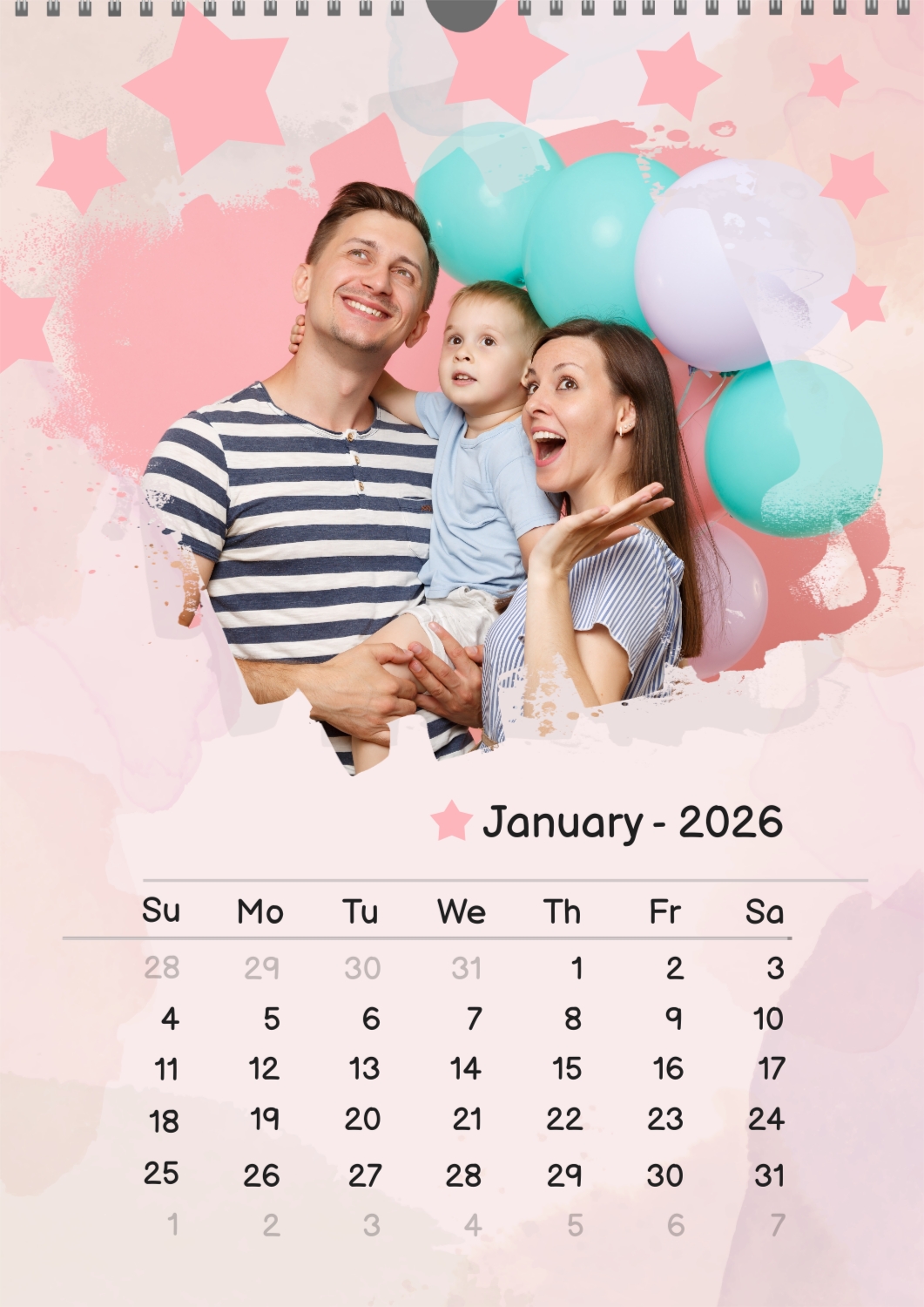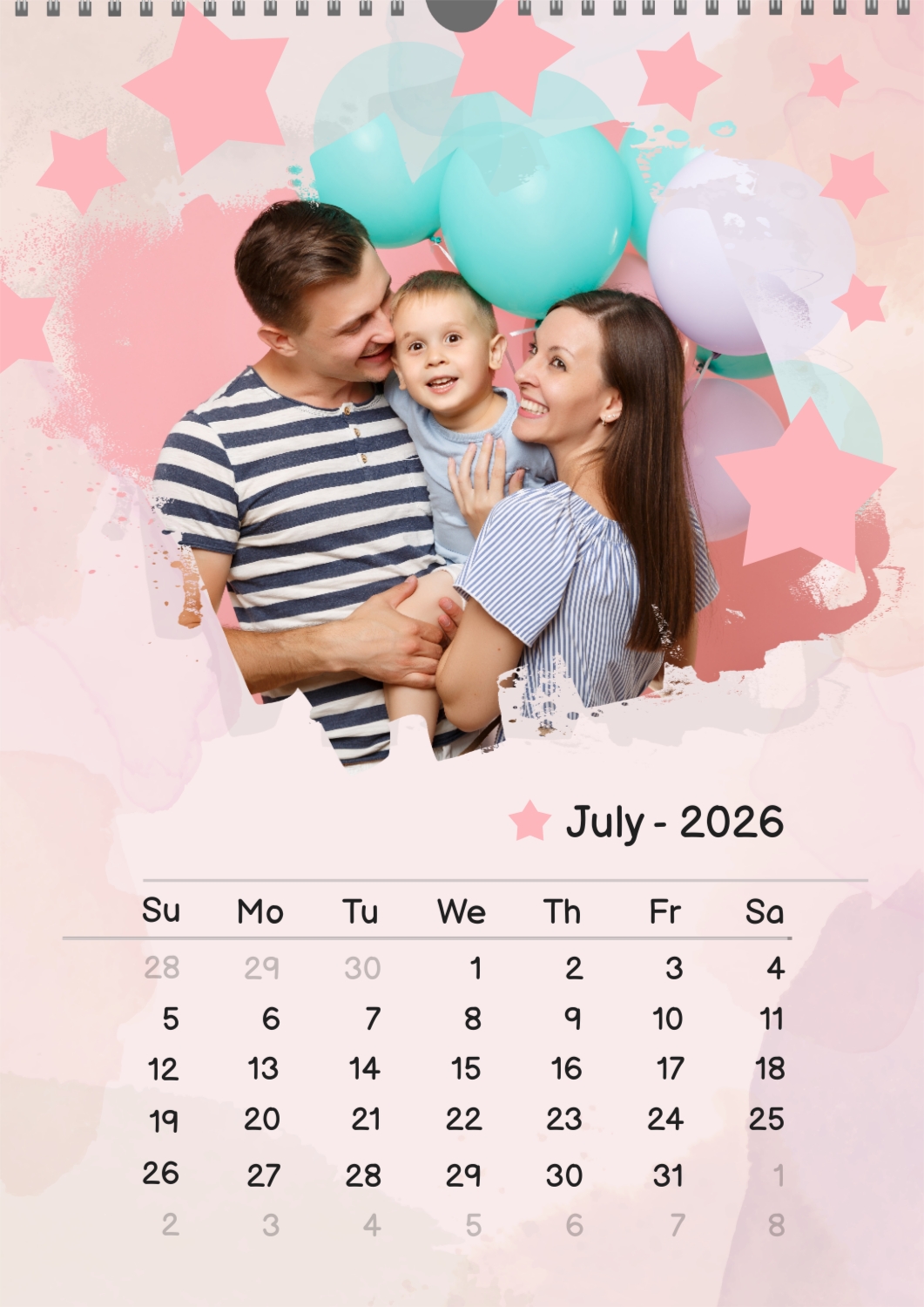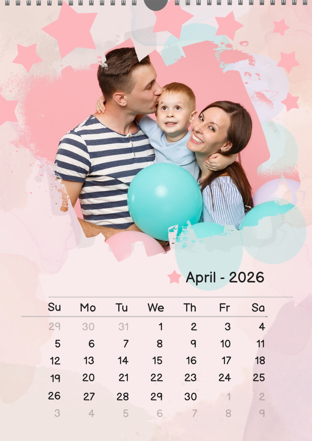 A free calendar template featuring a joyful young family with a son, featuring stars and balloons. The photo features grunge edges, a pastel background, and a playful font.