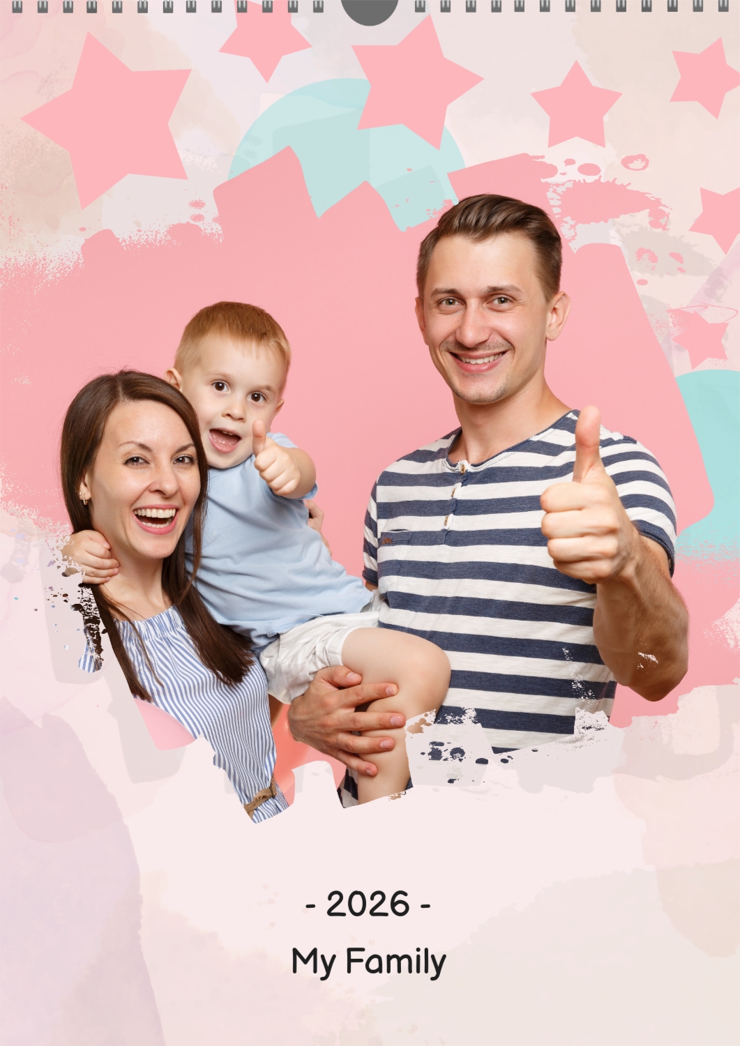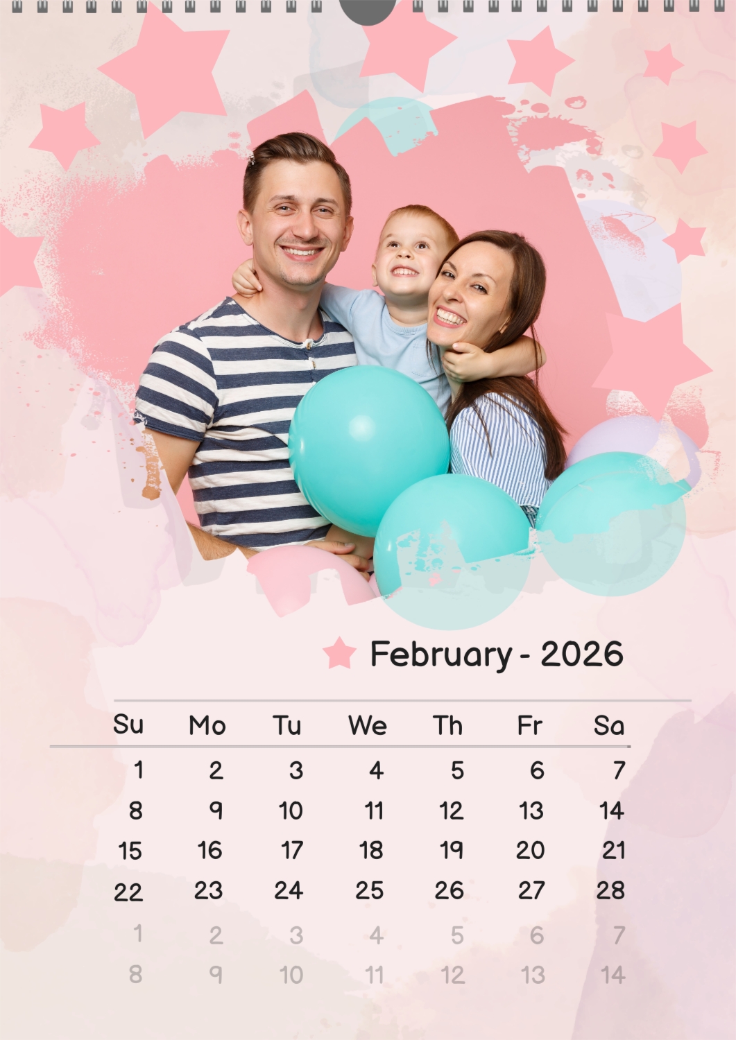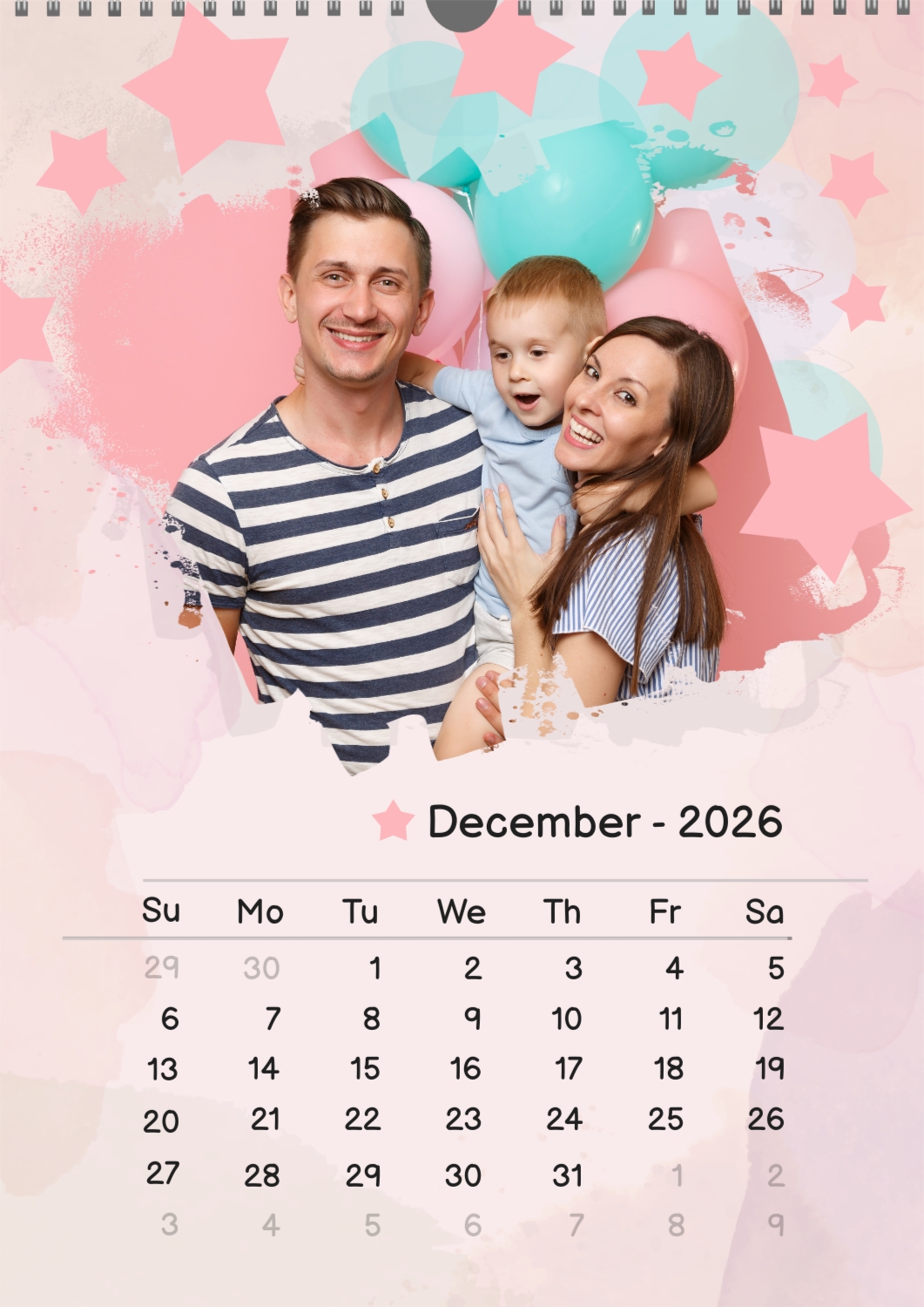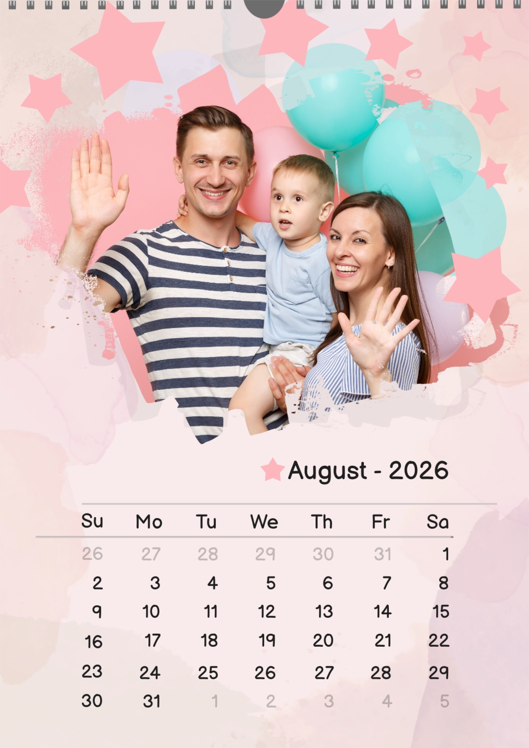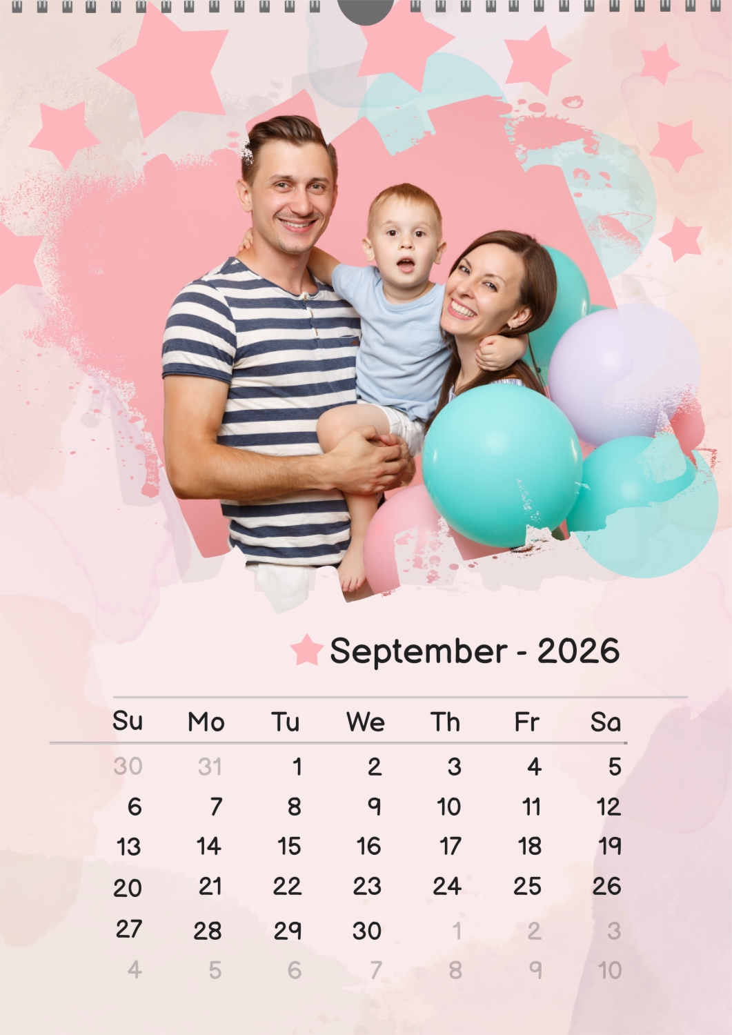 A free calendar template featuring a joyful young family with a son, featuring stars and balloons. The photo features grunge edges, a pastel background, and a playful font.