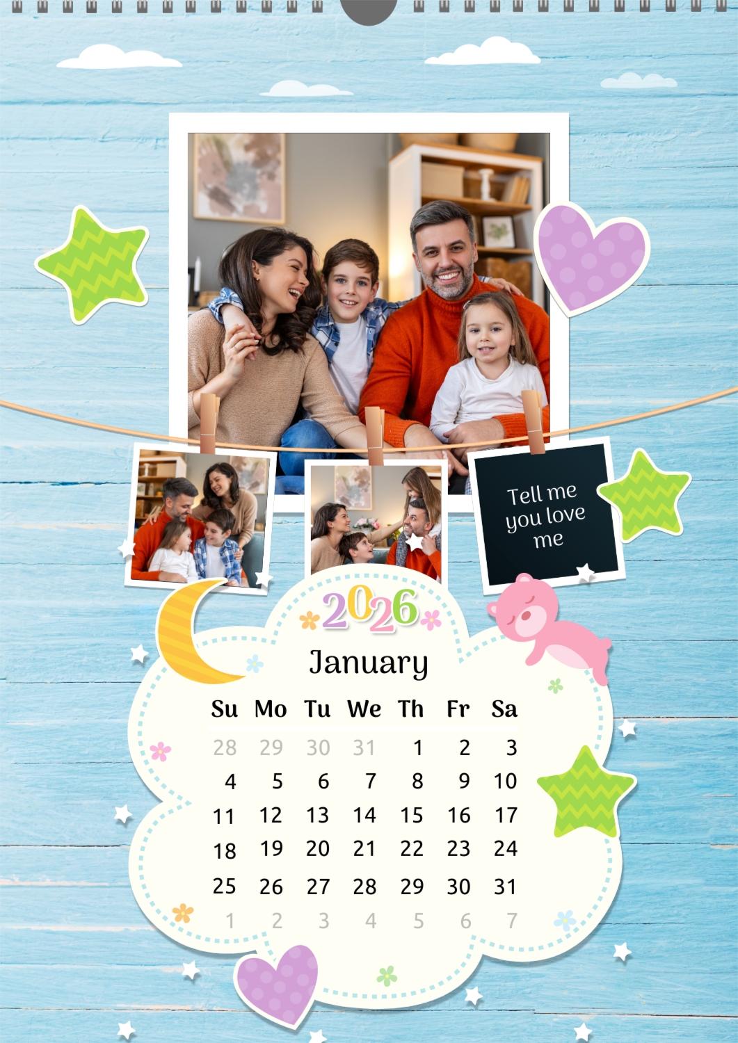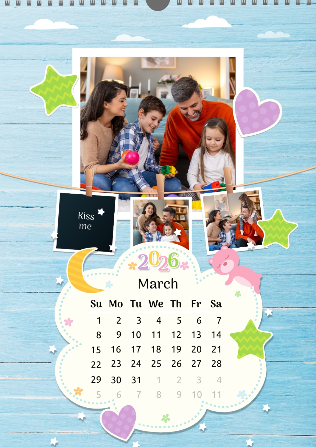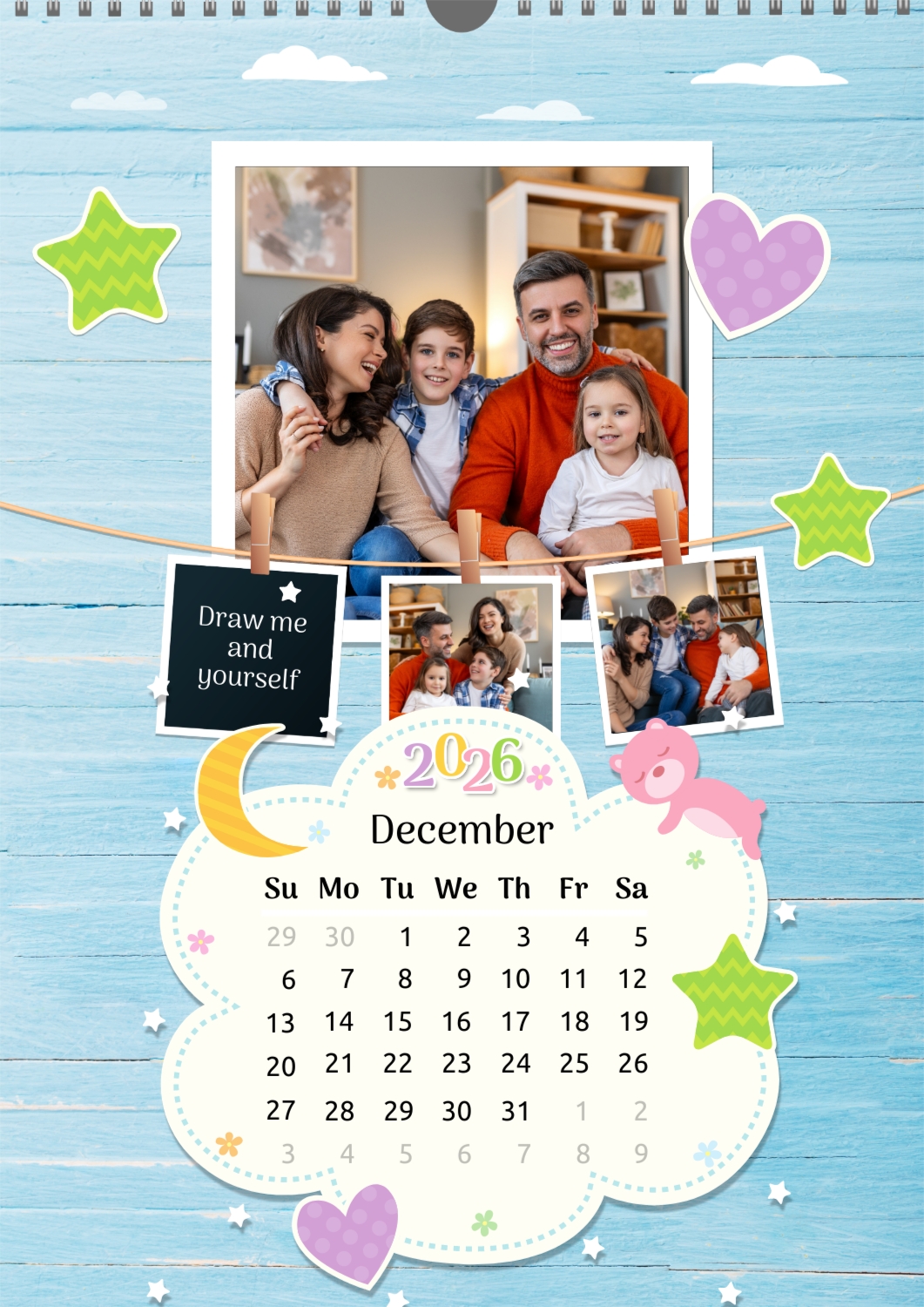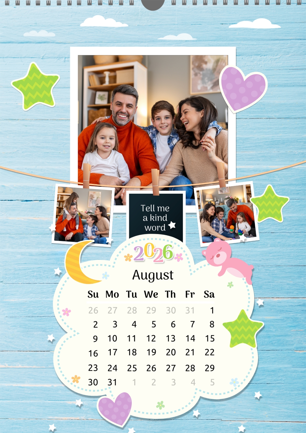 A Happy Family calendar template with clouds, stars, hearts, a teddy bear, and monthly tasks in a child-friendly style: small photos are hung on a string next to a large family photo.