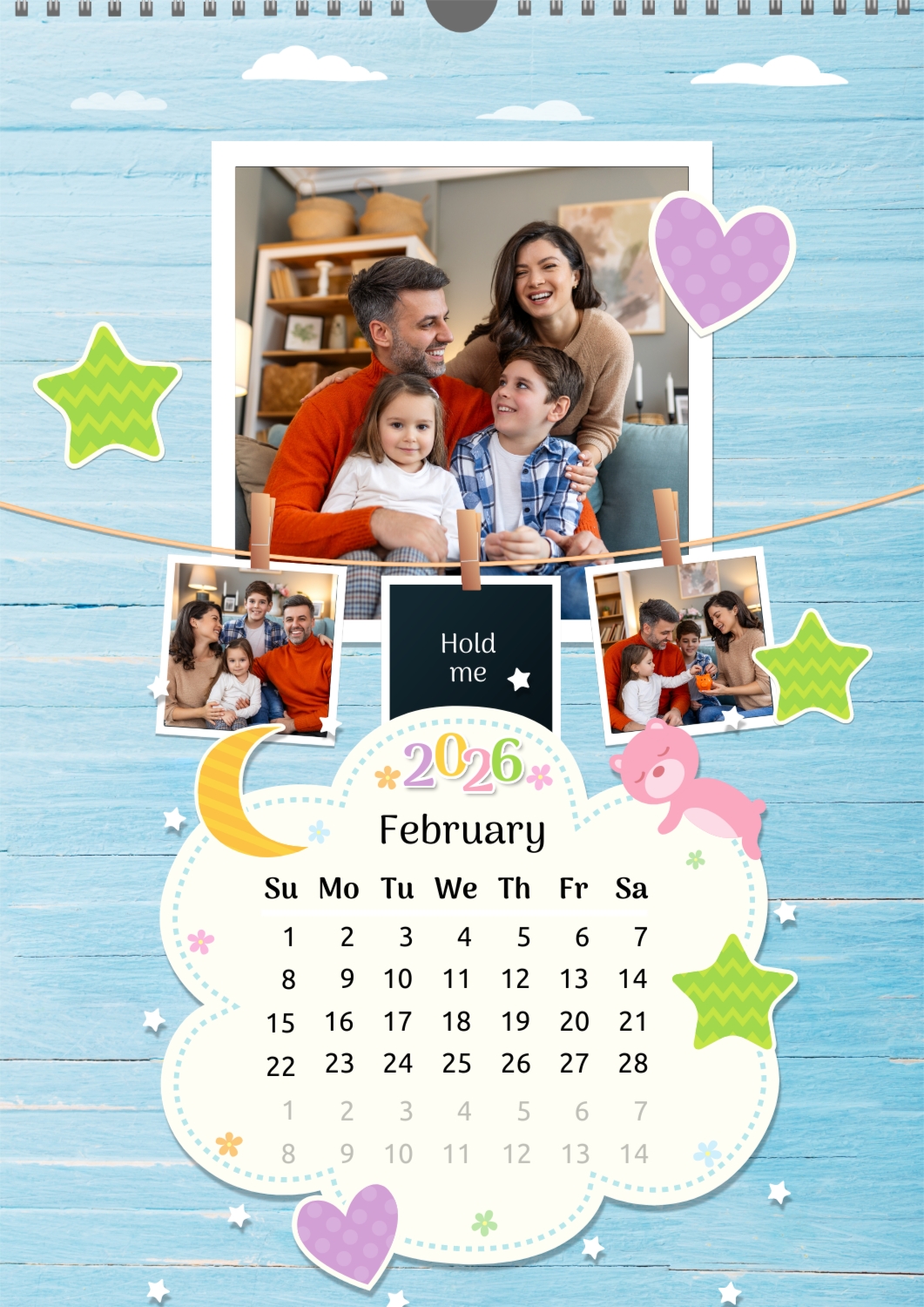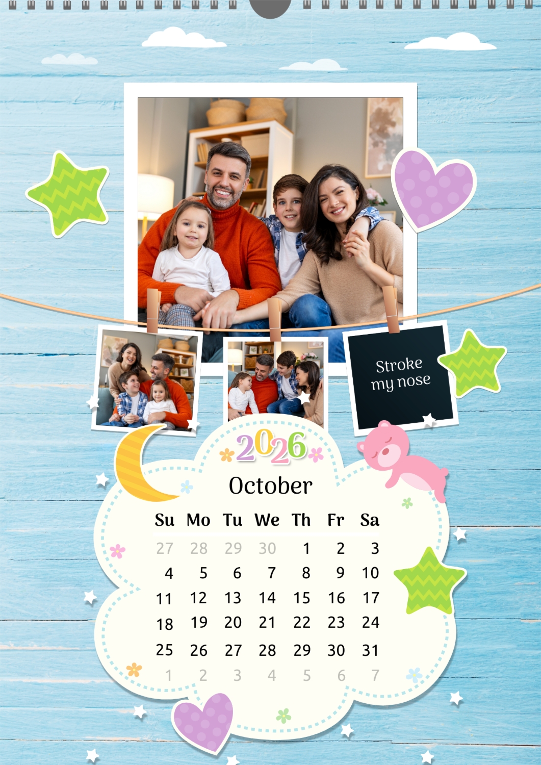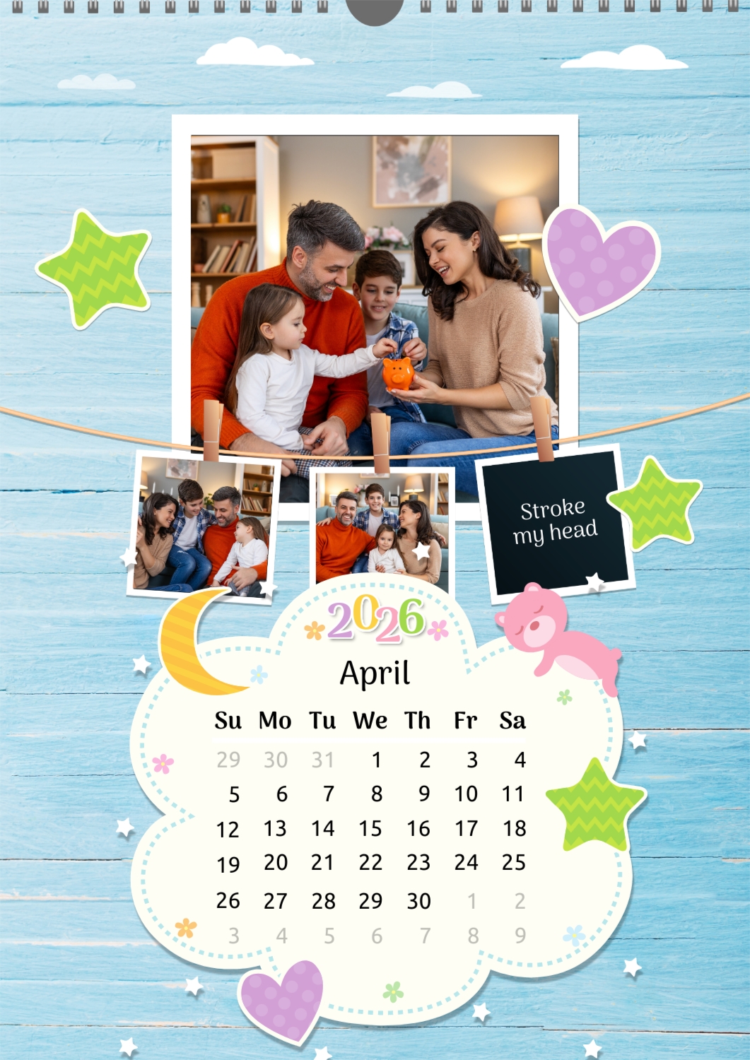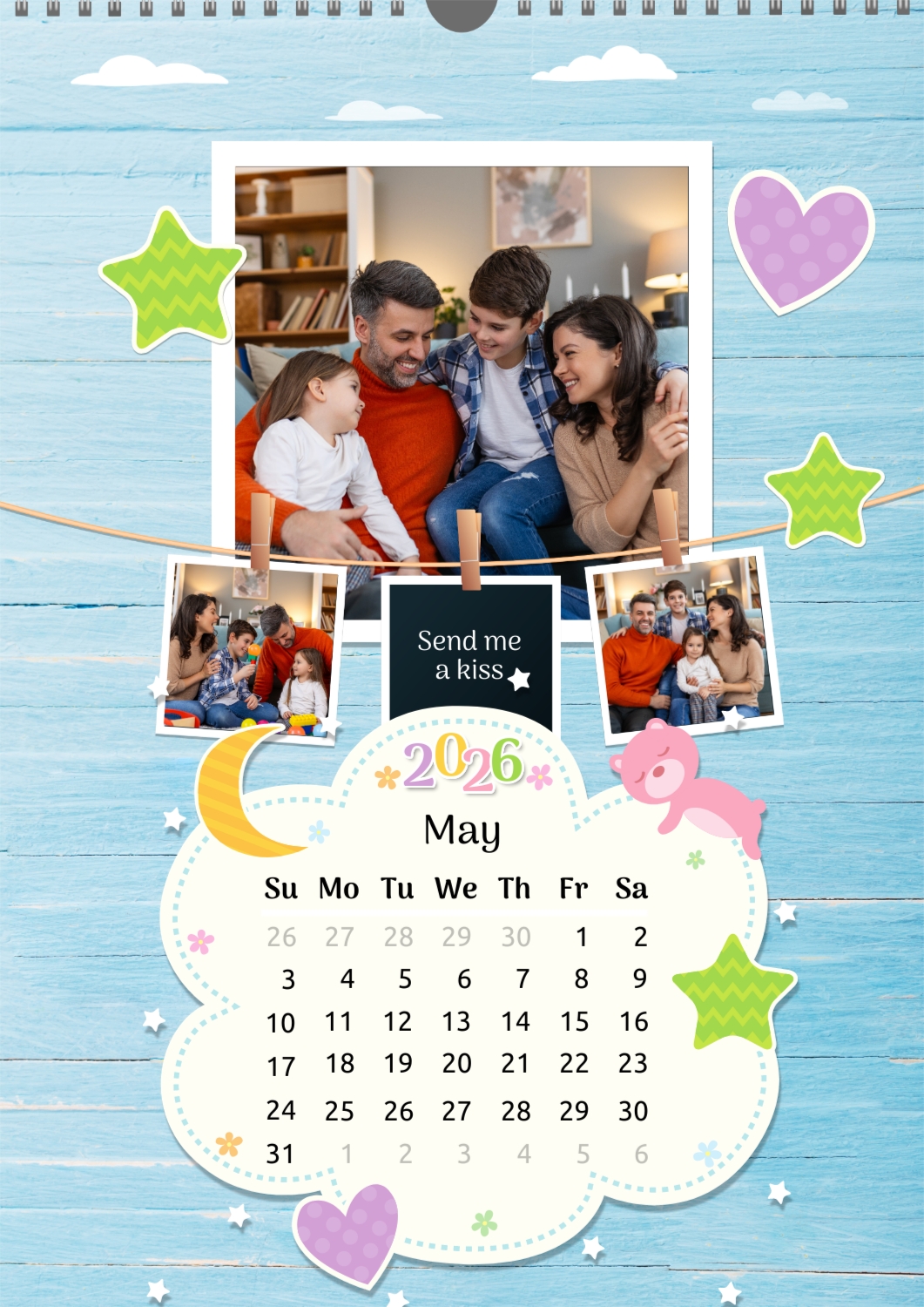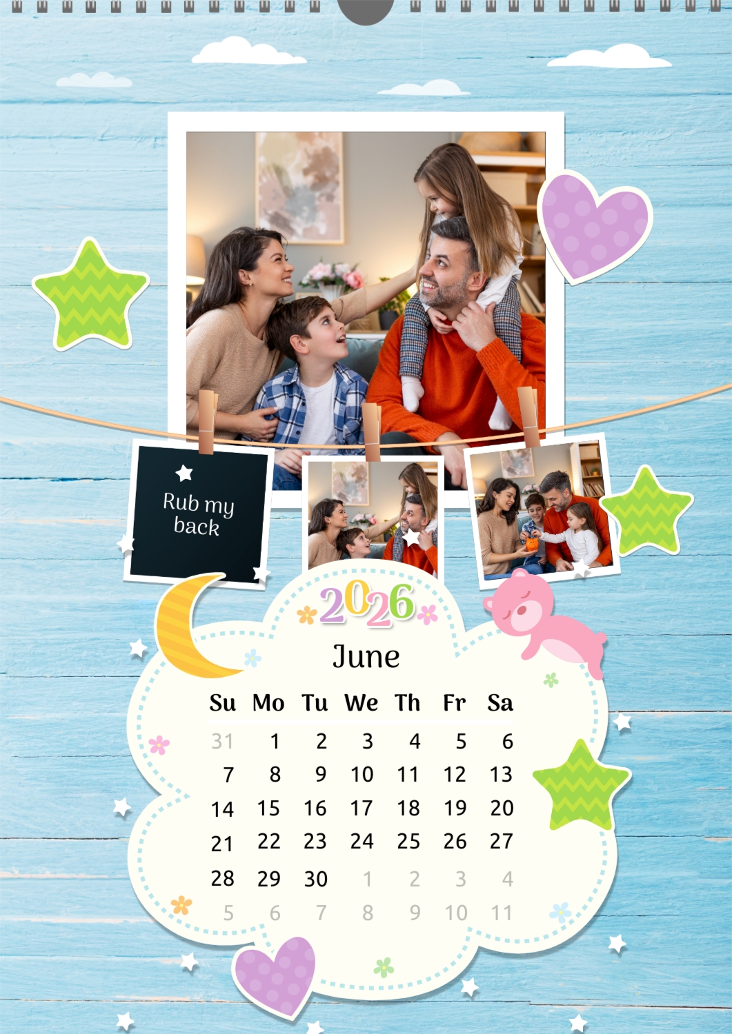 A Happy Family calendar template with clouds, stars, hearts, a teddy bear, and monthly tasks in a child-friendly style: small photos are hung on a string next to a large family photo.