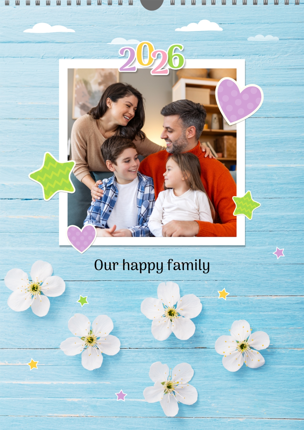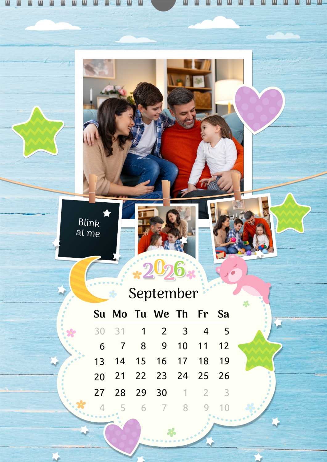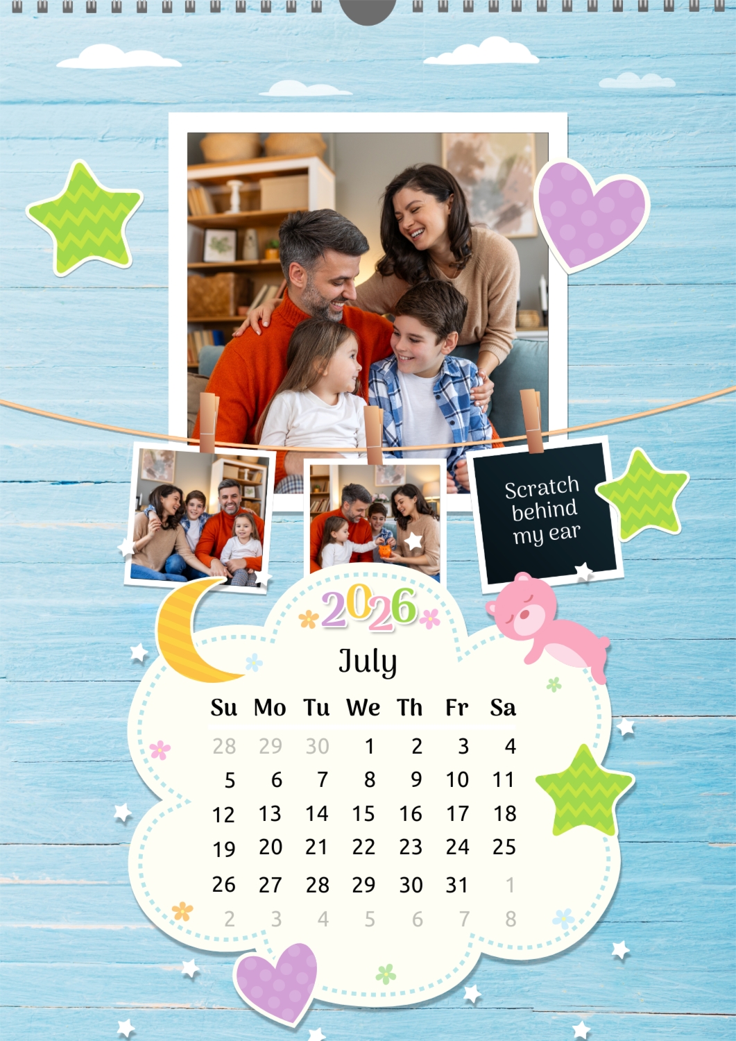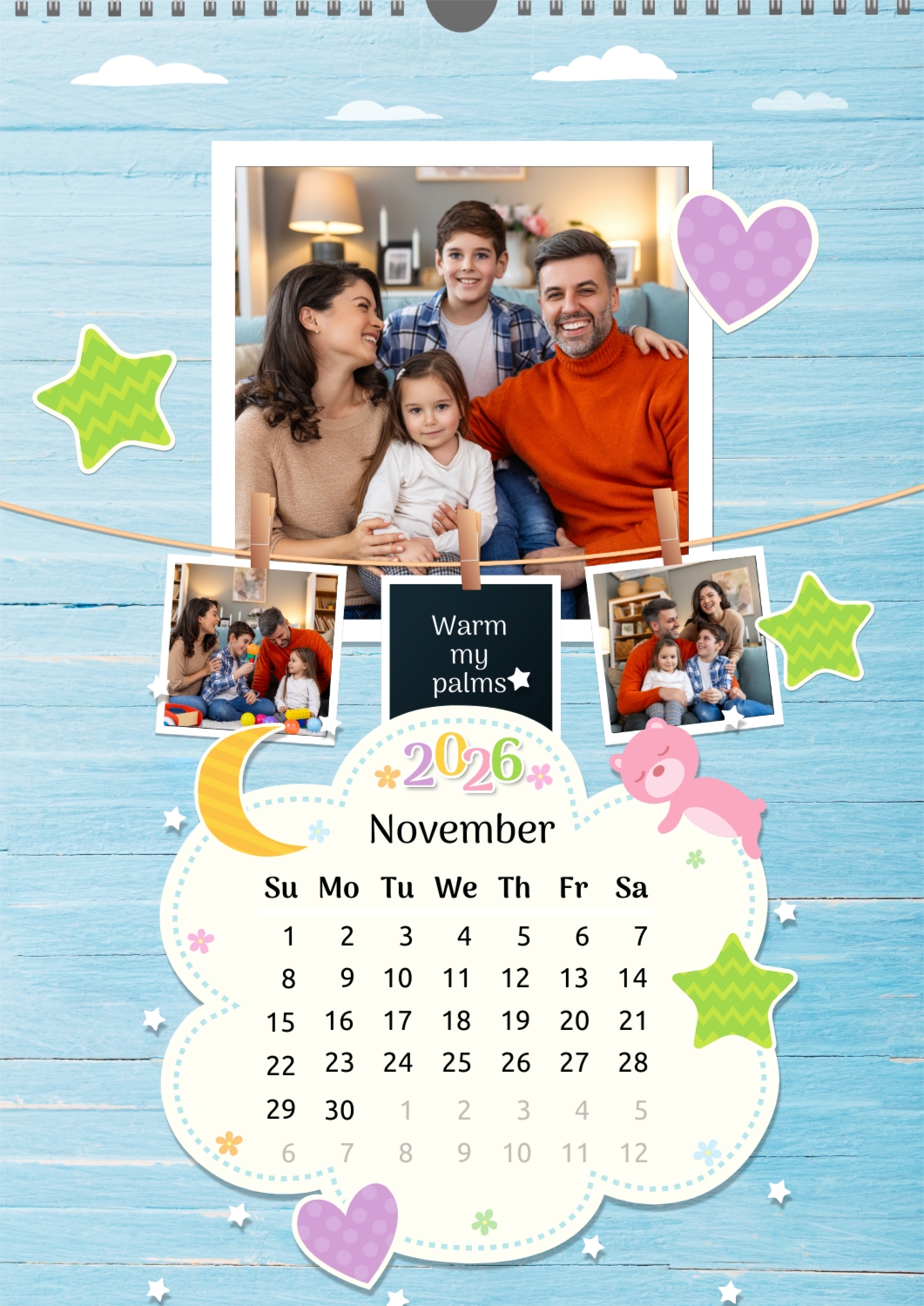 A Happy Family calendar template with clouds, stars, hearts, a teddy bear, and monthly tasks in a child-friendly style: small photos are hung on a string next to a large family photo.