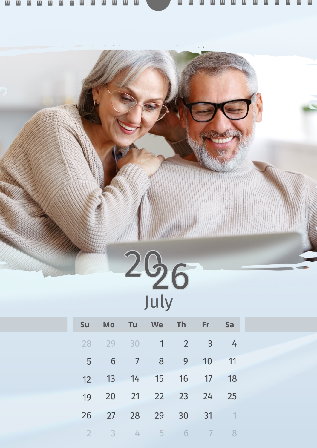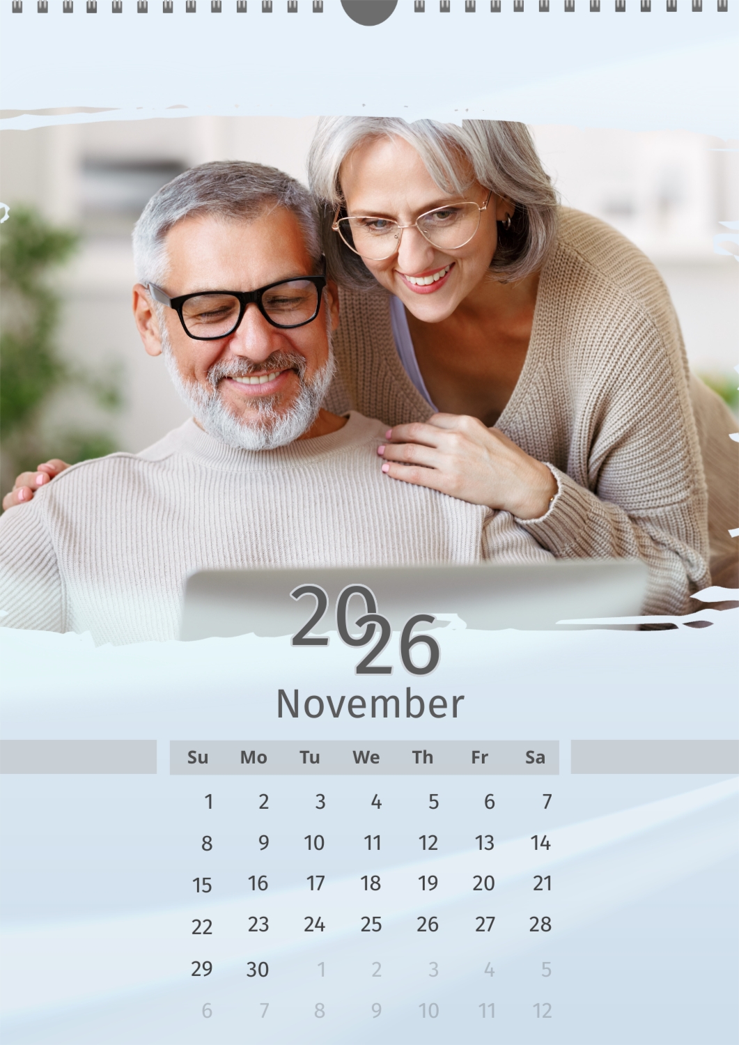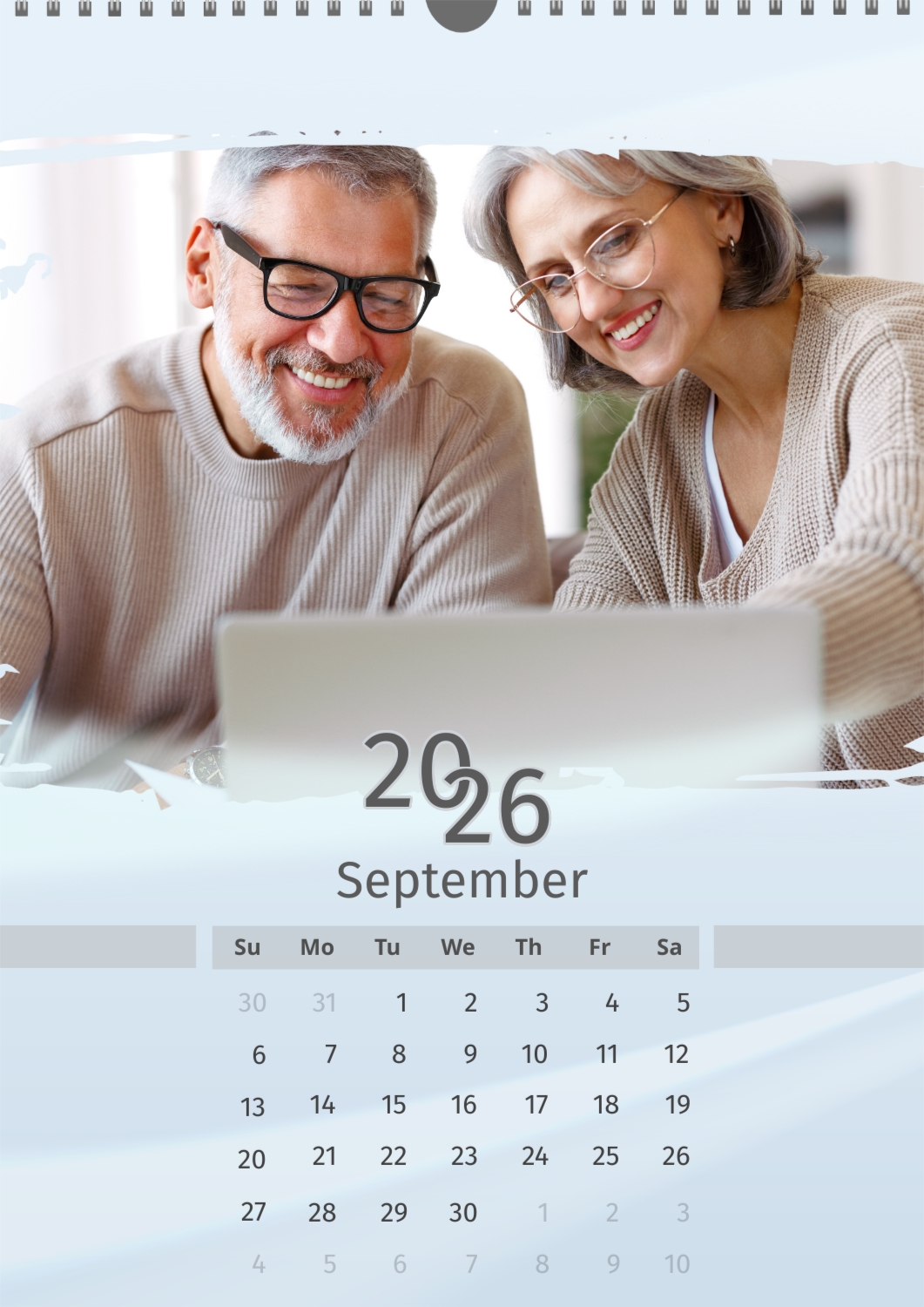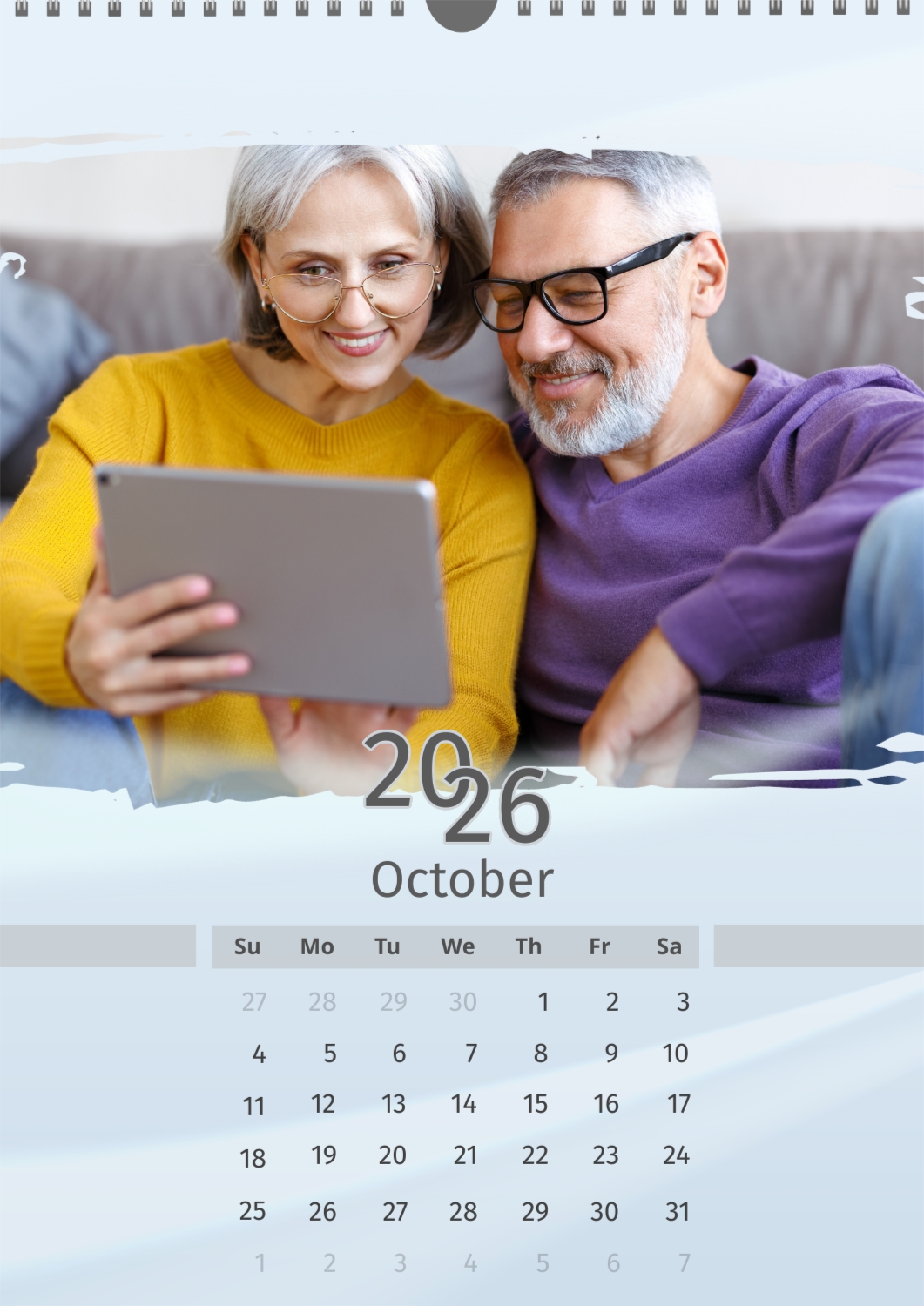 A light blue calendar template featuring an elderly couple. The photos are large and torn. The background is a soft pastel blue.