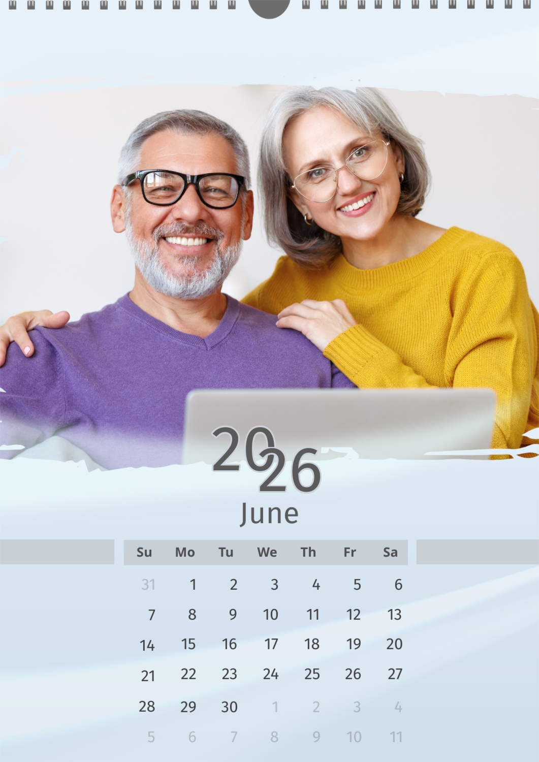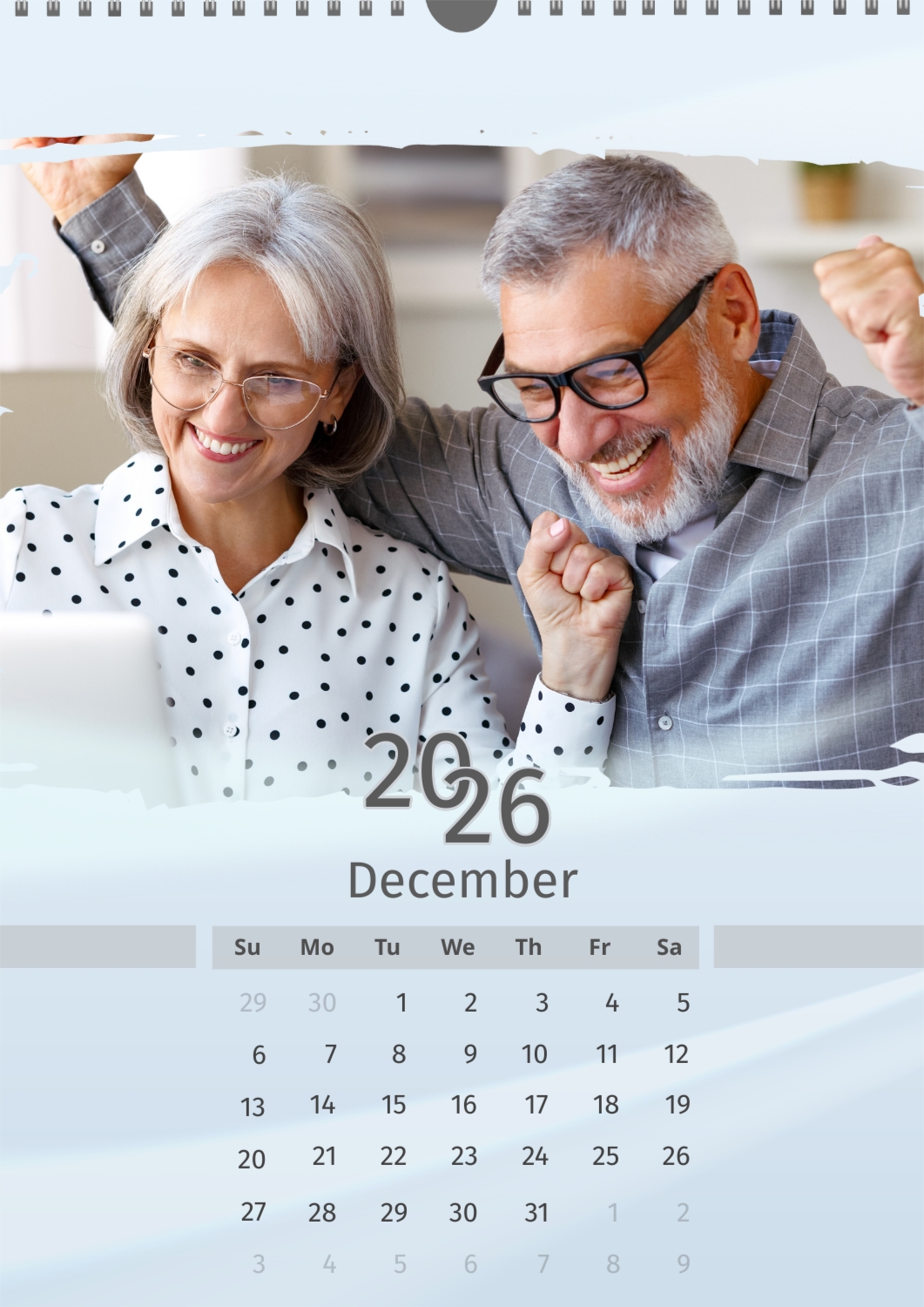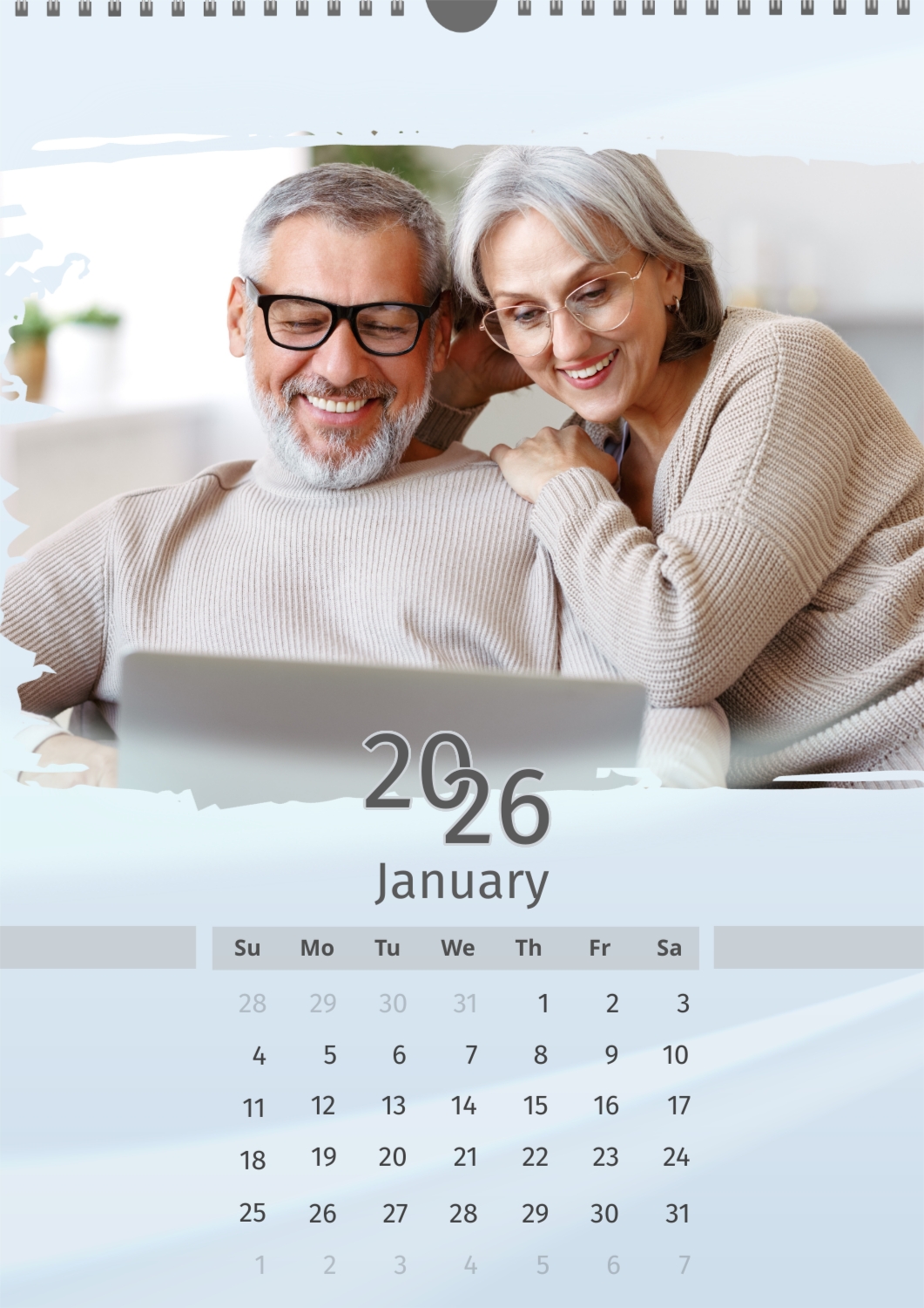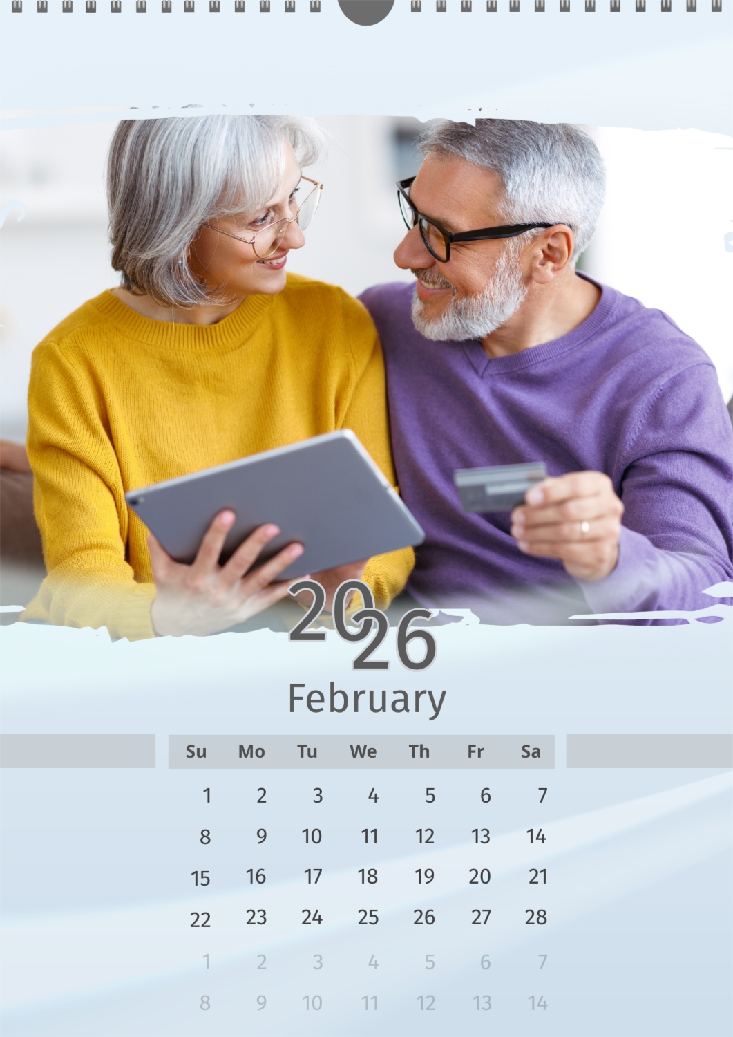 A light blue calendar template featuring an elderly couple. The photos are large and torn. The background is a soft pastel blue.