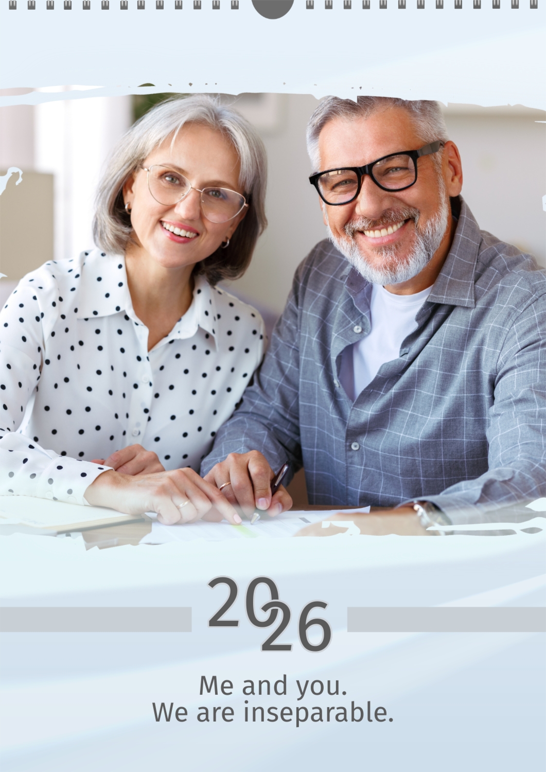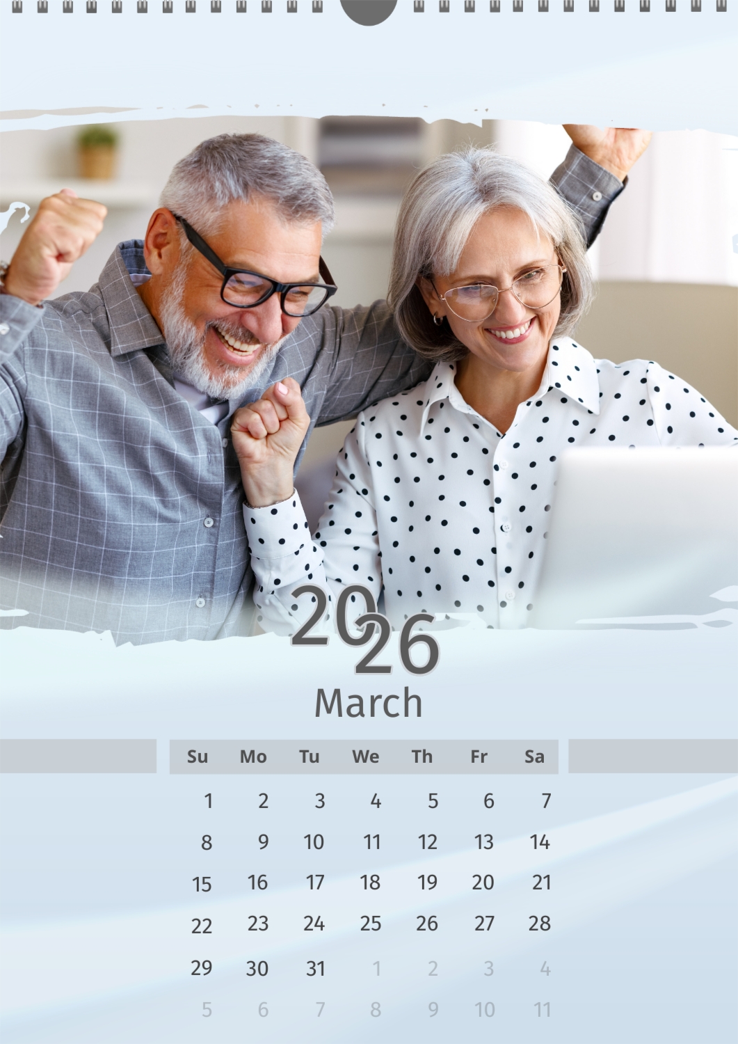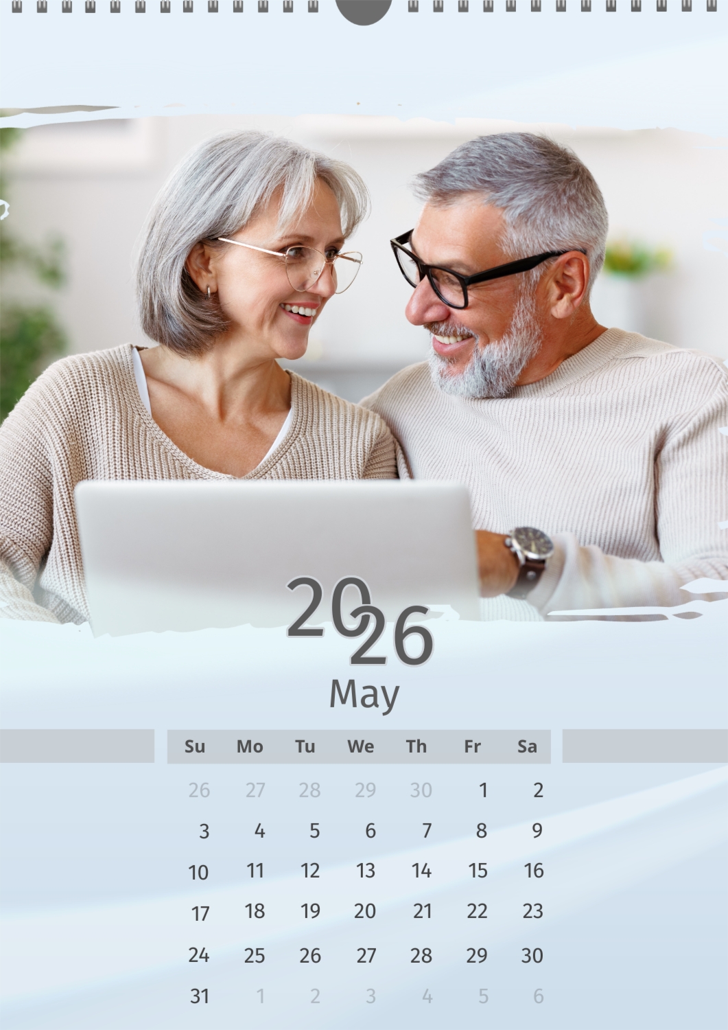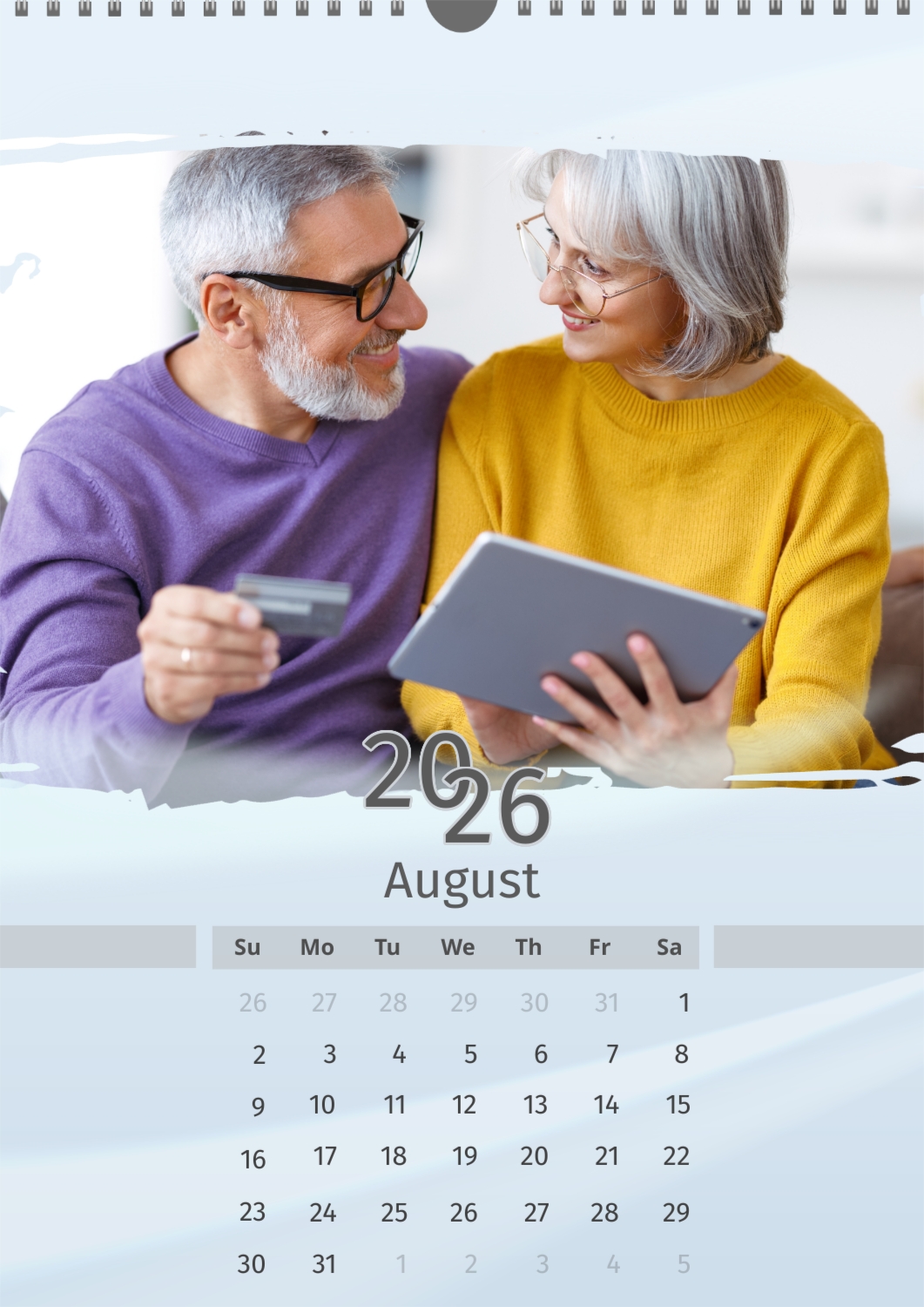 A light blue calendar template featuring an elderly couple. The photos are large and torn. The background is a soft pastel blue.