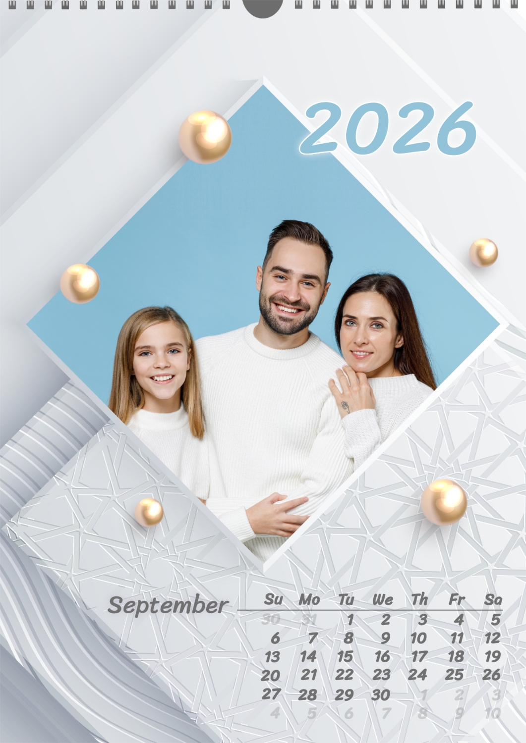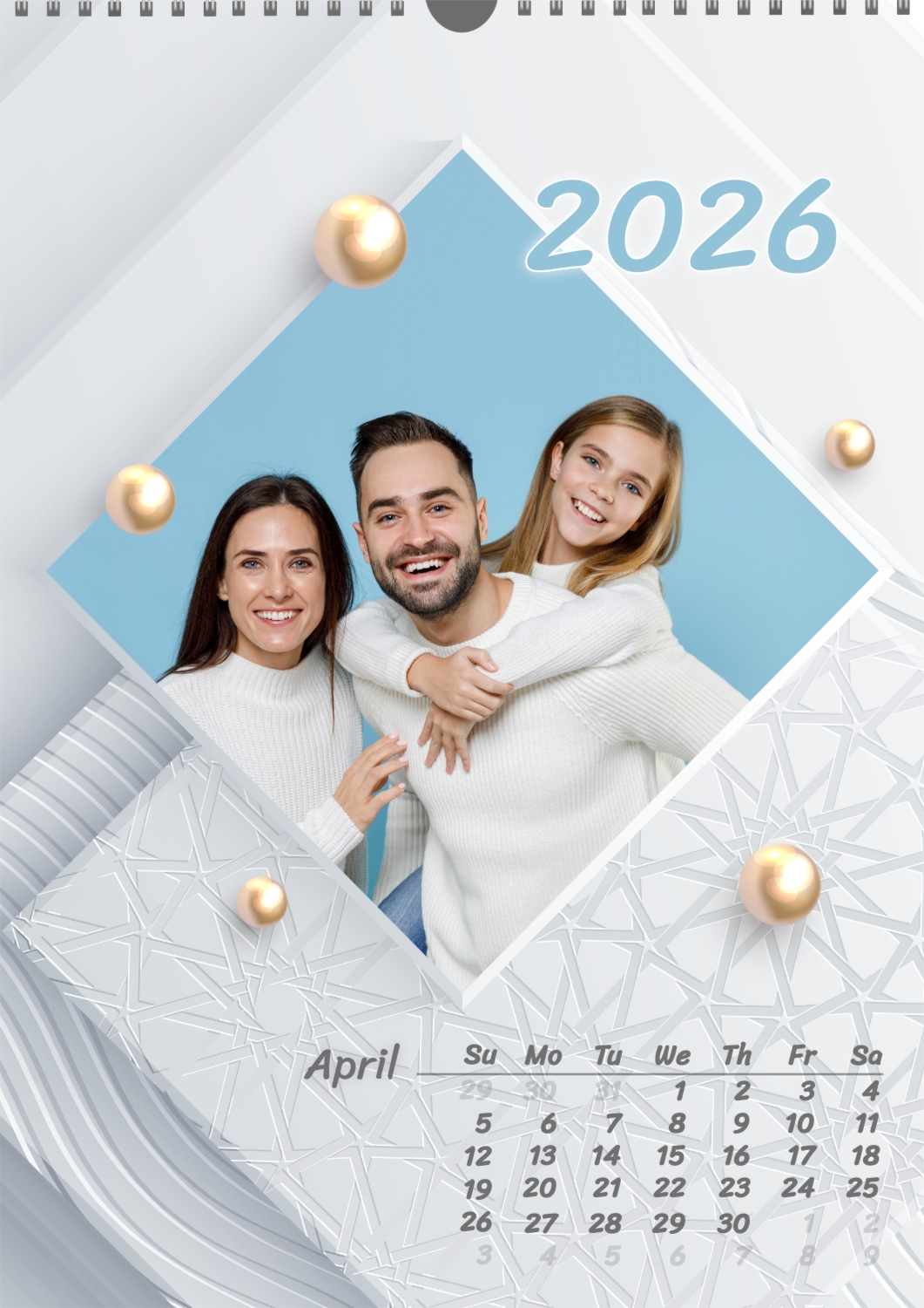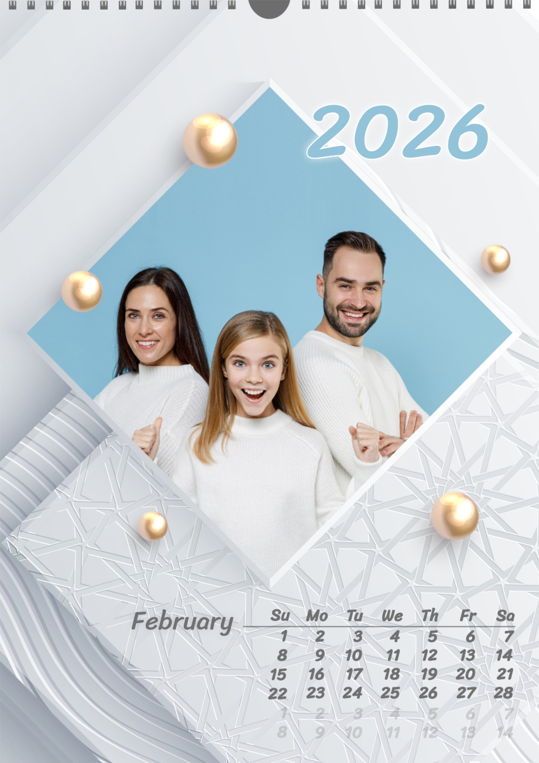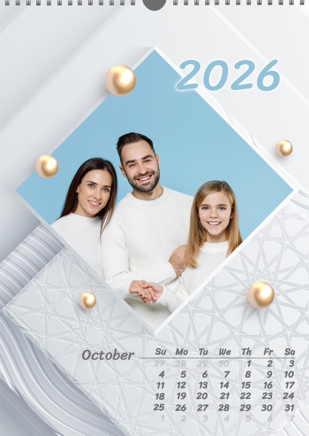 Calendar template with family photos. Square photographs of a happy family on a light background with patterns and yellow pearls.