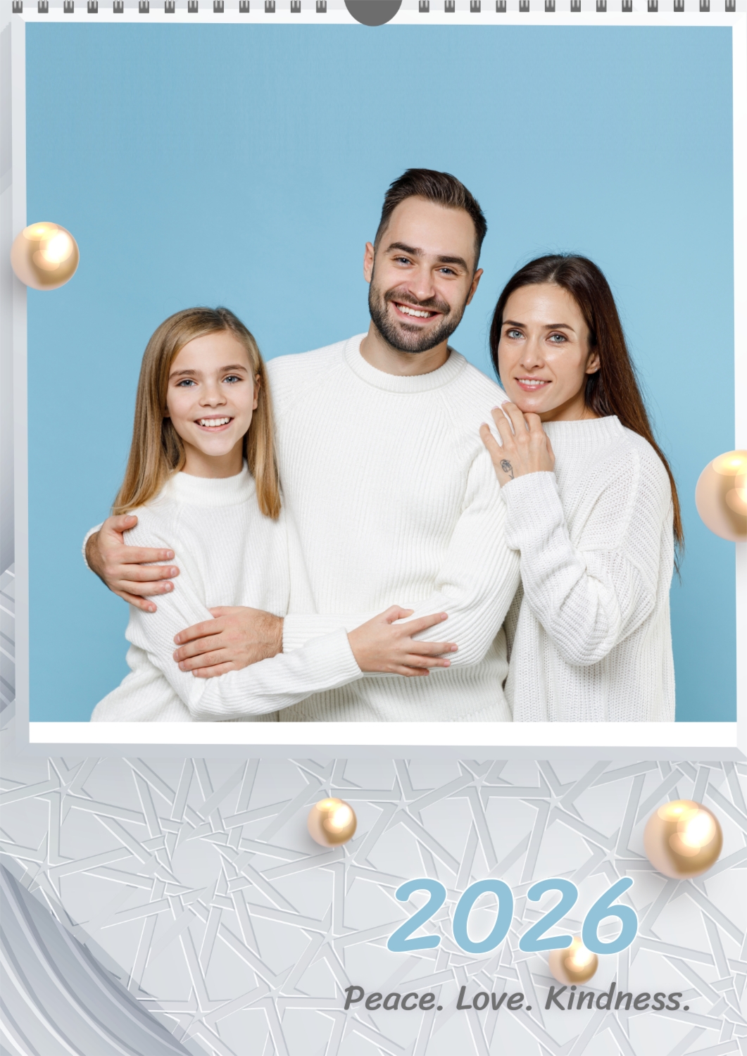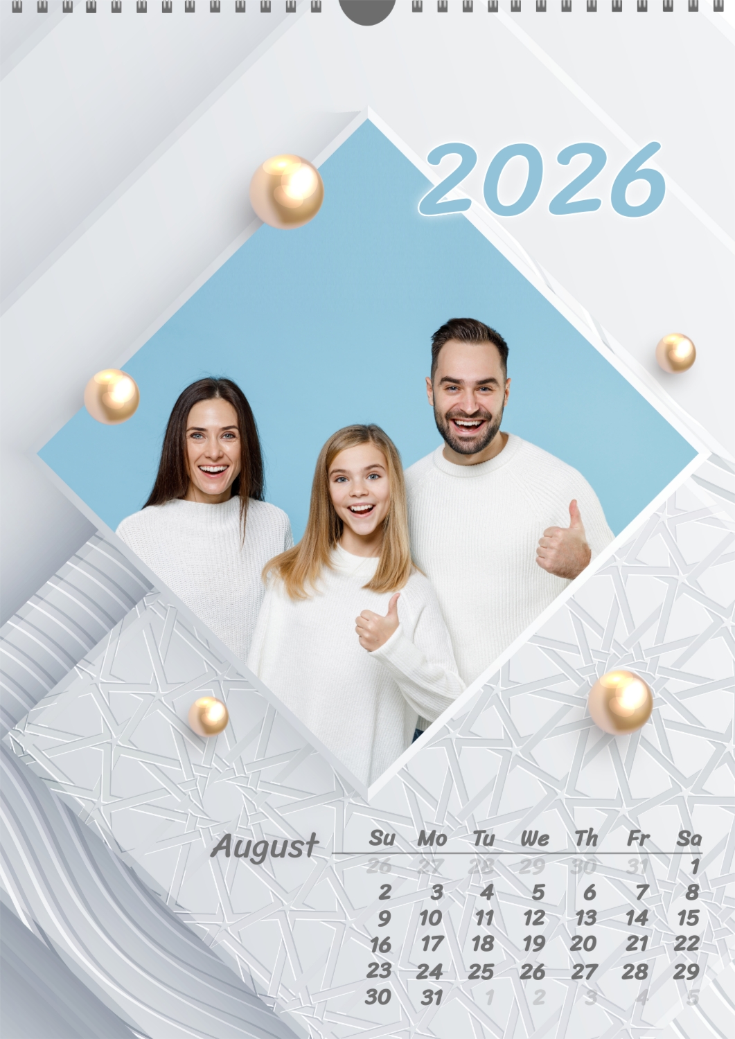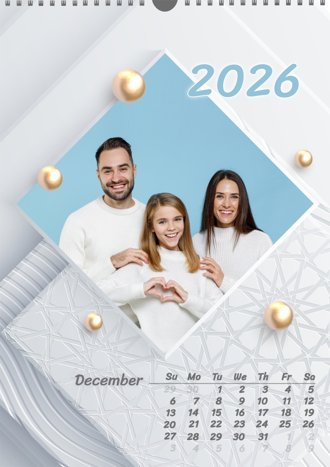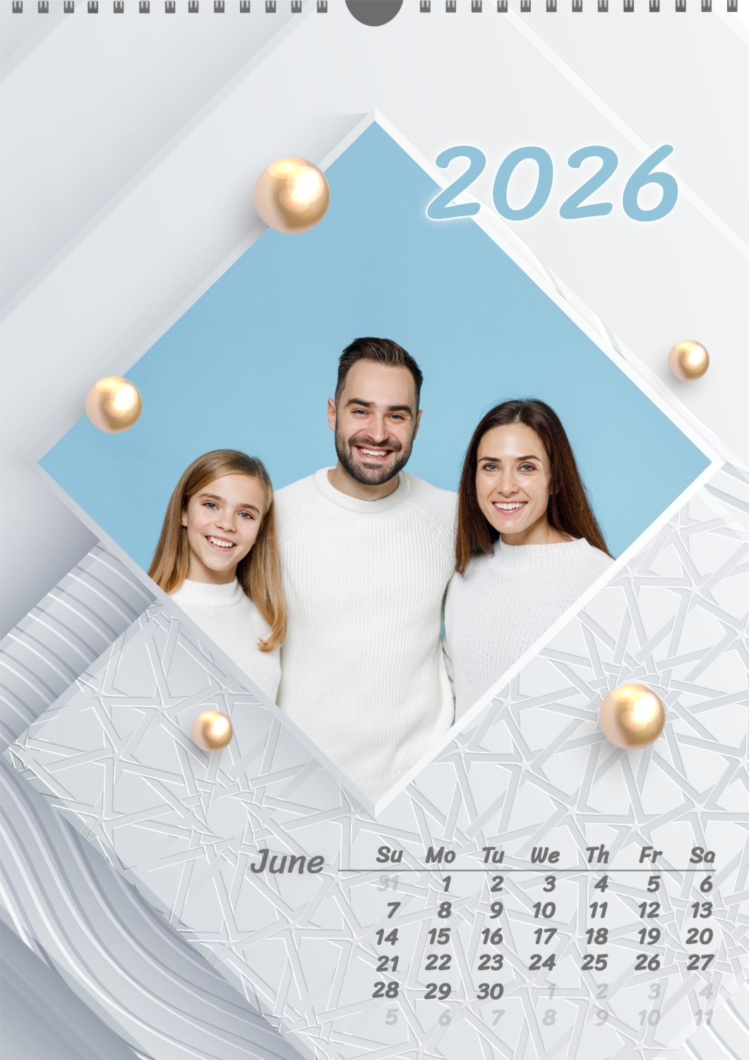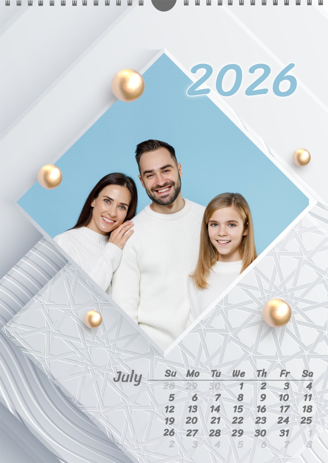 Calendar template with family photos. Square photographs of a happy family on a light background with patterns and yellow pearls.