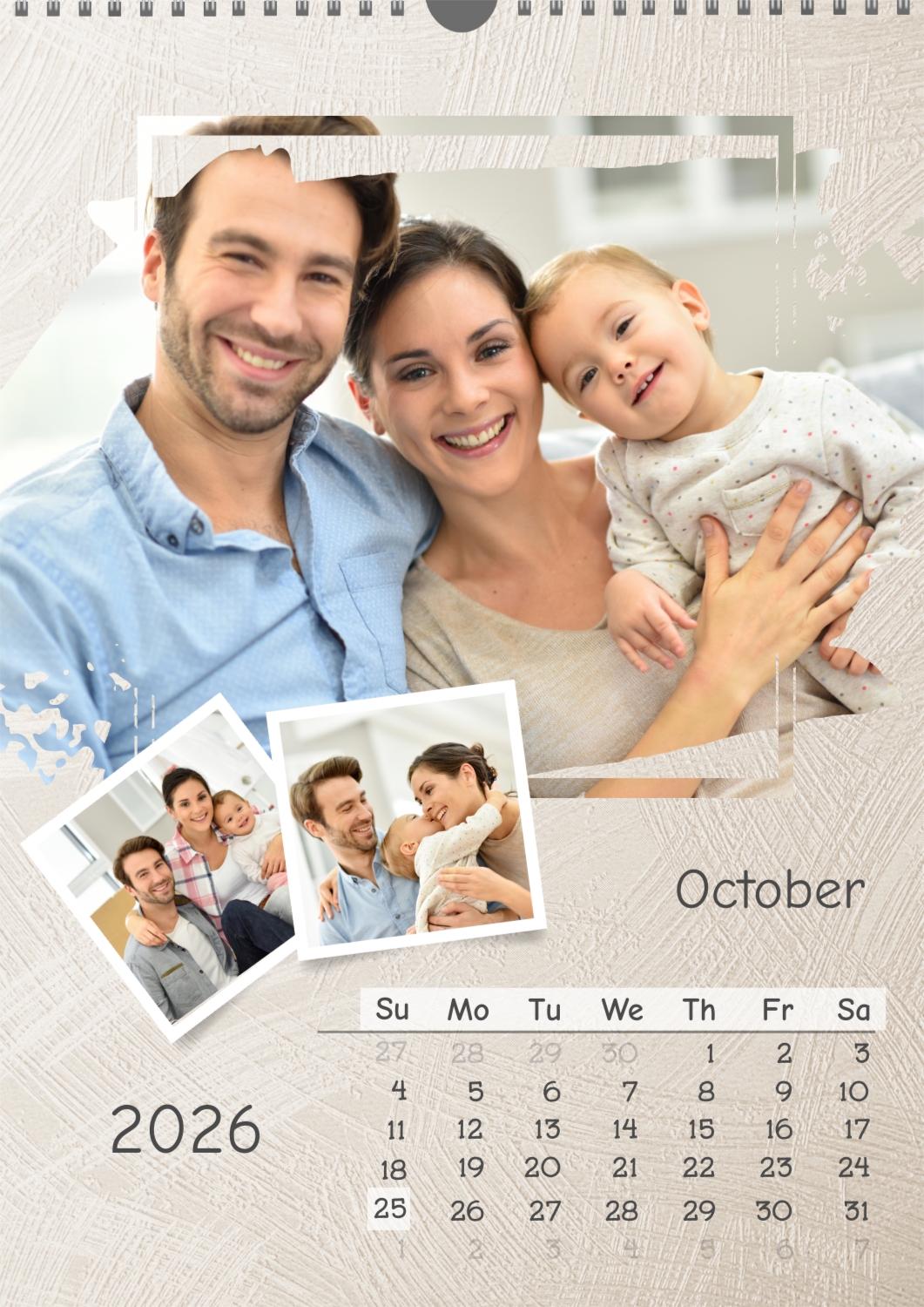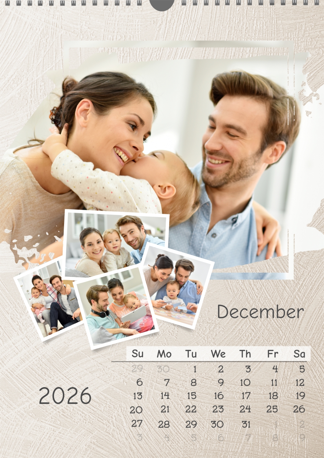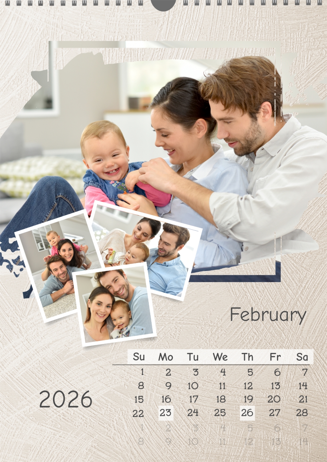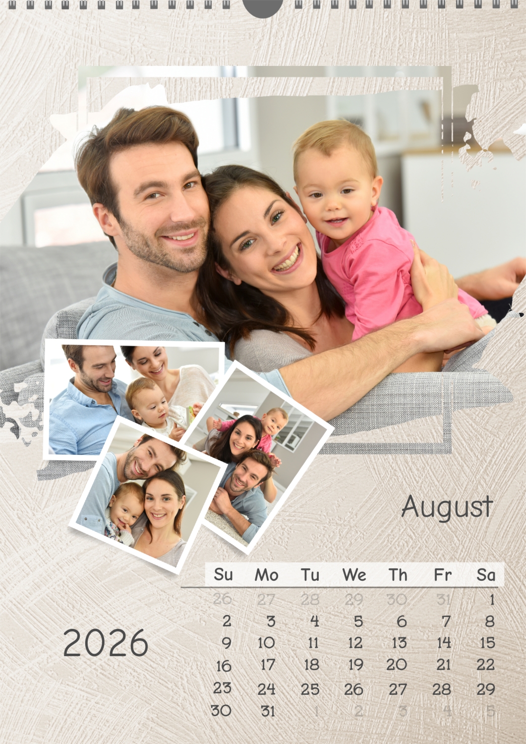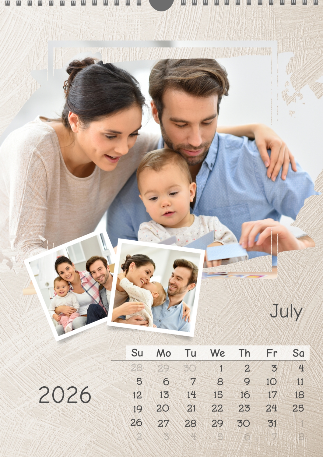 A calendar template for your family with multiple photos per sheet, with a light textured background from brush painting. Important family dates are highlighted on the calendar grid.