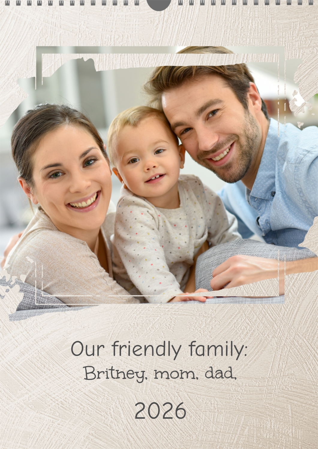 The best family calendar template with daughter with light rays and colorful light spots: large tilted photos in a frame with brush strokes. | ID243472