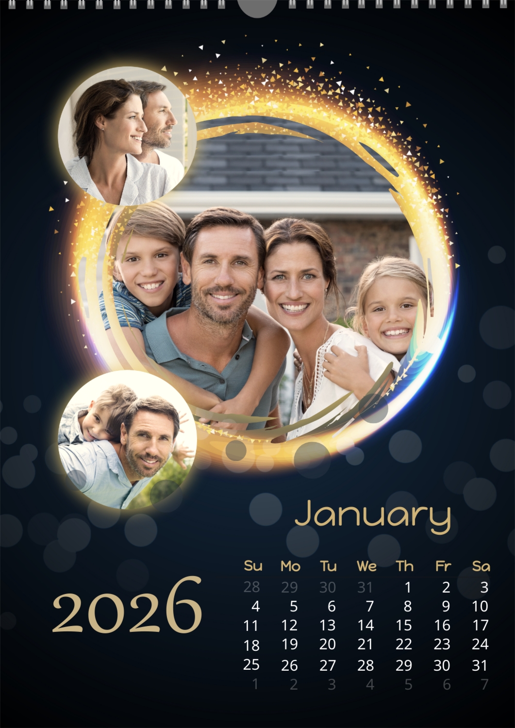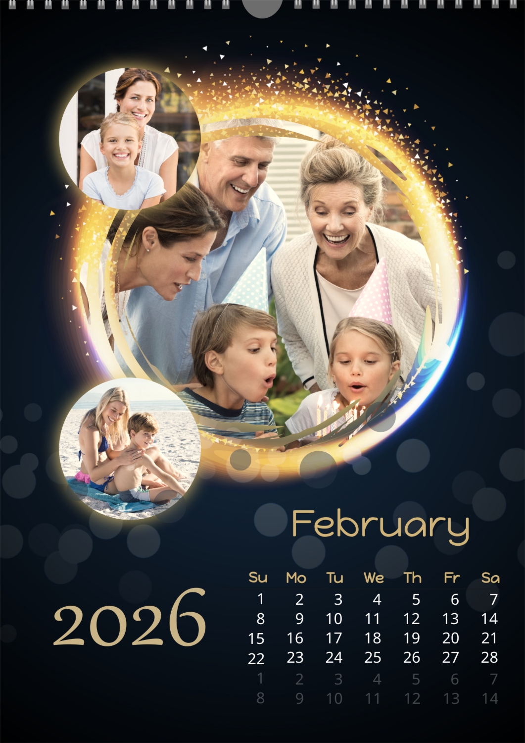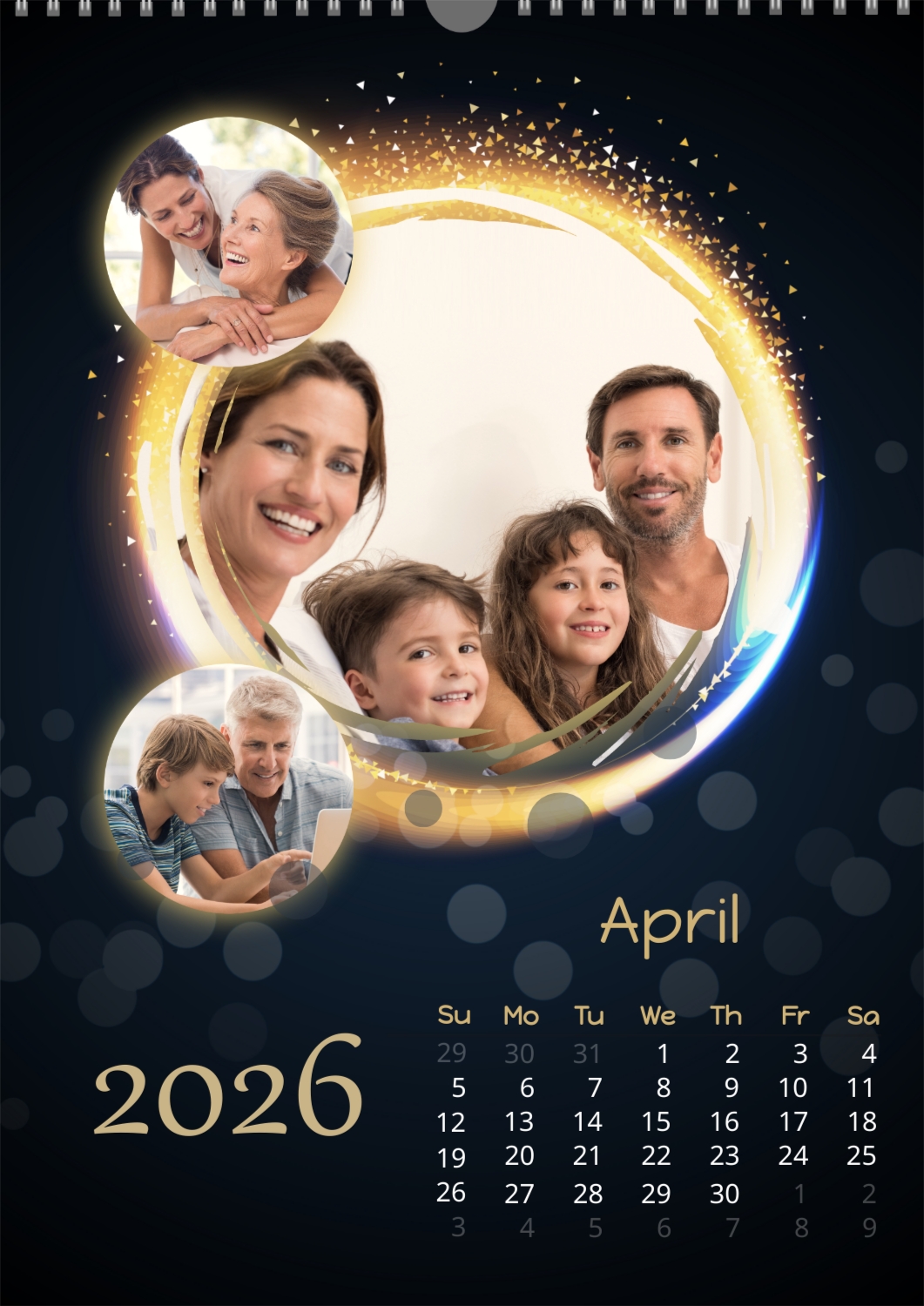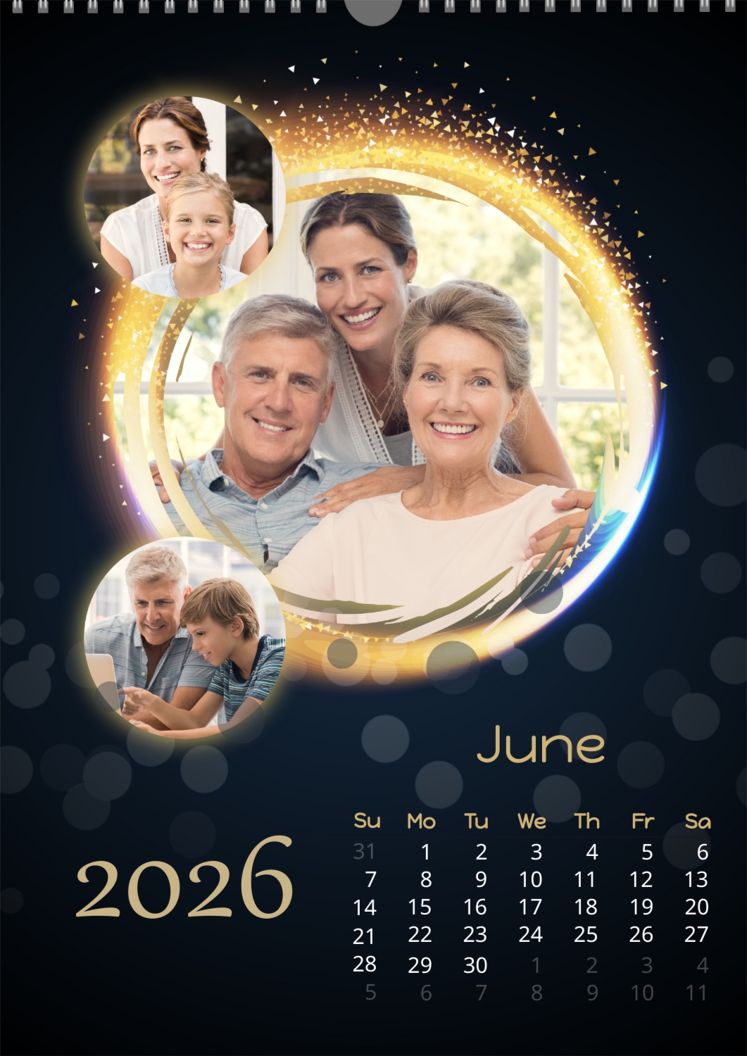 Calendar template with family photos. Family photos on a glowing ball with bokeh.