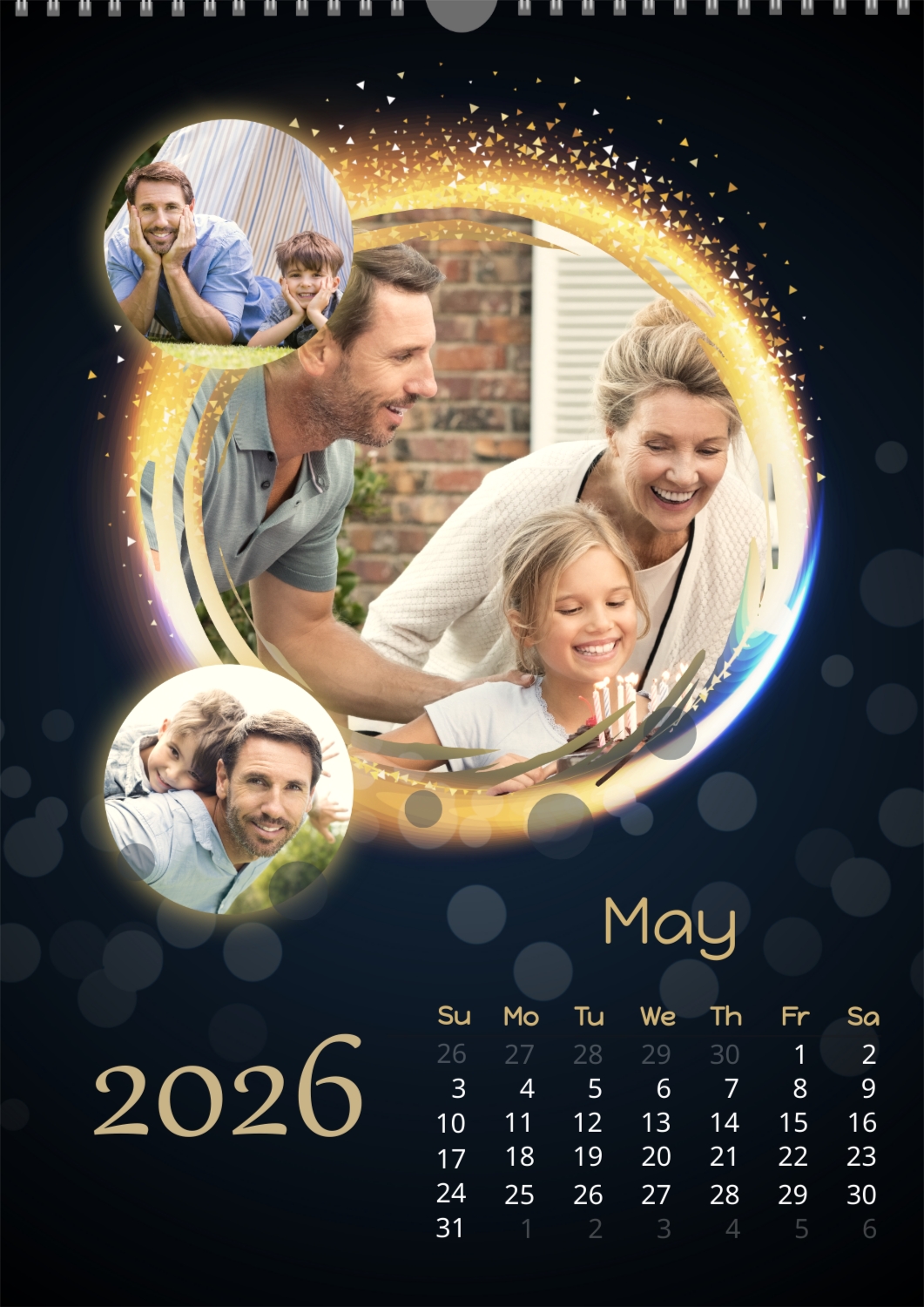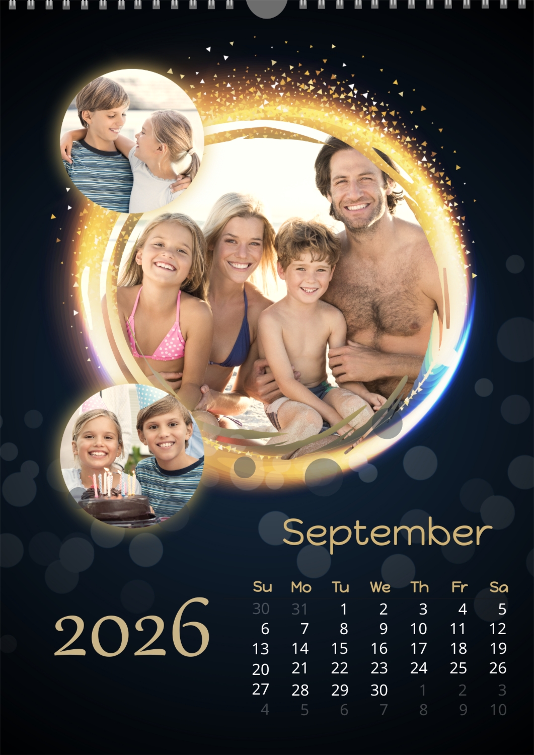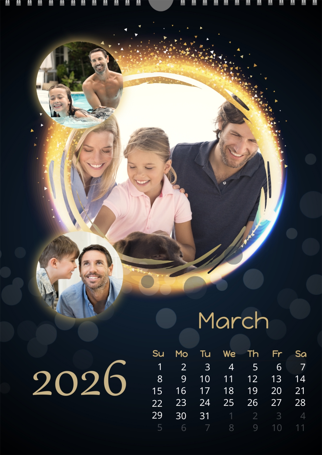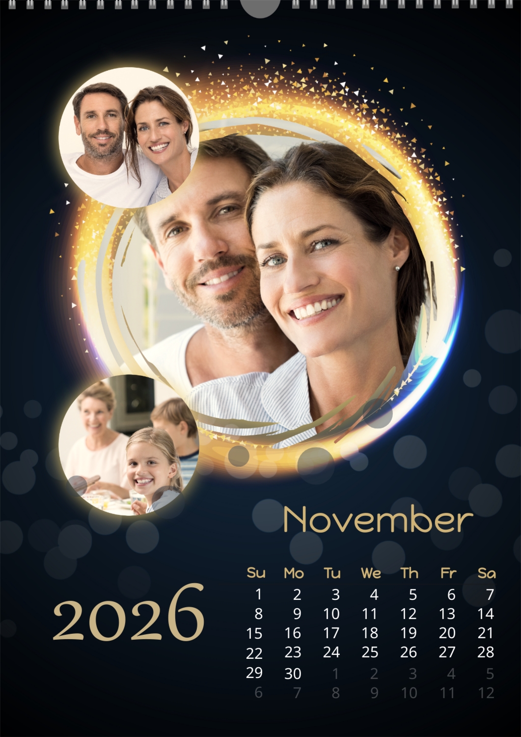 Calendar template with family photos. Family photos on a glowing ball with bokeh.