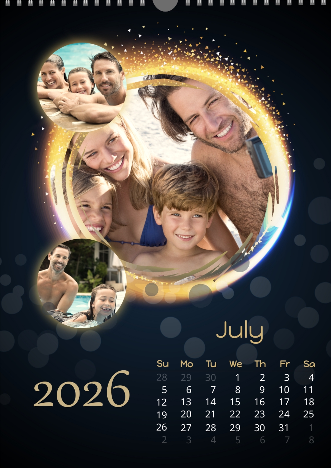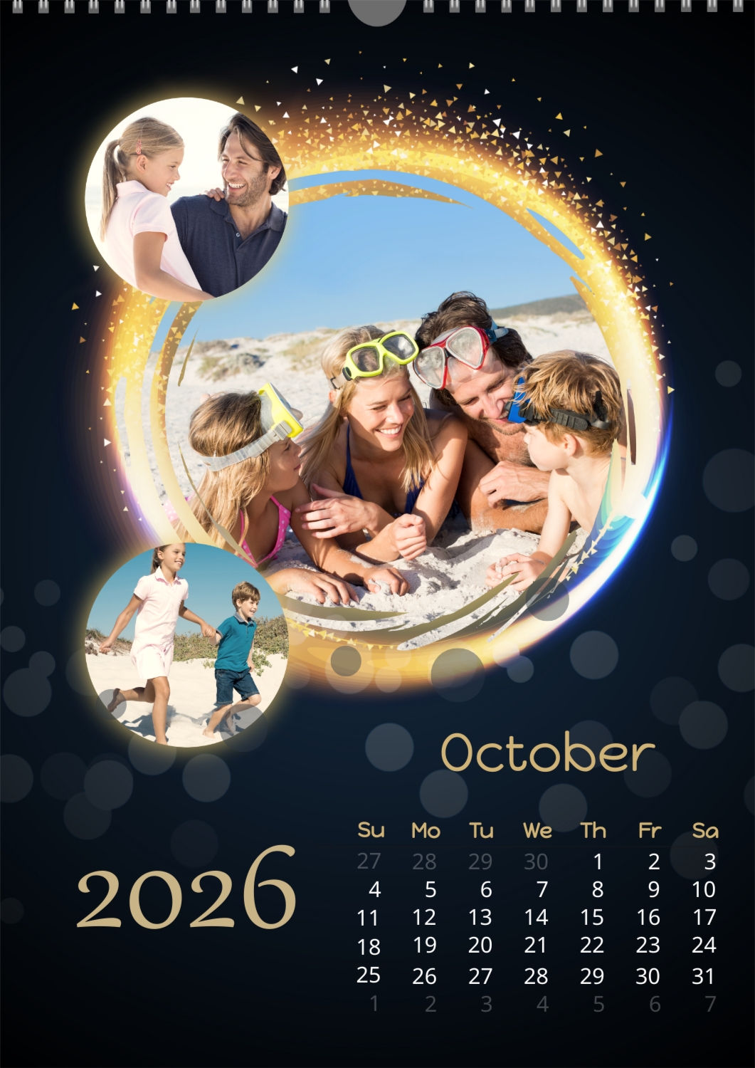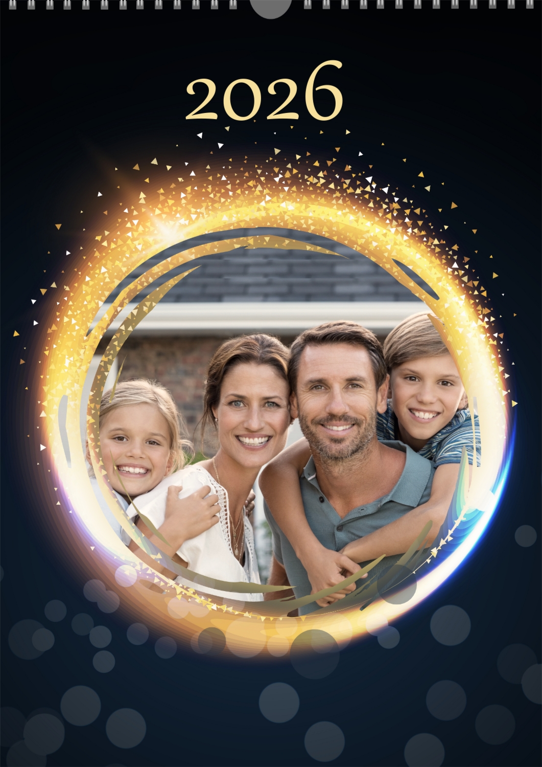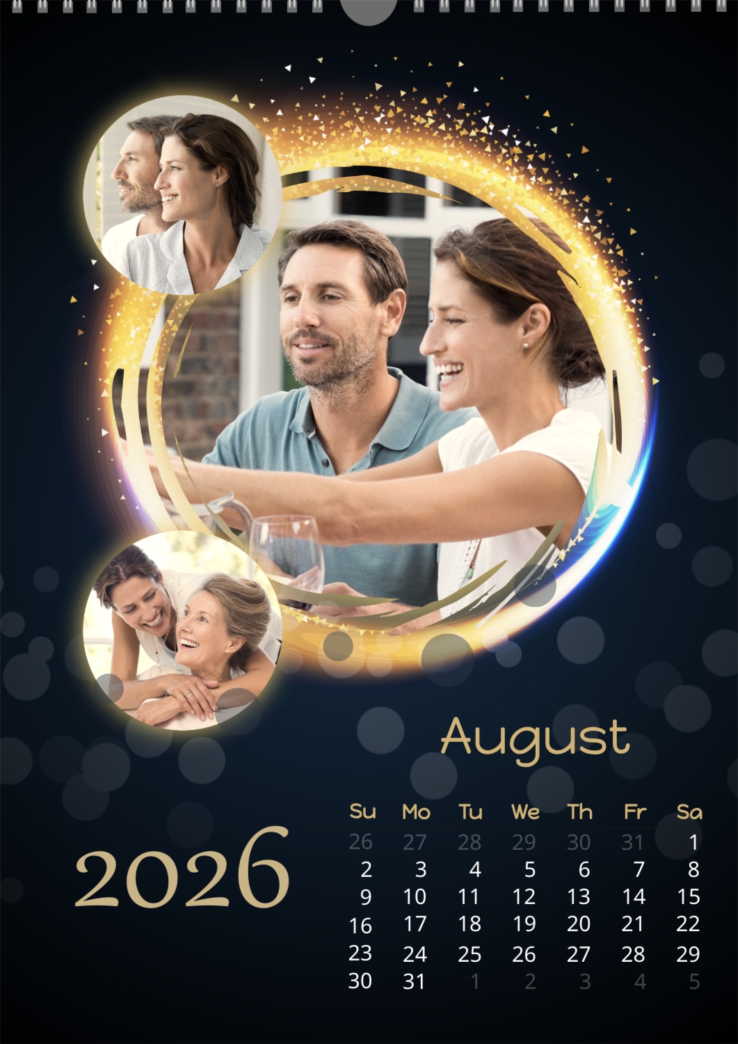 Calendar template with family photos. Family photos on a glowing ball with bokeh.