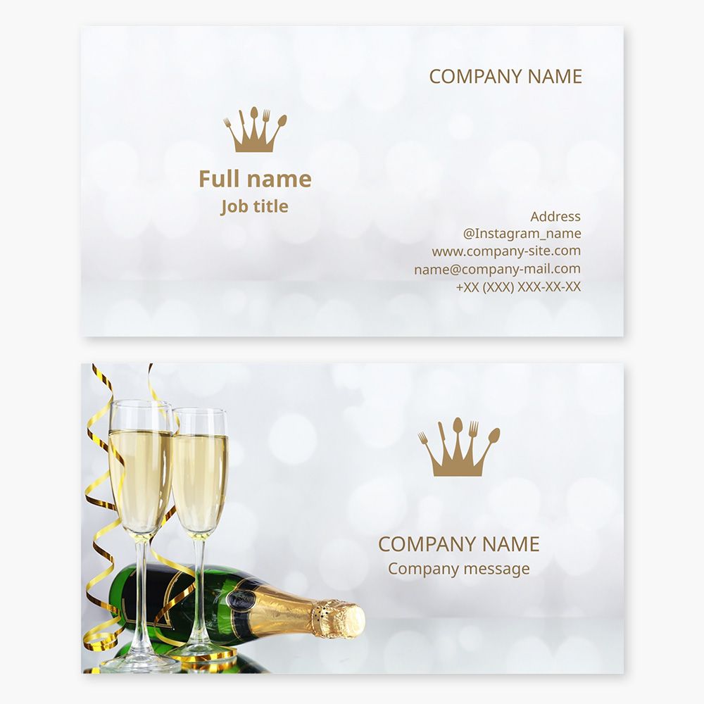 Restaurant business card template. Crown with cutlery. Champagne, glasses, and streamers.