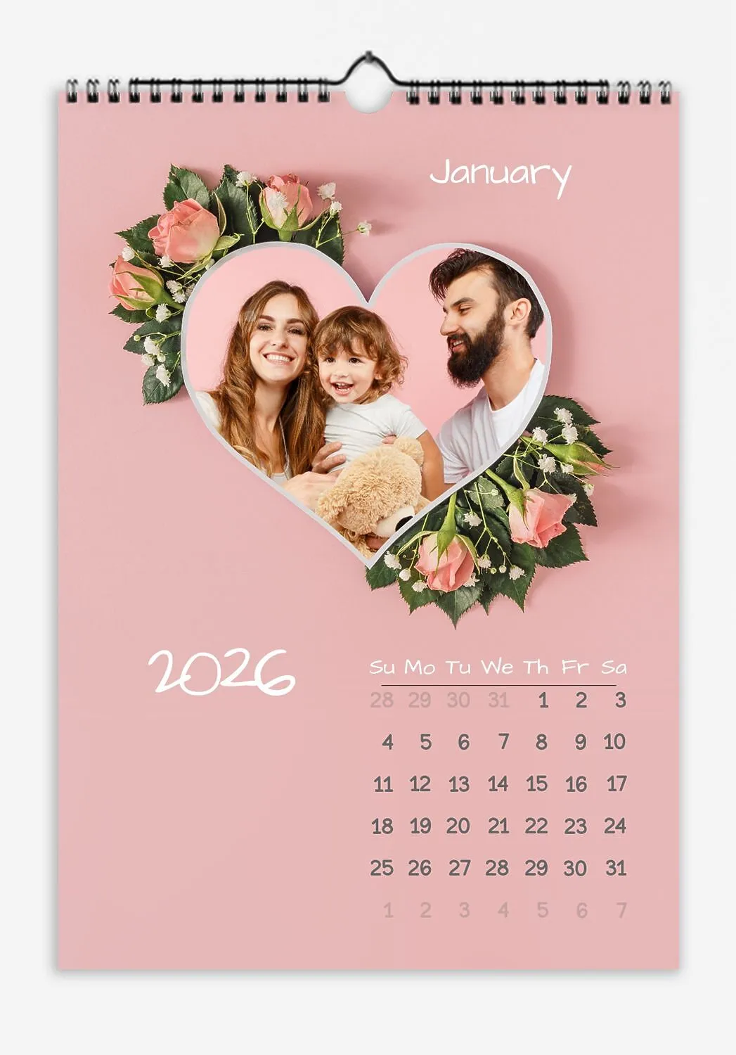 Pink Floral Wall Calendar With Family Photos. Photos of a happy family in a heart.
