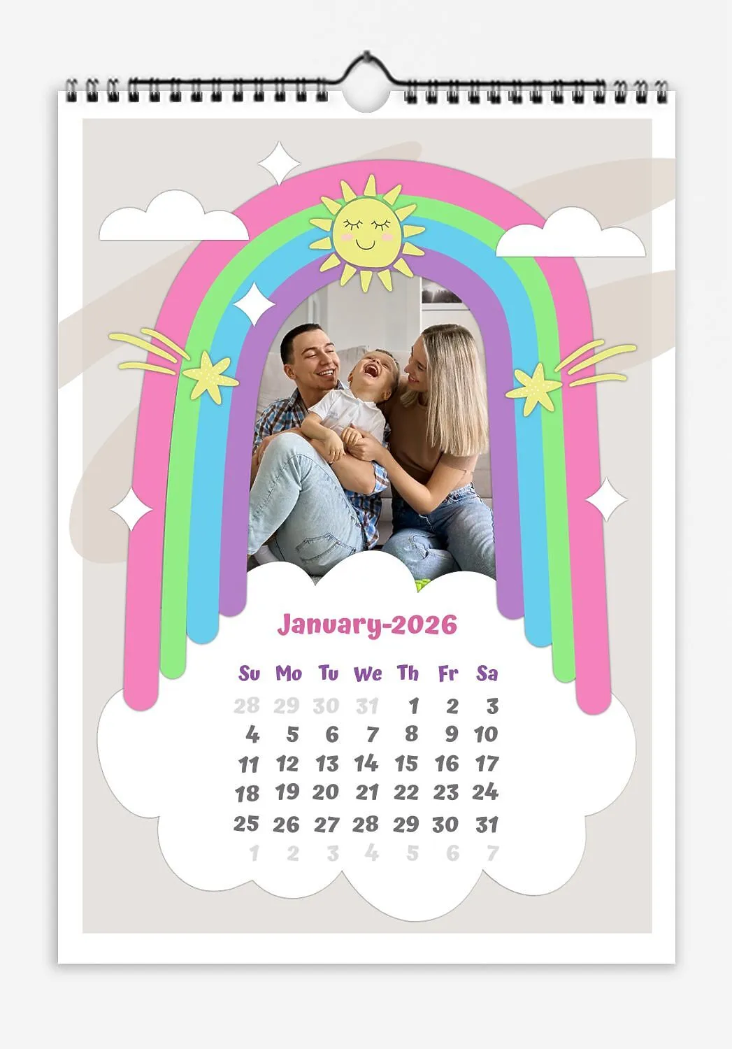 A calendar template featuring a happy family with a son under a rainbow in a cartoon style with the sun, clouds, comets, and stars. Children's fonts.